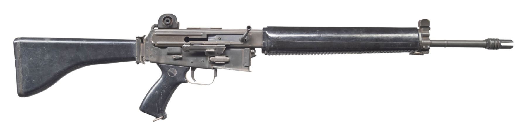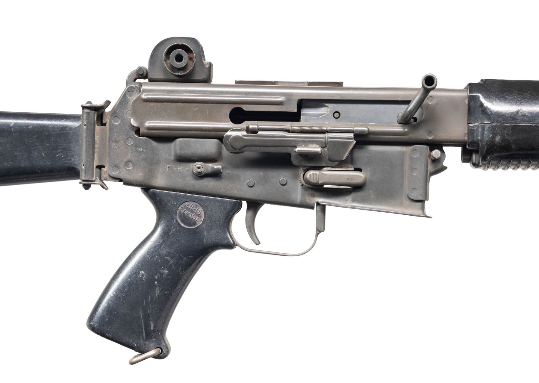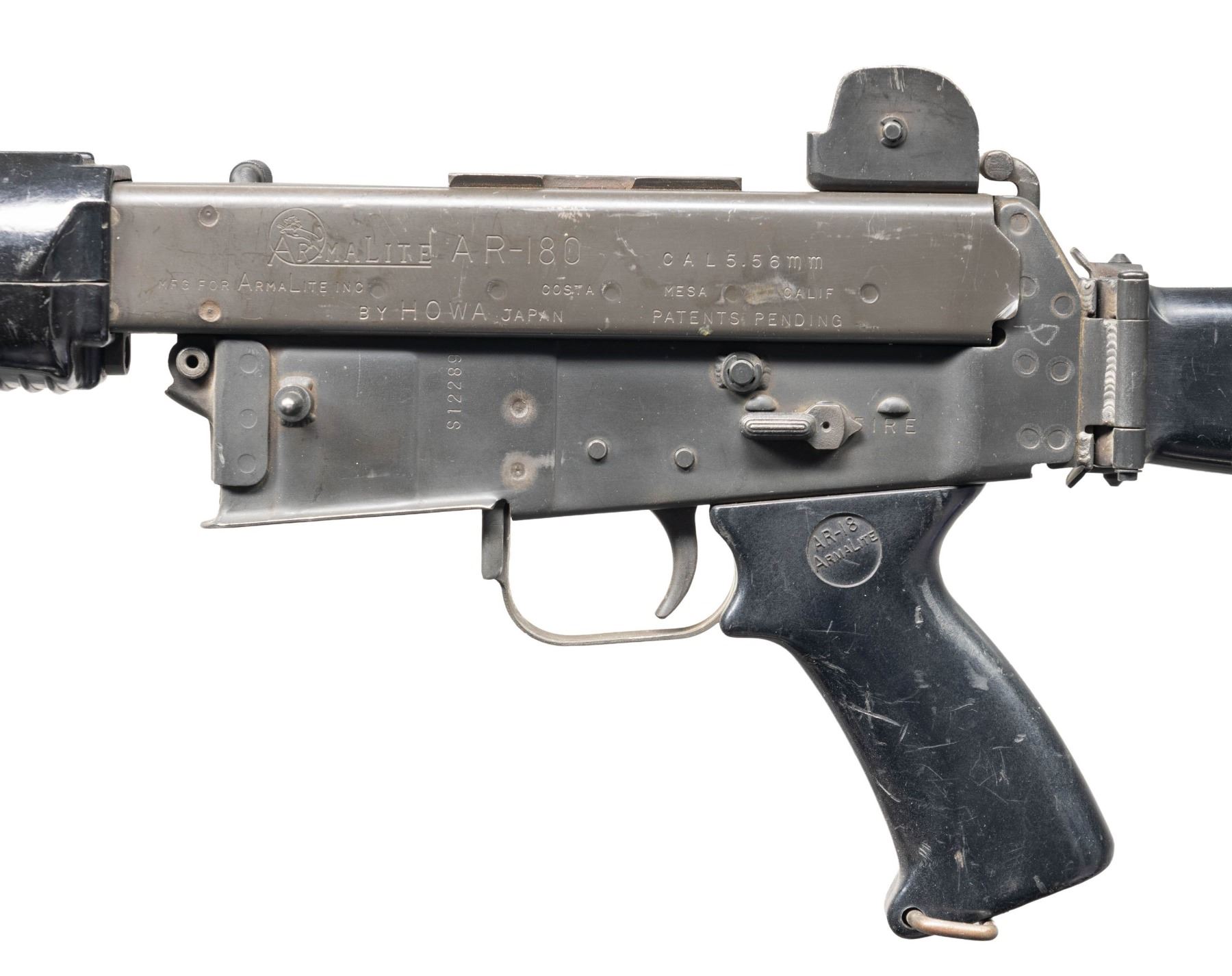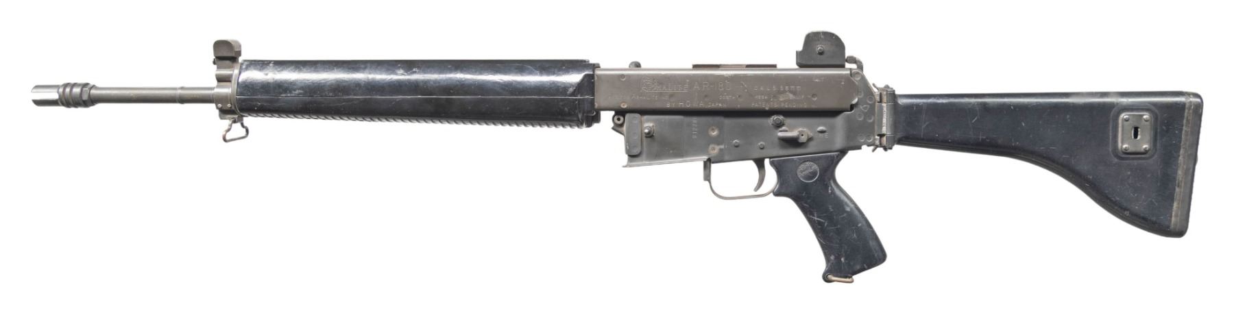 RIFLE. Cal. 5.56mm. S# S12289. Bbl. 18". 1 of only approx. 3,900 AR-180 semi-automatic rifles mfg. in Japan by Howa and imported by Armalite. Left side of the upper is marked with the Armalite logo, followed by the model and cal. designations above "MFG FOR ARMALITE INC COSTA MESA CALIF/ BY HOWA JAPAN PATENTS PENDING". Receiver is marked with the S# "S12289", with research indicating that this was likely one of the last AR-180 rifles produced by Howa. Metal components exhibit a phosphate finish overall, save for on the bolt, charging handle, and 3-prong flash hider, which exhibit a blue finish. 2-piece ventilated black synthetic handguard, pistol grip, and side-folding buttstock. Standard AR-180 post front sight / piston tower (with integral bayonet lug) and 2-position dual aperture rear sight graduated "200" and "400". Mag. is absent. CONDITION: metal components retain the majority of their original factory finishes, exhibiting scattered superficial handling marks and scratches (predominately on the left side of the upper), with some scattered spots of light surface oxidation. Bore is bright, exhibiting areas of mild to moderate pitting towards the muzzle, while retaining strong rifling throughout. Black synthetic furniture shows scattered marks and scratches from handling and storage, but otherwise remains sound. PROVENANCE: Lifelong Collection of Terrence McCarty. (24-89/MLW). CURIO. $1,000-1,500.