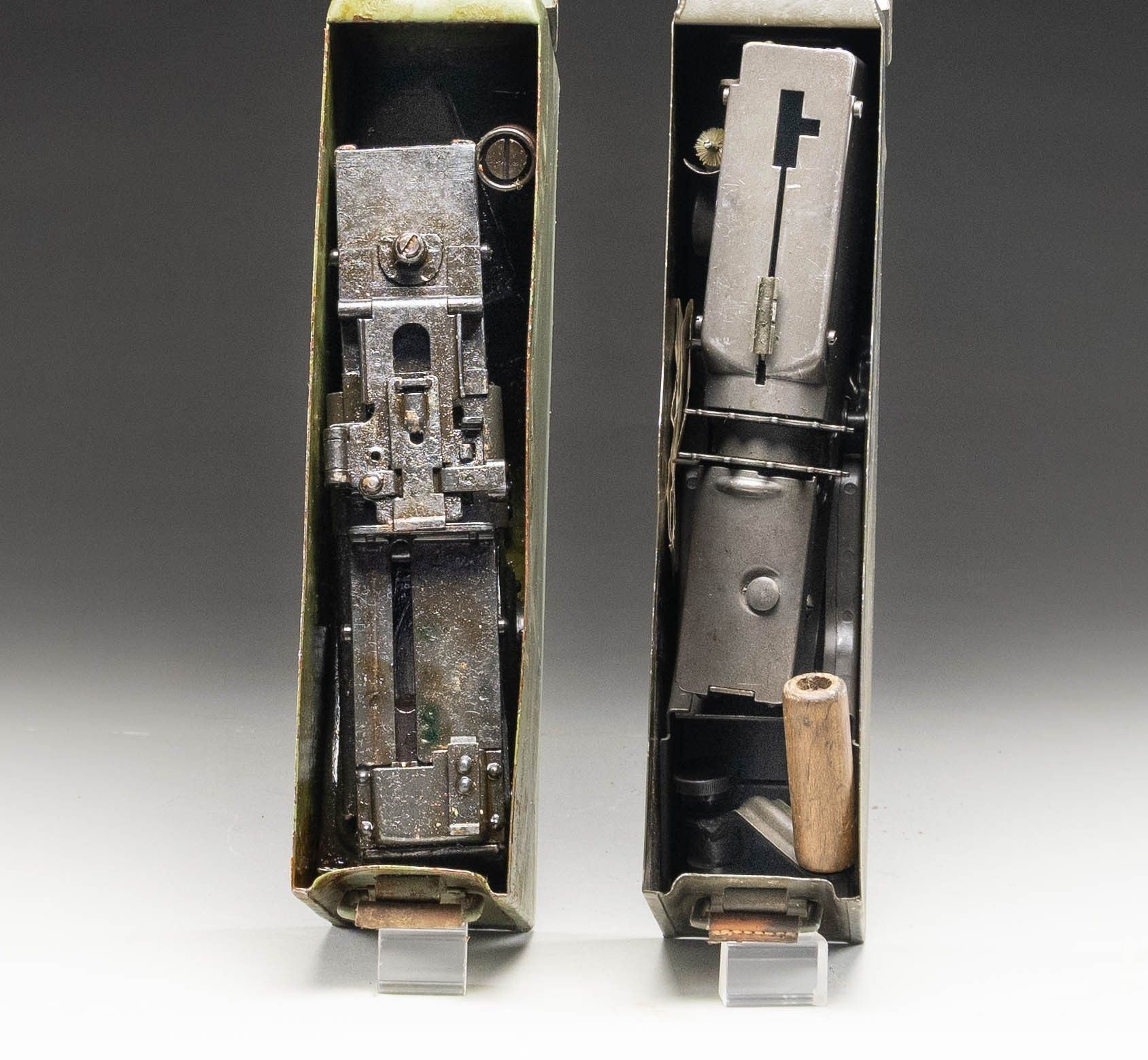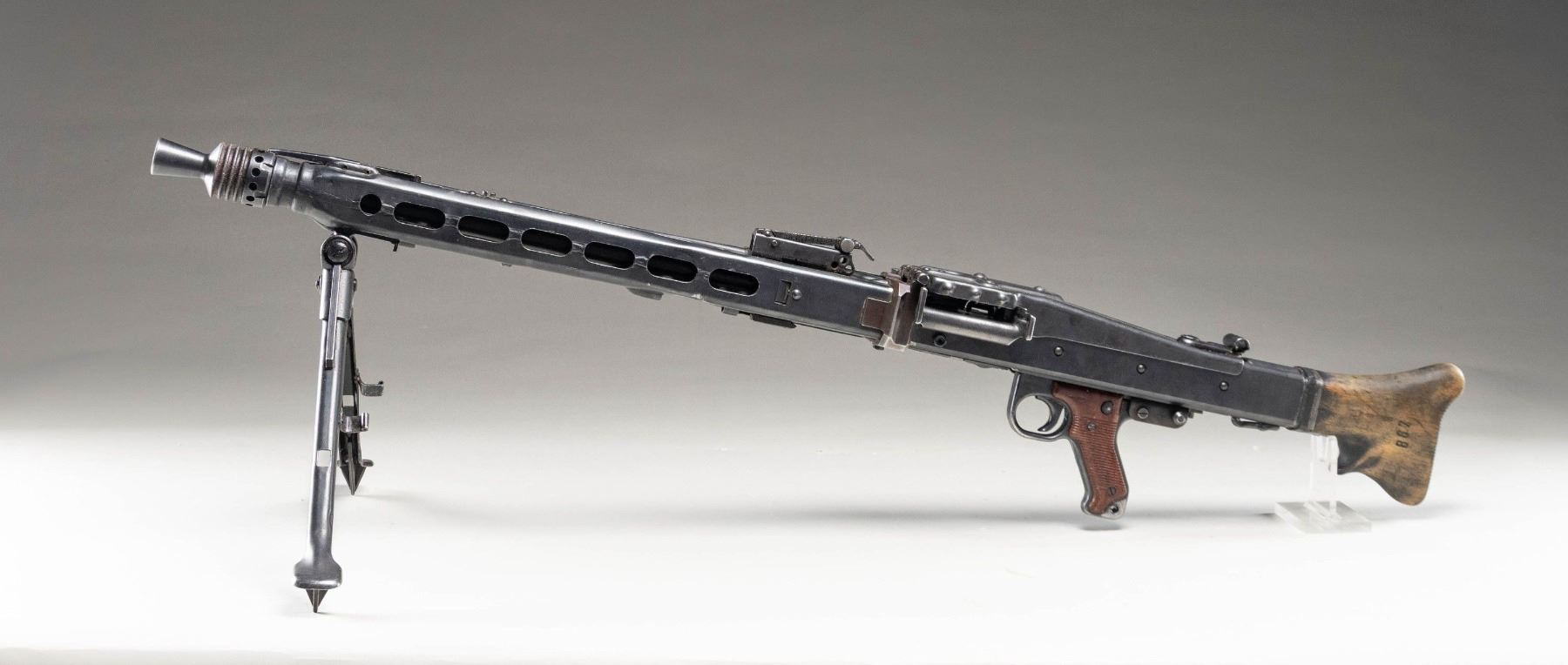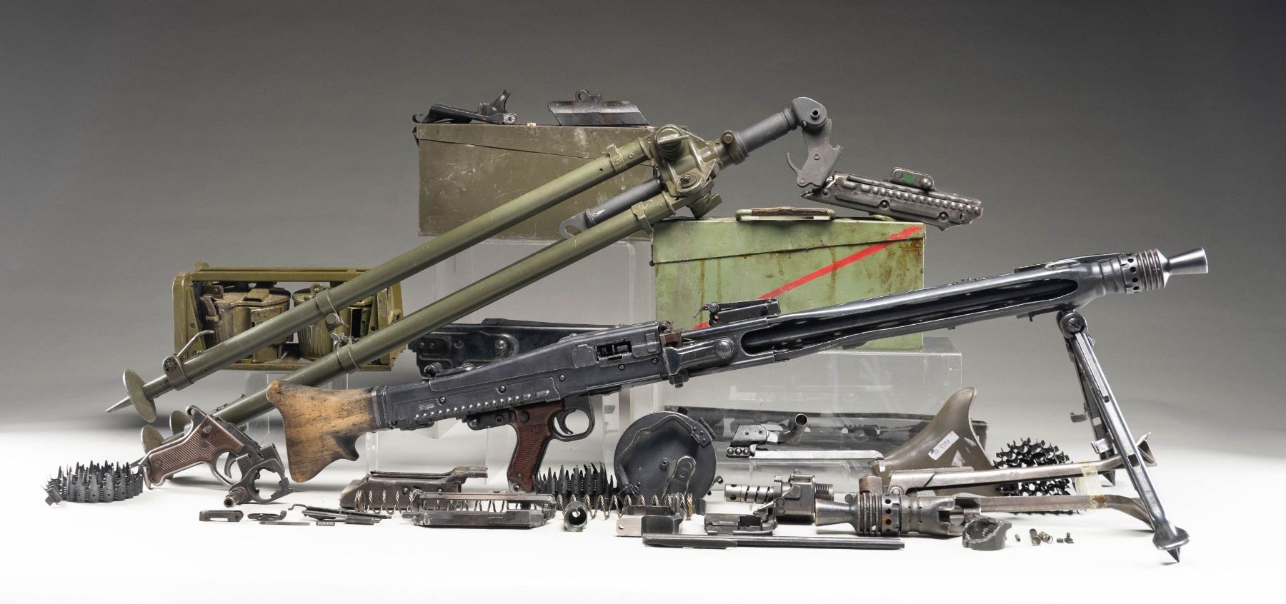KIT. MG-42 GPMG (General Purpose Machine Gun) display gun / parts kit assembled on a milled steel receiver. Gun appears to be assembled from a variety of war time and post-war parts. Bbl. is marked "cyw" over an encircled "cyq/ 1", a stylized "cyq" and a German Eagle/15 proof, with a boxed "K-5" proof stamped on the side. Metal components exhibit a reapplied blue finish overall. Post-war wood buttstock with 2-piece grooved brown synthetic grips. Standard flip-up blade front sight and tangent V-notch rear sight graduated 2-20. German WWII "1943" dated folding bipod. No matching numbers. Bolt assembly and charging handle are absent. UNATTACHED ACCESSORIES: x1 post-war MG-42/MG3 Anti-Aircraft tripod, x1 unmarked MG-34 Gurtfulller 34 belt loader (coated in a thick layer of old cosmoline) in ammunition can, x1 "10/77" dated German MG3 belt loader in ammunition can, x2 MG42 50-rd. "basket" drum mags. in carrier (mags. and carrier with green painted exterior), x1 blued steel 50-rd. "basket" drum mag., x6 50-rd. MG-34/MG-42 belts, 8 cut sections of receiver (1 including muzzle booster, 1 including stock socket assembly), 1 cut bbl. shroud, a spare "bpr" receiver cover, x1 spare German WWII "1944" dated bipod, x1 charging handle, x1 German WWII trigger pack assembly/housing, x1 post-war green synthetic buttstock, x1 bolt recoil spring, as well as some assorted small parts. CONDITION: excellent, with metal components retaining the vast majority of their professionally reapplied blue finish overall, exhibiting some light edge wear, some superficial handling marks, as well as some scattered spots of light surface oxidation and pitting. Very bright bore, exhibiting a couple of small scattered spots of pitting and streaks of grease along the edges of the lands, while retaining well defined rifling throughout. Wood stock shows scattered marks and impressions from handling and storage, but otherwise remains sound. Stock rotates freely. Grips show general wear and scattered handling marks, with the right panel exhibiting a crack at the top and bottom edges of the safety button. Belt loaders are very good overall. Ammunition cans show scattered spots of flaking, wear, and oxidation, but otherwise remain sturdy and serviceable. Spare parts show varying degrees of wear and oxidation, but otherwise appear serviceable. Tripod is very good overall. An exceptionally attractive and well accessorized MG-42 display gun / parts kit. (02-25538/MLW). NON-GUN. $2,500-3,500.
