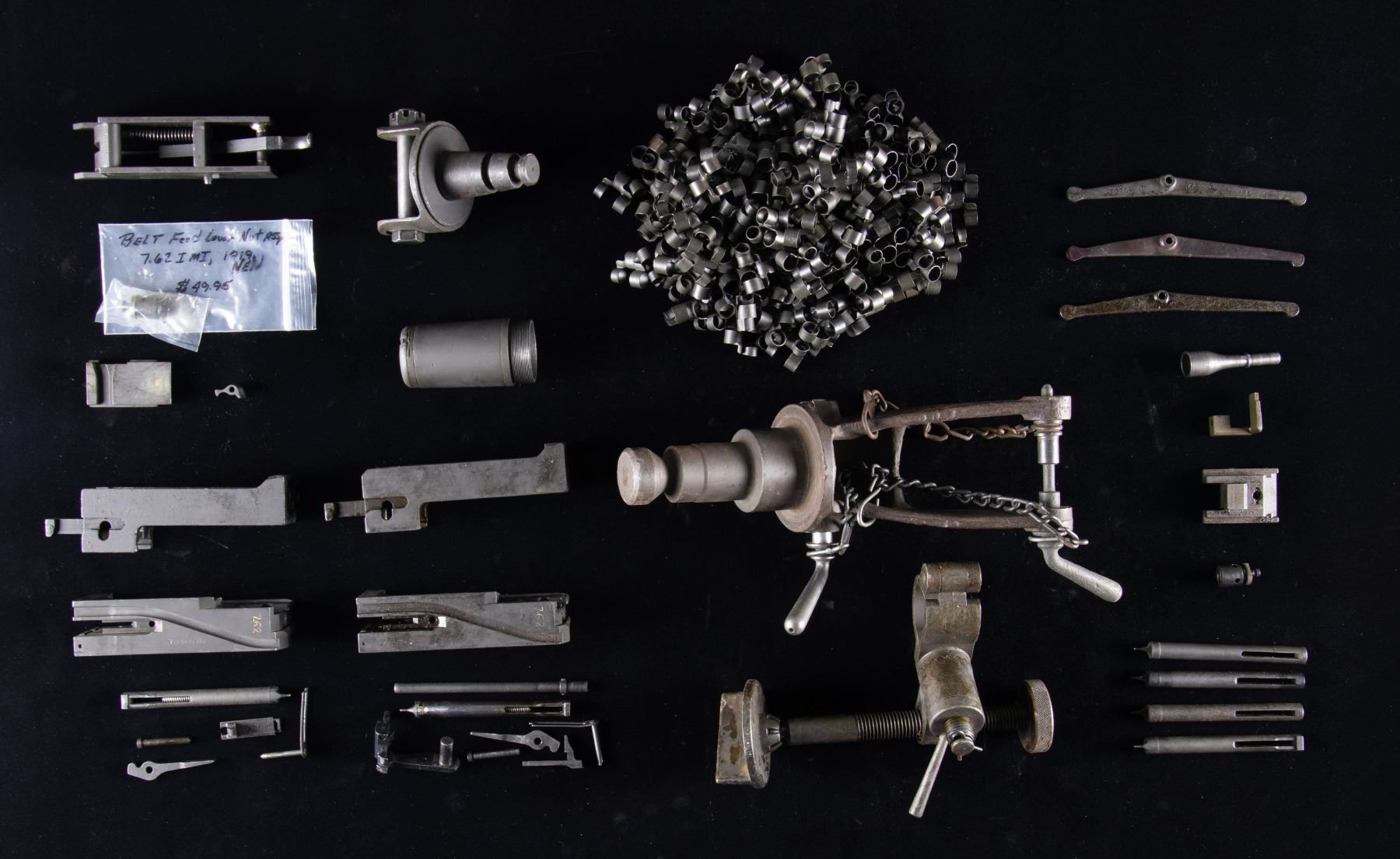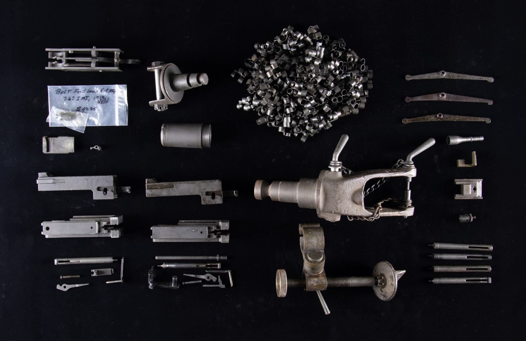 This lot consists of the following Browning MG parts: 1) M8 Barrel Cover New condition. 2) 1917 Tripod Leather Strap New condition. 3) 1917A1 Leveler Leg NOS condition. 4) Tripod Pintle for both 30 & 50 Cal. mags with bolt & nut. NOS condition. 5) D38579 Cradle Assembly for BAR & 1919A4. NOS condition. 6) 1917/1919 Charging Handle 7) 1919 1919/M37 Bbl. extensions. NOS condition. 8) 1917/19 Bbl. Extension with Israeli locking tab. NOS condition. 9) .718 diameter 1919A4 30-06 Booster with plug lock ring. 10) Four 1917/1919 Firing Pin Assembles. 11) 1917/1919 Cam Breech Lock 12) Three 1917/1919 Belt Feed Levers. 13) 1919 Cartridge Guide Rear 7.62 NATO. 14) 1917/1919 Bbl. Plunger Hollow Early Model. 15) 1917/1919 Bbl. plunger Spring. 16) 1917/1919 Breech Block Accelerator Pin. 17) Two 1917/1919 7.62 NATO Bolt assemblies that are missing some parts. 18) 1917/1919 Belt Feed Lever Nut Assembly. 19) Bag 5559738 Spare Parts. 20) 2-250 rd. metal tabs cloth belts for 1917/1919. 21) 1917/1919 Combination Wrench. 22) 1919 Lock Frame Assembly with Israeli Adjustable nut & set screw trigger. 23) 1919 7.62 NATO belt pawl Israeli marked. 24) Israeli 1919 Belt Hold Pawl Spring Pin Set. 25) IMI made 1919 belt feed Lever nut assembly 7.62 NATO. 26) Israeli marked 7.62 NATO 1919 Belt Feed slide. (02-25050-1/MJC). NON-GUN. $900-1,400.