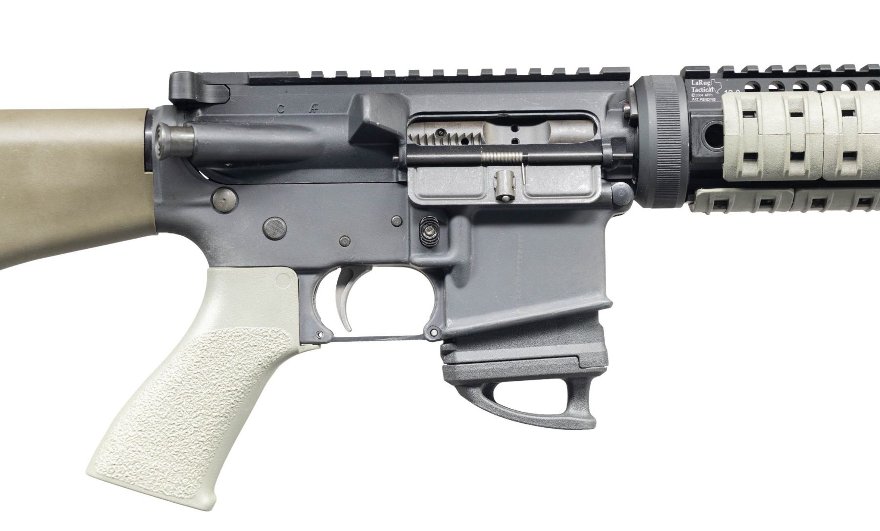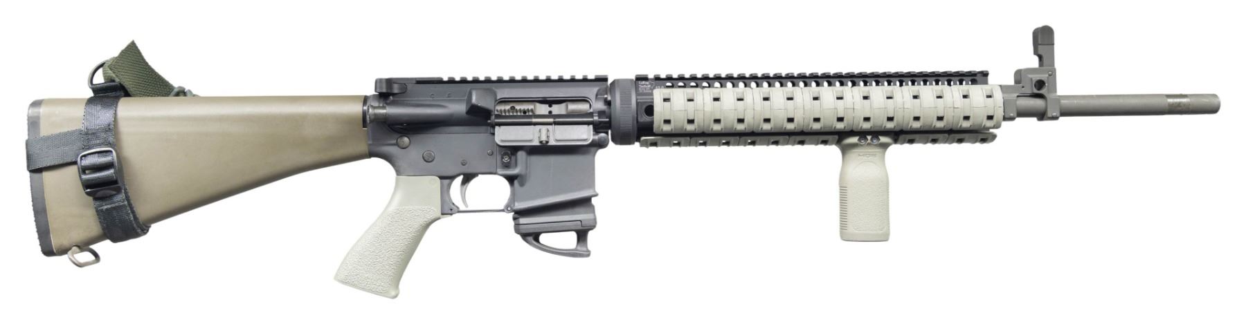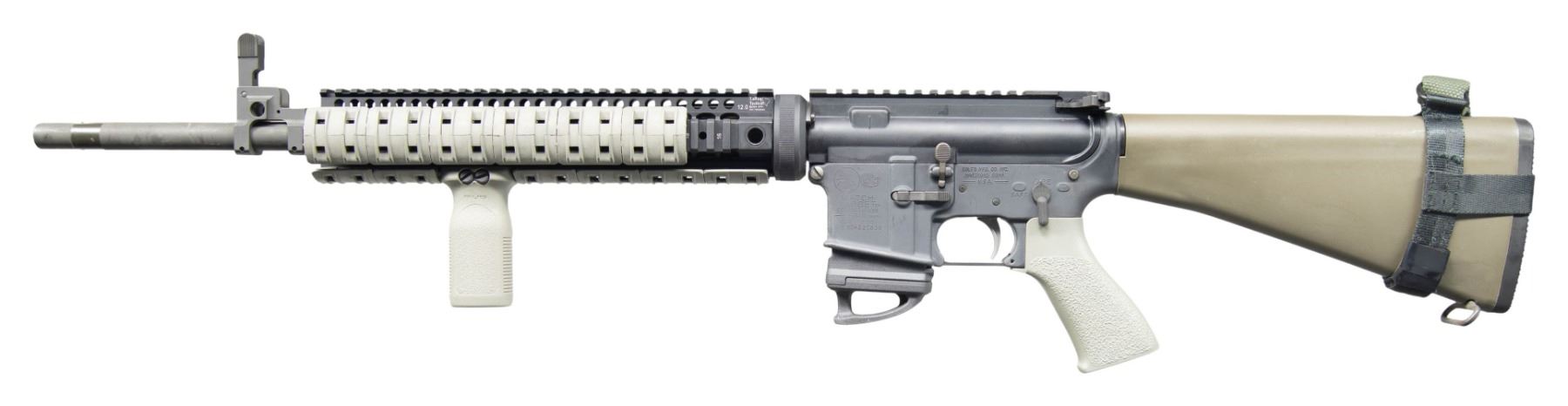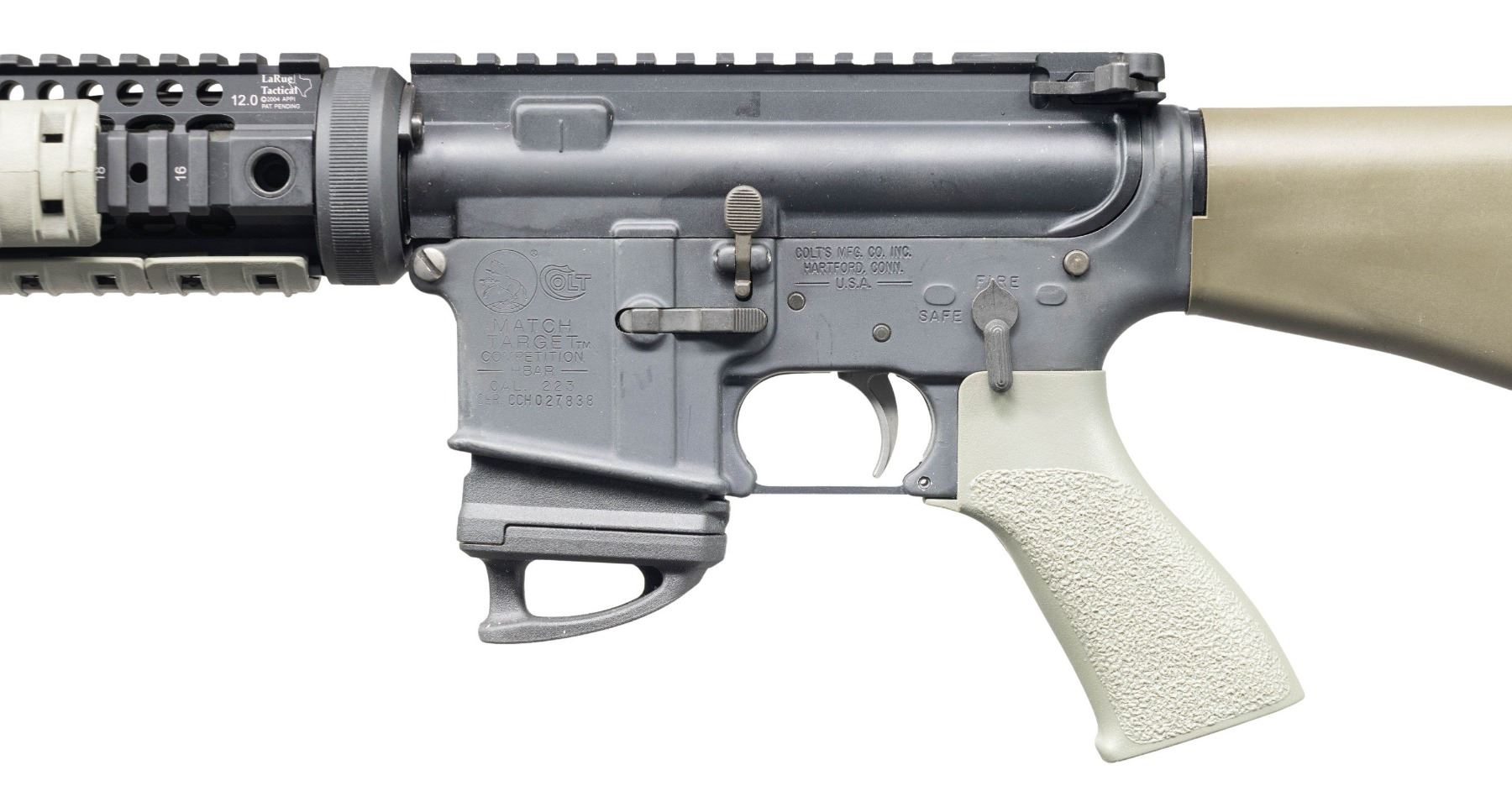 SEMI-AUTOMATIC RIFLE. Cal. 5.56mm. S# CCH027838. Bbl. 20". Match Target Competition H-BAR semi-automatic rifle mfg. by Colt. Left side of the receiver exhibits standard factory markings denoting the model and cal. designations, S#, as well as Colt's mfg. information. Top of the bbl. is marked "C MP 5.56 NATO 1/9 HBAR". Aluminum receiver, flat top upper, and quad rail handguard exhibit a matte black finish, with the bbl. and front sight / gas block assembly exhibiting a phosphate finish. Larue Tactical free floating quad-rail handguard with FDE rail covers, MAGPUL RVG vertical foregrip, textured synthetic pistol grip and fixed A2 pattern buttstock with checkered black synthetic trapdoor buttplate. Aftermarket folding post front sight / gas block assembly and charging handle latch. Apparent Jewell 2-stage adj. trigger assembly, with adj. wheel on left side. MAGS: 1 black polymer MAGPUL Gen 3 10-rd. mag. with MAPGUL Ranger floorplate. CONDITION: metal components retain the vast majority of their original factory finishes, exhibiting some light superficial handling marks overall. Mirror bore, exhibiting strong rifling throughout. Proper manual mechanics. FDE polymer furniture exhibits some scattered superficial marks from handling and storage, but otherwise remains sound. (25-3890/MLW). MODERN. $600-900.