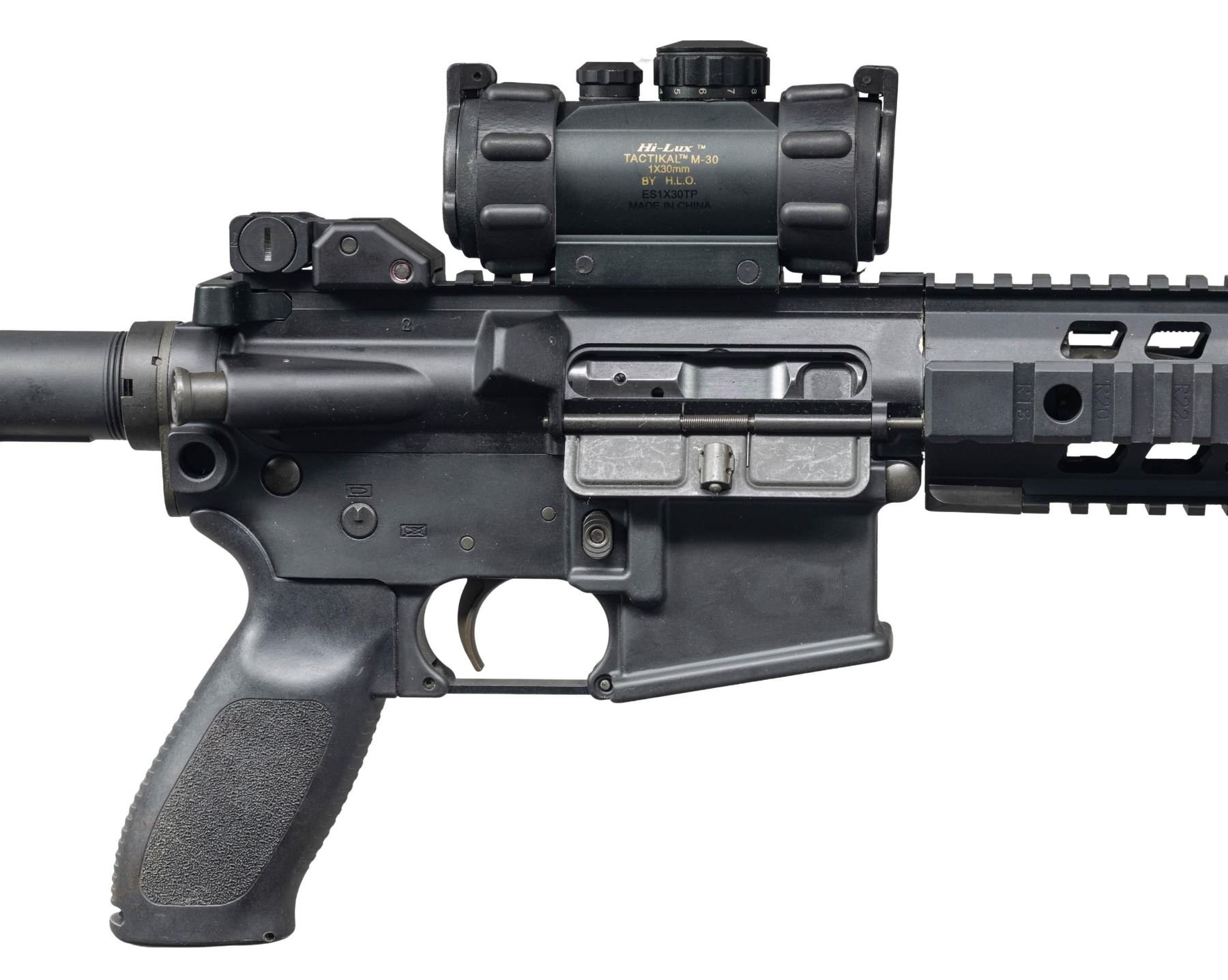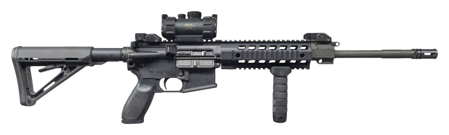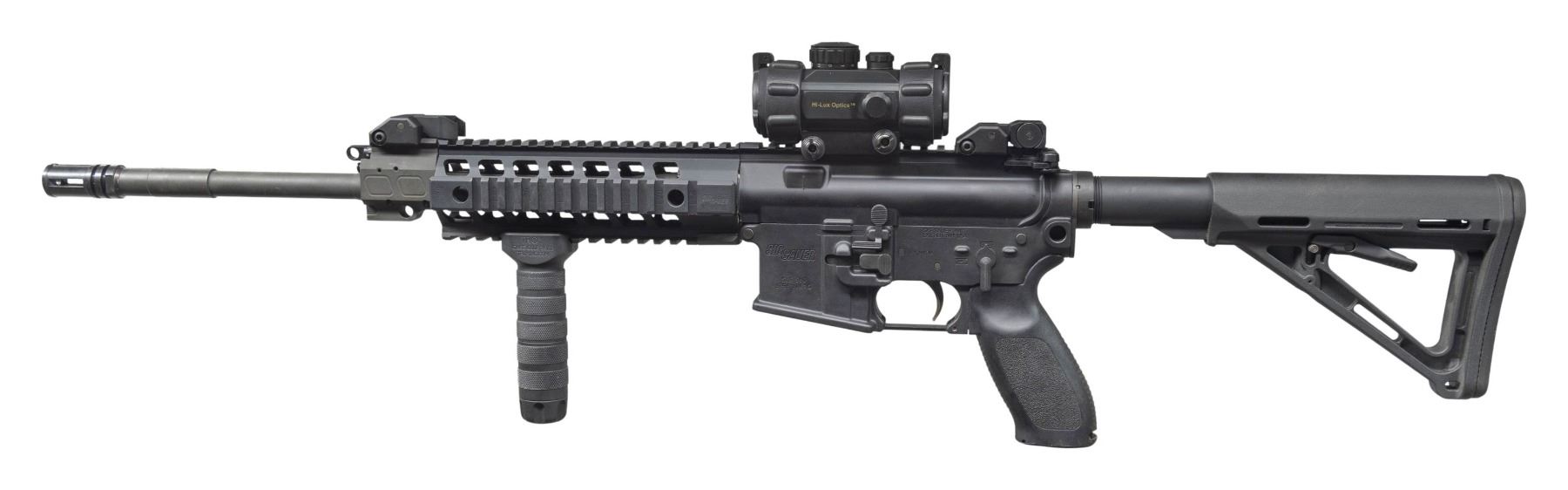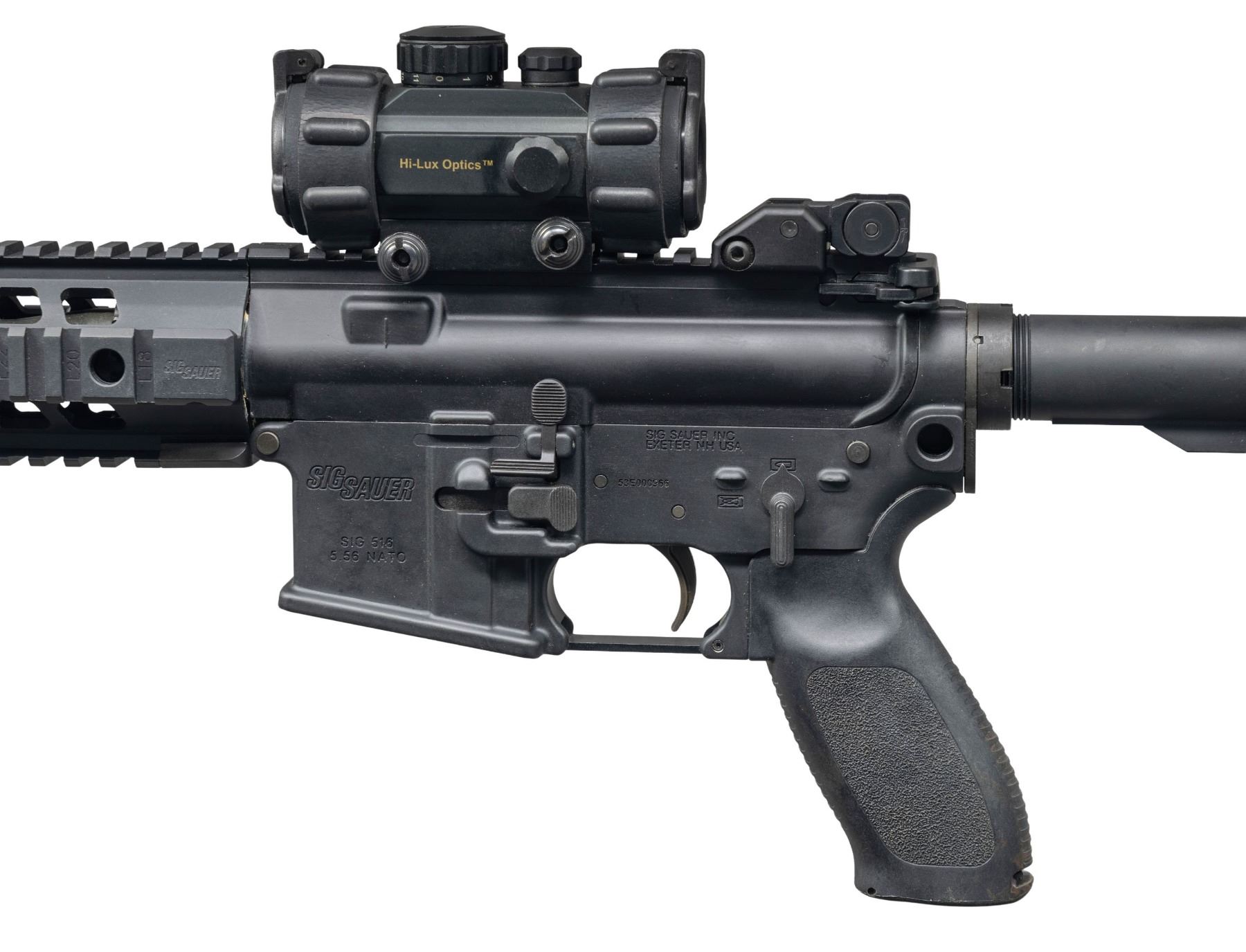 Cal. 5.56mm. S# 53E000966. Bbl. 16". SIG 516 semi-automatic rifle mfg. by Sig Sauer. Left side of the receiver exhibits standard factory markings denoting the model and cal. designations, as well as Sig Sauer's mfg. information. Aluminum receiver, buffer tube, upper, and handguard exhibit dull black finish, with the bbl., gas block, bolt, and some small parts exhibiting a phosphate finish. Bolt carrier and flash hider exhibit a blue finish. Factory aluminum quad-rail handguard with textured and grooved black polymer pistol grip, and telescoping MAGPUL MOE buttstock. Buttstock is currently fixed in place via an unidentified adhesive. Lower handguard rail is fitted with a Troy Industries Modular Combat Grip. Folding post front sight and folding dual aperture rar sight. Upper receiver rail is mounted with a Hi-Lux Tactikal M-30 1x30mm red dot sight. Sides of the receiver feature a provision for a single point sling attachment at the rear. Adj. short stroke piston action. Mag. is absent. CONDITION: metal components retain the vast majority of their original factory finishes, exhibiting some superficial handling marks overall. Mirror bore, retaining well defined rifling throughout. Proper manual mechanics. Polymer furniture is excellent overall. Sight battery is dead, but otherwise retains a clear optic. (25-3106/MLW). MODERN. $800-1,200.