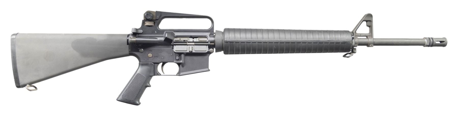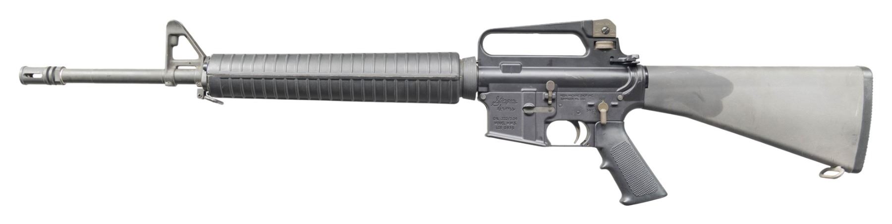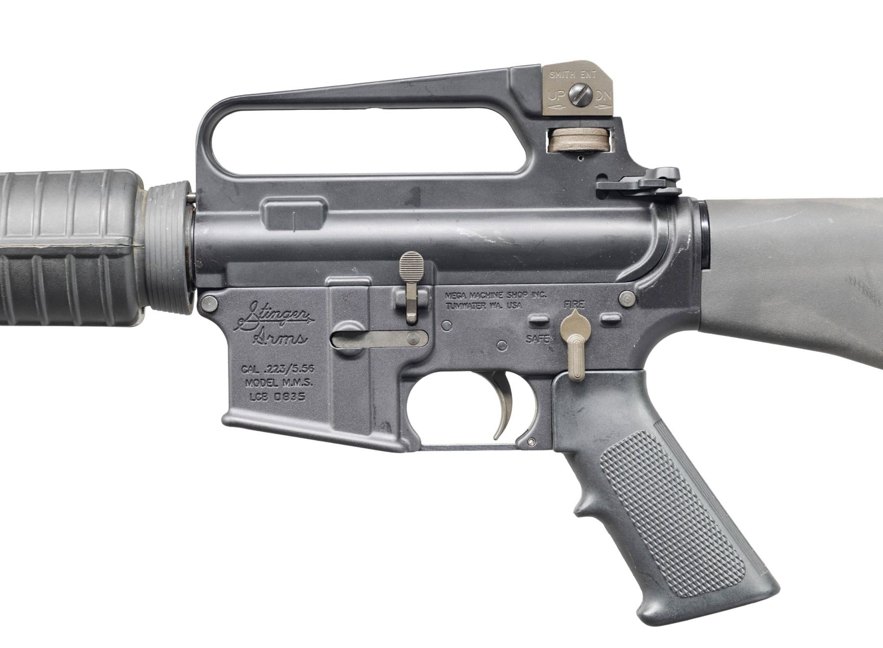 SEMI-AUTOMATIC RIFLE. Cal. 5.56mm. S# LCB0835. Bbl. 20". M.M.S. semi-automatic rifle mfg. by Mega Machine Shop. Left side of the receiver is marked "Stinger/ Arms" above the model and cal. designations, as well as the S#, with Mega Machine Shop's mfg. information marked by the selector lever. Top of the bbl. is marked "C MP 5.56 NATO 1/7 HBAR". Alloy lower and upper assembly exhibit a matte black finish, with the bbl., front sight / gas block assembly, rear sight assembly, and some small parts exhibiting a phosphate finish. 2-piece ribbed black synthetic A2 pattern handguard, with checkered A2 pattern pistol grip, and fixed A2 pattern buttstock with checkered black synthetic trapdoor buttplate. Birdcage flash hider with standard AR pattern post front sight and Smith Enterprises dual aperture rear sight. Mag. is absent. CONDITION: metal components retain the vast majority of their original factory finishes, showing some scattered superficial handling marks overall. Mirror bore, retaining well defined rifling throughout. Proper manual mechanics, although the selector lever is slightly loose with some wobble. Synthetic furniture shows some scattered superficial handling marks, but otherwise remains sound. (25-3882/MLW). MODERN. $600-900.
