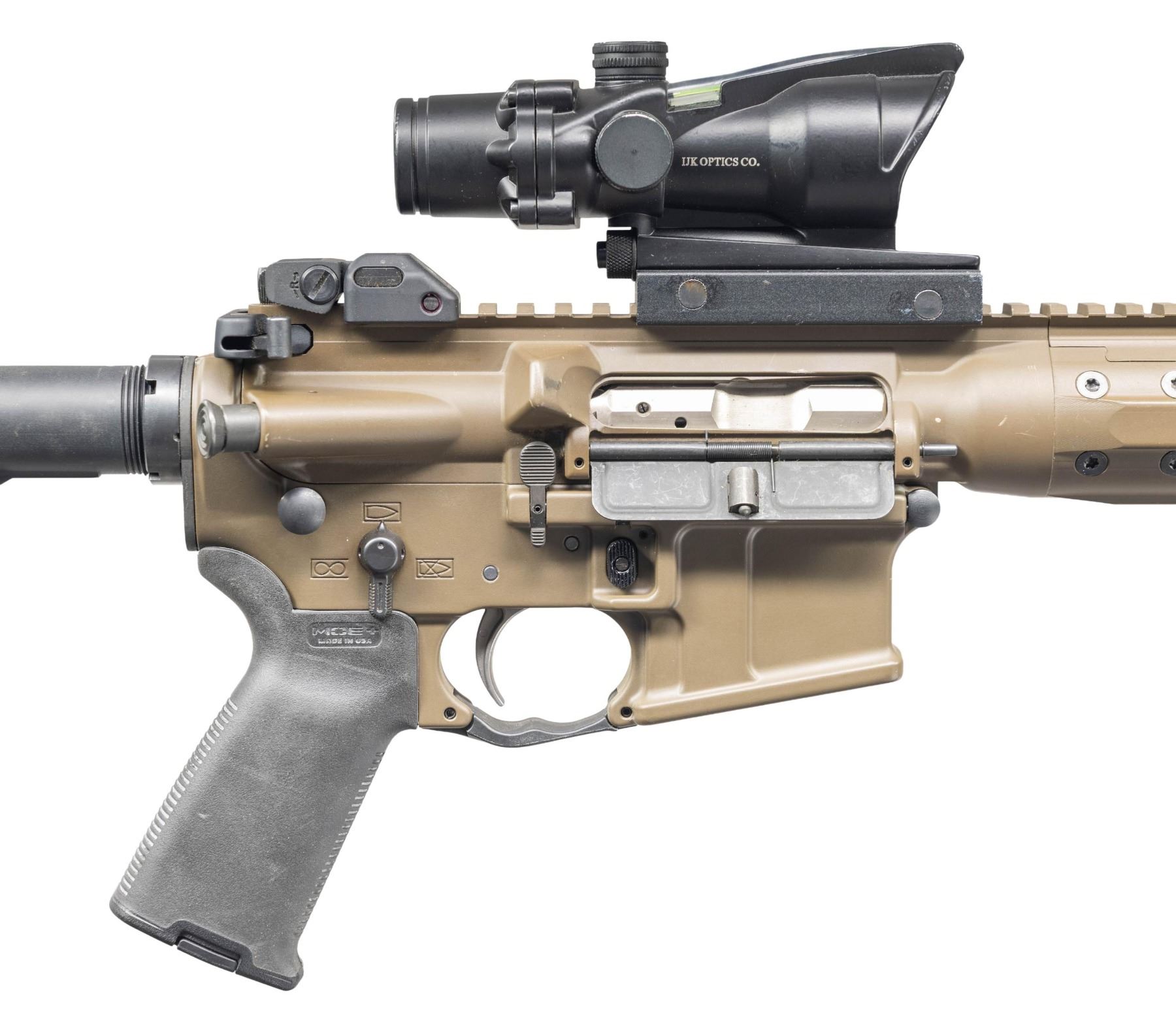 Cal. 5.56mm. S# 23-04048. Bbl. 16". M6IC-SPR (M6 Individual Carbine Special Purpose Rifle) semi-automatic rifle mfg. by LWRC. The left side of the receiver is marked "LWRC/ INTERNATIONAL/ M6IC/ (QR CODE PLATE)/ 23-04048/ 5.56mm NATO", with "CAMBRIDGE, MD/ U.S.A." marked towards the selector lever. 3-position pictogram selector is marked with an infinity symbol at the third position. Left side of the flat top upper is marked with the LWRC logo, followed by "M6IC-SPR 5.56mm/ MADE IN THE U.S.A.". Receiver, upper, and handguard exhibit a "Patriot Brown" cerakote finish. NiCorr treated spiral fluted bbl. and 4-prong flash hider exhibit a blue finish. Nickel-Boron coated bolt carrier with phosphate finished bolt. Black synthetic LWRC enlarged trigger guard, with MAGPUL MOE pistol grip, and black synthetic LWRC Compact adj. buttstock. Flip-up open top LWRC post front sight with LWRC flip-up 4-aperture rear sight. Upper is fitted with an IJK Optics Co. ACOG style (x1 power) green dot optic. Ventilated handguard features factory threaded holes for a picatinny rail attachment. Underside of handguard is fitted with 2 picatinny rails, 1 mounted with an IJK Optics Co. N2LG-SPX LED flashlight laser combo. Short stroke gas piston action with ambidextrous controls consisting of the bolt release lever, mag. release button, selector lever, as well as the charging handle. Mag. is absent. CONDITION: metal components retain the vast majority of their original factory finish, exhibiting some superficial handling marks overall. Mirror bore, exhibiting well defined rifling throughout. Proper manual mechanics. Polymer furniture shows some superficial handling marks, but otherwise remains very good overall. IJK green dot sight retains a clear optic. (25-5491/MLW). MODERN. $1,200-1,800.