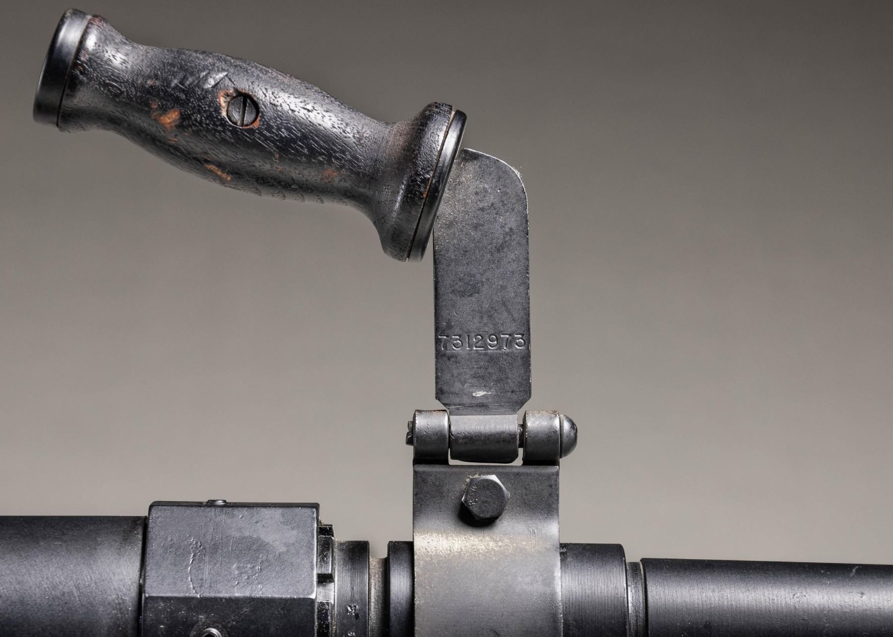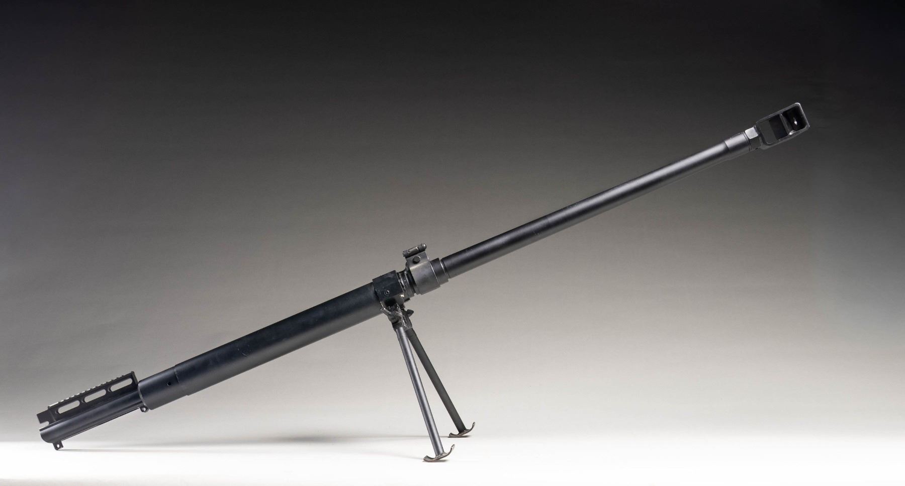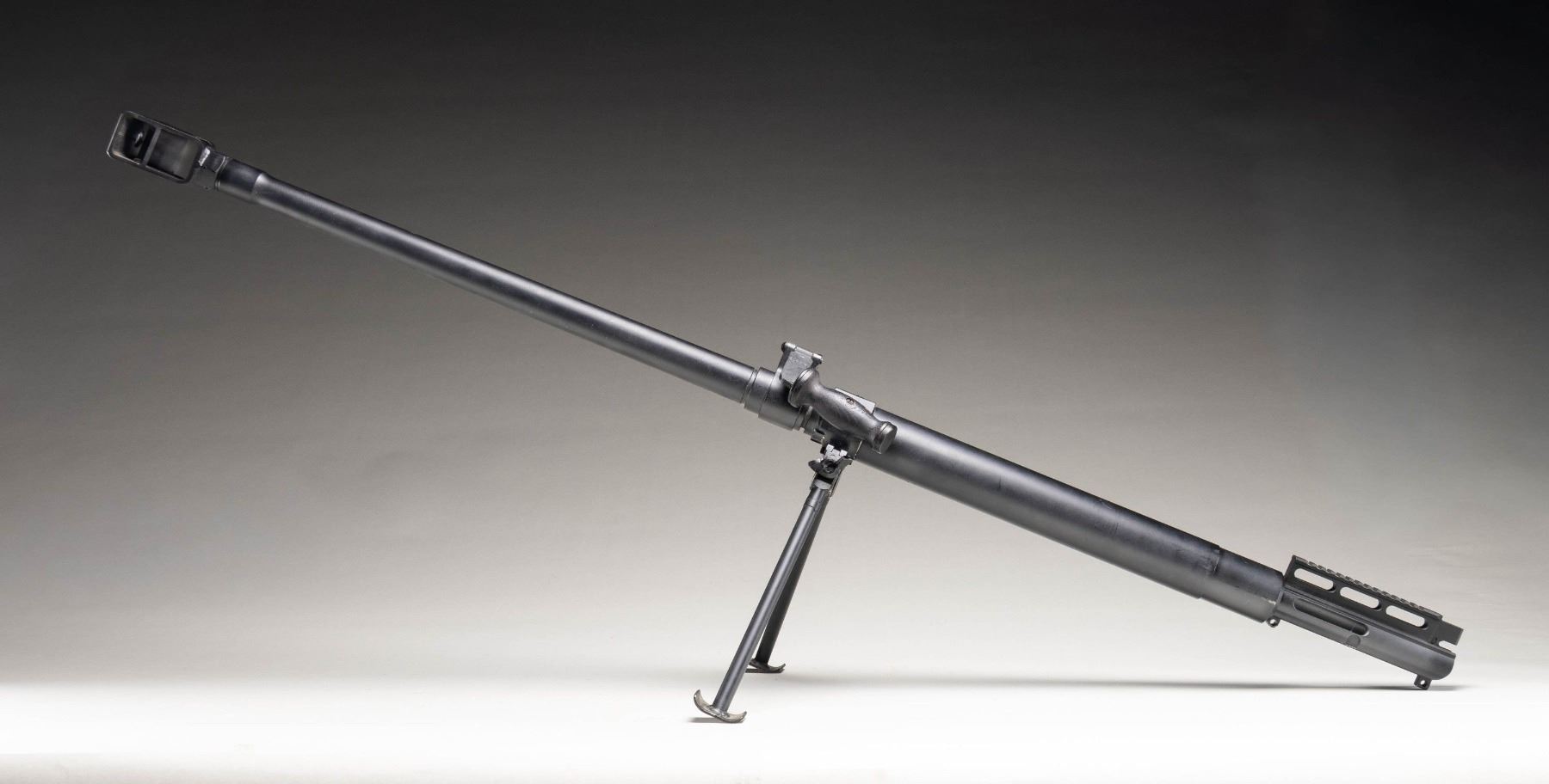 Unmarked AR-15 .50 BMG upper assembly, fitted with an M2HB bbl. Metal components exhibit a matte black finish overall. Complete with bipod and shoulder strap. Breechblock and crank are absent. CONDITION: very good, with some scattered superficial marks from handling and storage. Bright bore, exhibiting what appears to be grease, while retaining well defined rifling throughout. (02-25372/MD). NON-GUN. $800-1,200.