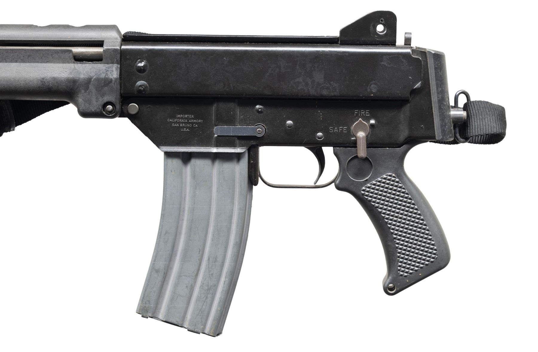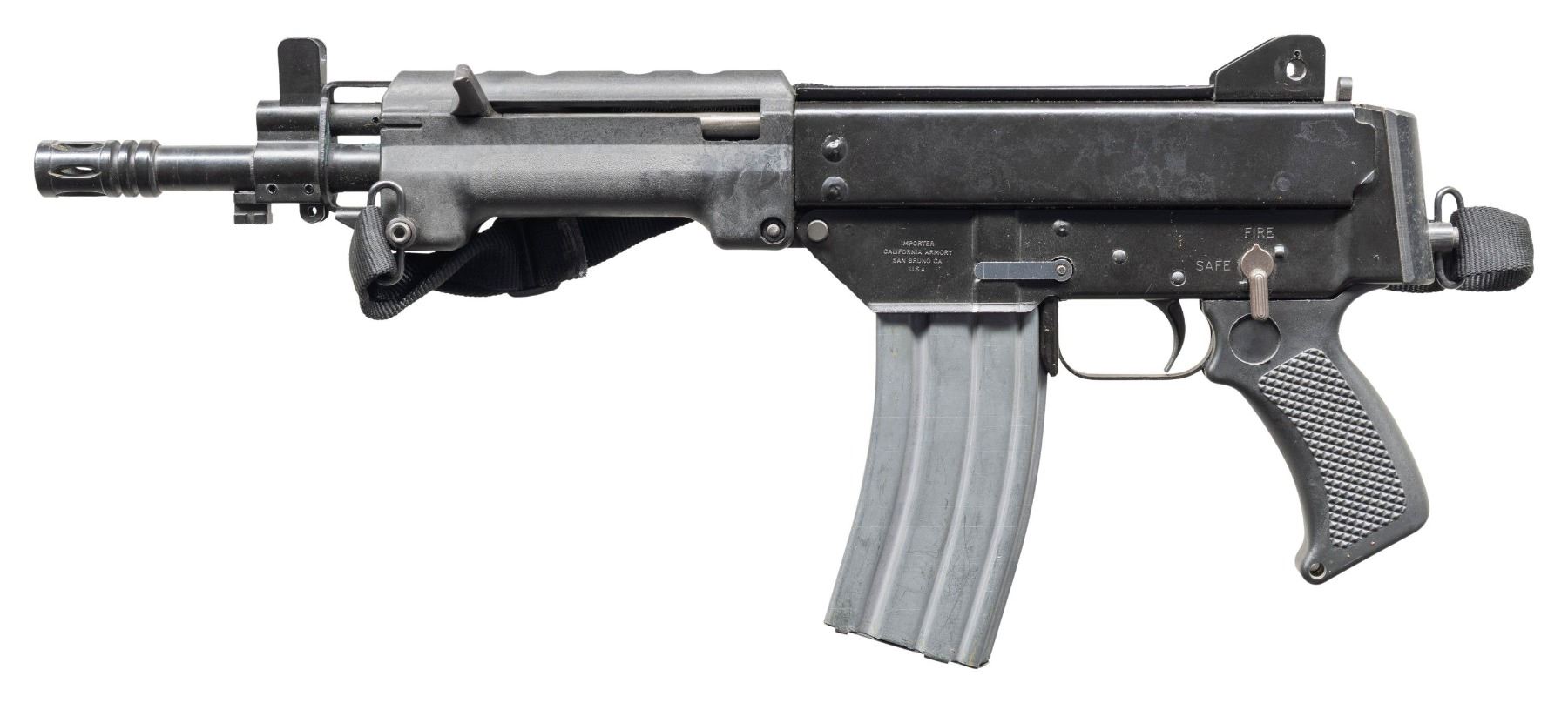 SEMI-AUTOMATIC PISTOL. Cal. 5.56mm. S# SAP100408. Bbl. 11". 1 of only approx. 700 SAP "Tasmanian Devil" semi-automatic pistol mfg. by Australian Automatic Arms. The left side of the receiver is marked "IMPORTER/ CALIFORNIA ARMORY/ SAN BRUNO CA/ U.S.A.", with Australian Automatic Arms mfg. information, the cal. designation, and the S# marked on the right. Metal components exhibit a black enamel type finish overall. 2-piece black synthetic handguard with 1-piece checkered black synthetic grip. Front and rear iron sights are absent. Birdcage flash hider with integral bayonet lug on front sight assembly. MAGS: 1 aluminum 30-rd. mag. by Adventure Line Mfg. Co. CONDITION: very good to excellent, with metal components retaining the vast majority of their original factory black enamel finish, exhibiting some small scattered spots of minor flaking. Underside of bbl. exhibits an area that has flaked to the rear of the flash hider. Mirror bore, retaining well defined rifling throughout. Proper manual mechanics. Synthetic furniture is very good overall, with a few scattered handling marks. PROVENANCE: Lifelong Collection of Terrence McCarty. (24-566/MLW). MODERN. $1,000-1,500.