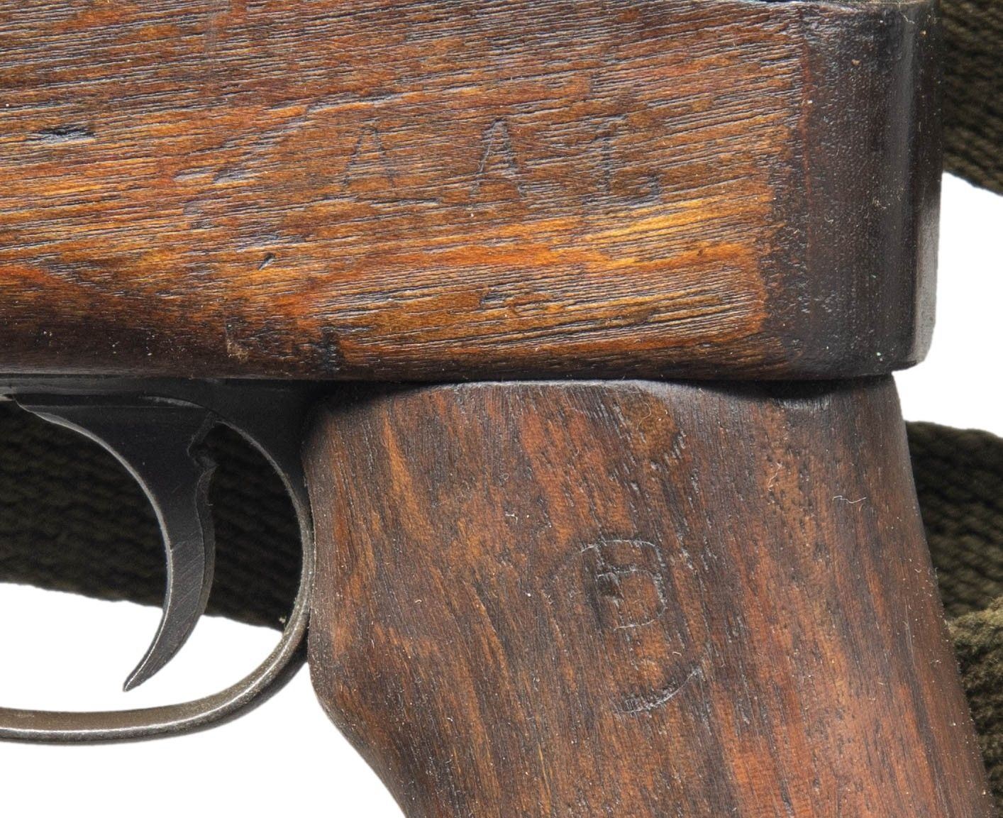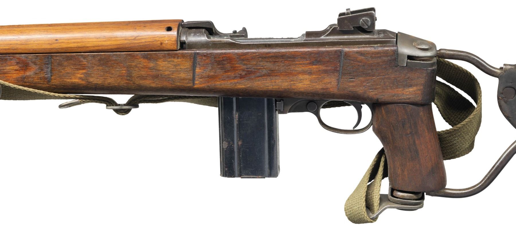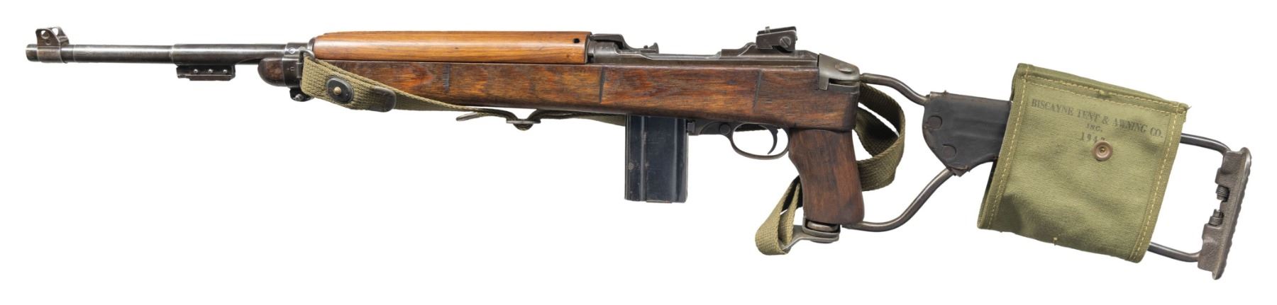 Cal. 30 Carbine. S# 5127360. Bbl. 18". Barrel is marked behind front sight "INLAND MFG. DIV. / GENERAL MOTORS / 4-44". Milled adjustable aperture rear sight marked with "H" in shield. Blade front sight with protective ears. Sight base marked ".U.". Barrel band with bayonet lug marked "Q". Six o'clock slide marked "PI". Flat bolt marked "ROCK OLA". Milled trigger guard marked "SG". Rotary safety. Straight cut hammer marked ".U.". Walnut stock set. Stock is marked on left side over pistol grip "AAL" indicating an overhaul at the Augusta Arsenal. Pistol grip has partial encircled "P" proof on left side and faint "crossed cannon" marking at end. Correct folding stock and buttplate. Leather pad appears to be arsenal replacement. Oiler is present. Two rivet handguard marked "IO". Vintage green web sling. MAGS: one detachable 15 round GI marked "IA". UNATTACHED ACCESSORIES: green canvas two magazine pouch marked "US / BISCAYNE TENT & AWNING CO. INC. 194?". CONDITION: stock, grip and handguard have well worn arsenal rework finish with numerous handling marks. Folding stock has turned overall gray and patina. Leather cheek pad is extremely worn with missing areas. Metal parts retain 50% of their original worn parkerized finish. Very good shiny bore. (25-6521/RW). CURIO. $1,500-2,000.