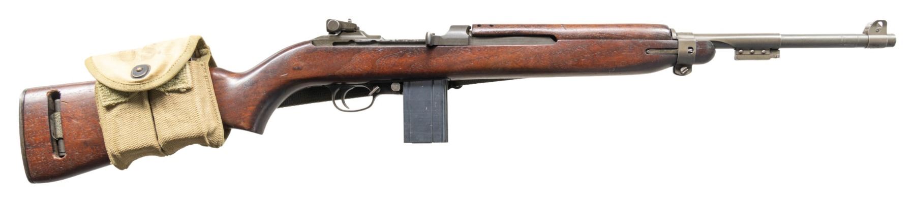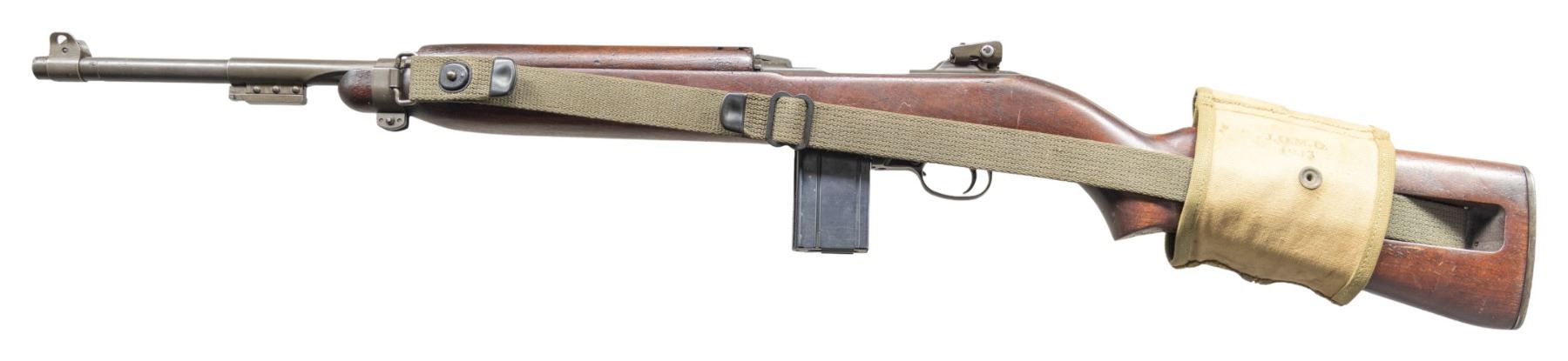 Cal. 30 Carbine. S# 6253567. Bbl. 18". Barrel is marked behind front sight "INLAND MFG. DIV. / GENERAL MOTORS / 10-44". Stamped adjustable aperture rear sight "I.R. CO.". Blade front sight w/ protective ears. Rear sight base is marked "N". Barrel band w/ bayonet lug & wire type swivel is marked "SI". Six o'clock slide marked "PI". Flat bolt marked ".U.". Milled trigger guard marked "INLAND". Rotary safety. Mag. catch w/ 30 round extension. Straight cut hammer marked "W". Walnut stock set. Oval cut low wood buttstock marked "LW" in sling slot has additional bored soldier type marking at end of grip w/ letters "D E N" carved over "double triangle" atop "M". Four rivet handguard marked "IO". Green web sling. MAGS: three blued steel 15 round detachable magazines. Two are GI, one is commercial. UNATTACHED ACCESSORIES: two pocket mag. pouch on buttstock marked "U.S." on flap. Additionally marked "J.Q.M.D. / 1943". CONDITION: stock set has moderately worn original finish w/ numerous scratches & handling marks throughout. Small crack on top of grip behind recoil plate. Small raised chips at front and rear of magazine well. Handguard has notable missing chip at forward end, largely concealed by barrel band. Metal retains 80% of its original parkerized finish w/ light wear. Very good shiny bore w/ sharp lands. (25-4738/RW). CURIO. $700-1,000.