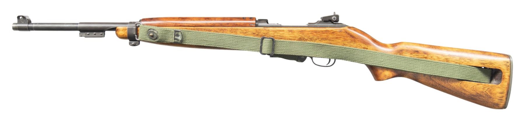 Cal. 30 Carbine. S# 1654318. Bbl. 18". Barrel marked behind front sight "ROCK-OLA 4-43". Barrel band with bayonet lug marked "JM"/ "SU". Straight cut slide marked "W". Flat cut bolt marked "CU". Detachable recoil spring tube. Milled trigger guard marked "INLAND". Rotary safety. Unmarked straight cut hammer. Hardwood potbelly stock is unmarked. 4 rivet walnut handguard marked "L-J". Green web sling. MAGS: one 5rd detachable. CONDITON: stock set has a professional refinish with added gloss finish. Stock set has light wear and handling marks. Metal retains 70% of its original parkerized finish with thinning and light wear. Trigger guard pin is shop made replacement. Very good shiny bore. PROVENANCE: From the Buckstix Collection. (25-6466/RW). CURIO. $700-1,000.