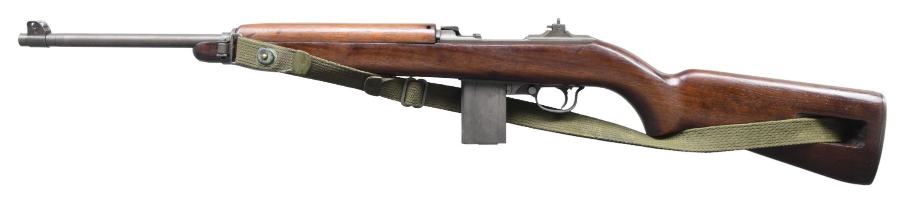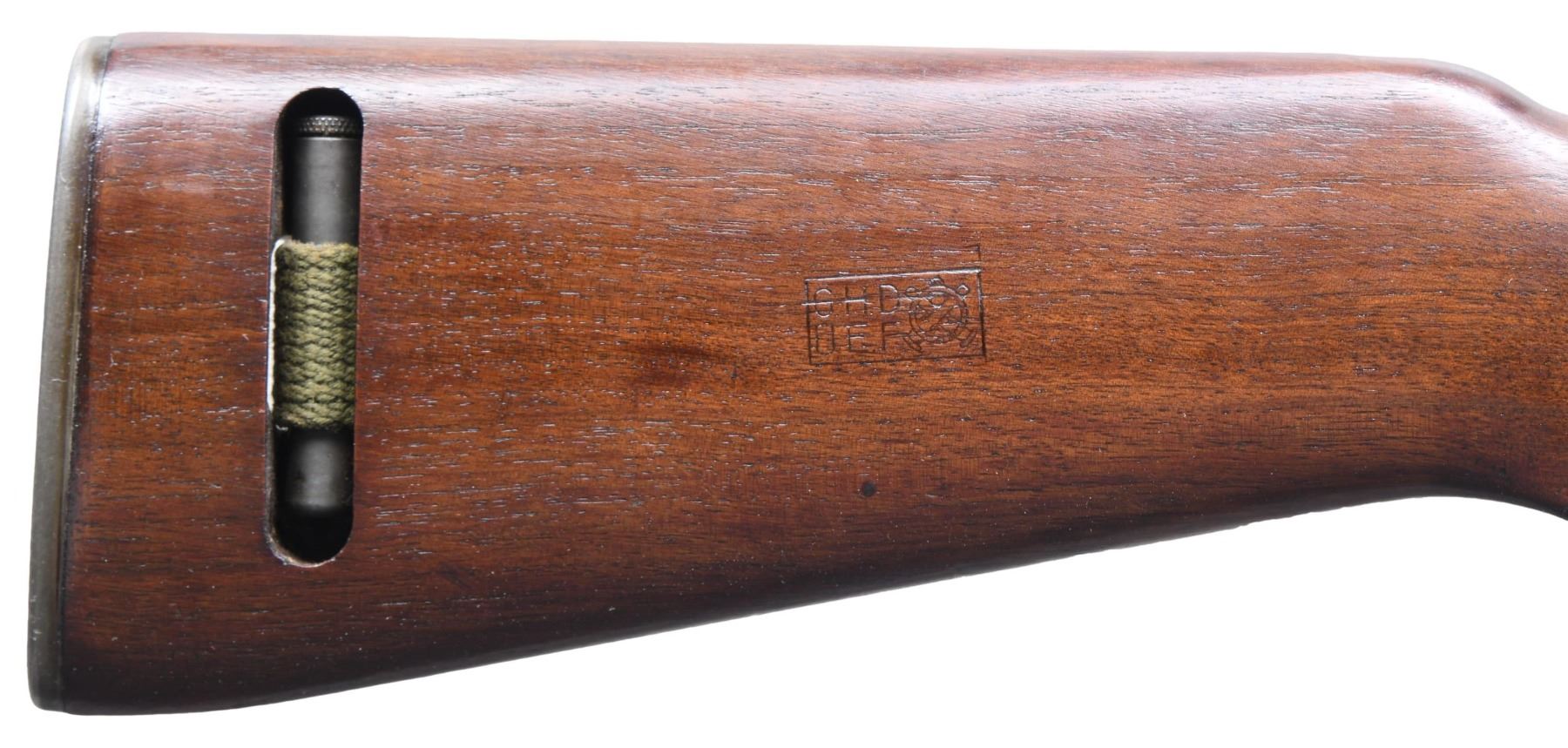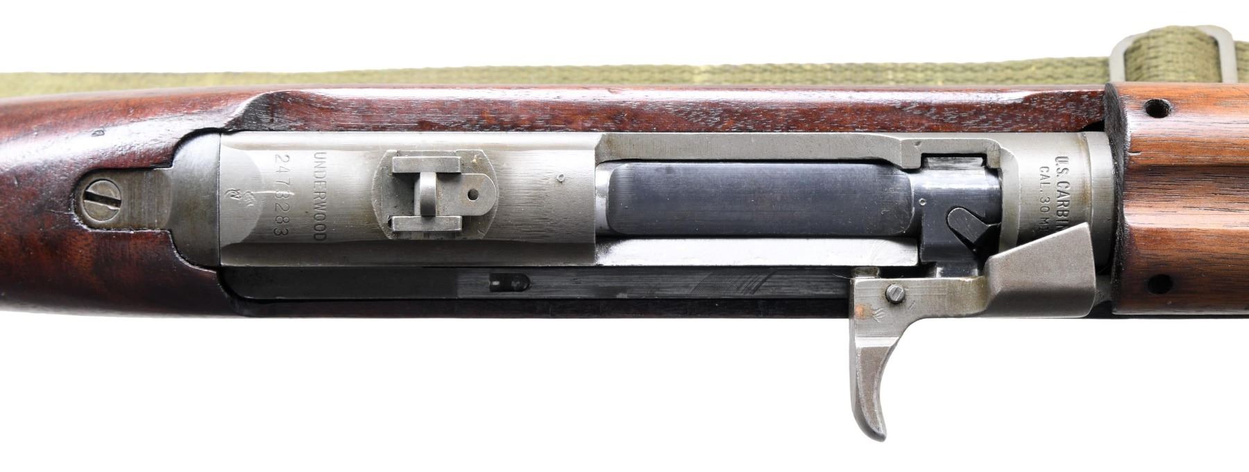 Cal. 30 Carbine. S# 2473283. Bbl. 18". Bbl. is marked behind front sight "UNDERWOOD / 1-43 / flaming bomb". Replacement flip-type rear sight. Blade front sight w/ protective ears. Narrow bbl. band w/ rectangular stamped swivel. Straight cut slide marked ".U.". Round bolt marked "SU". Unmarked fabricated trigger guard. Push button safety. Smooth mag. catch marked ".U.". Straight cut hammer marked "WU". Low wood walnut buttstock w/ oval cut marked inside sling slot "LW?". Marked on right side of butt w/ boxed "G.H.D. / UEF / crossed cannons". Two rivet handguard marked "JLB". Green web 1952 dated sling. MAGS: 1 detachable 15 rd parkerized marked "LU". CONDITION: stock set has a lightly restored finish w/ good appearance, but showing visible sanding marks throughout. Metal retains 80% of its original parkerized finish w/ light wear & scattered small scratches. Very good shiny bore w/ sharp lands. PROVENANCE: Estate of Russell Dickerman. (25-1852/RW). CURIO. $1,000-1,500.