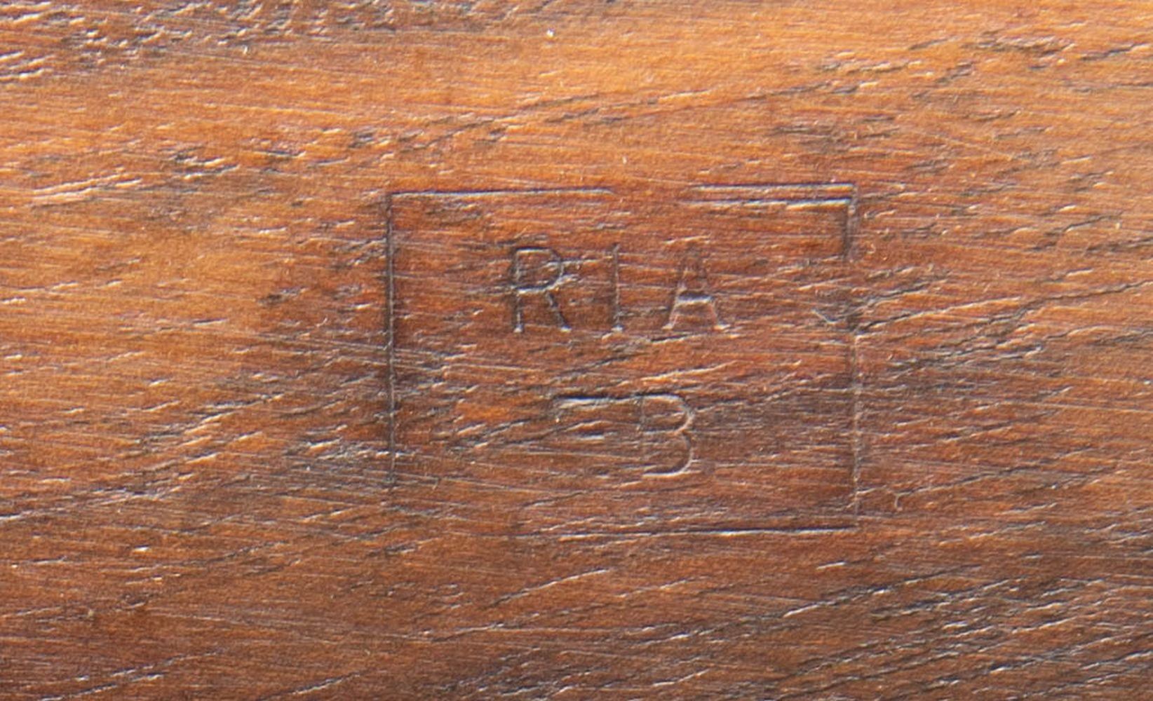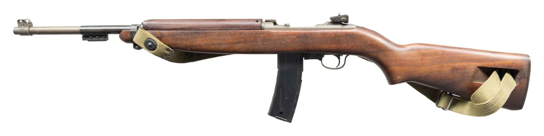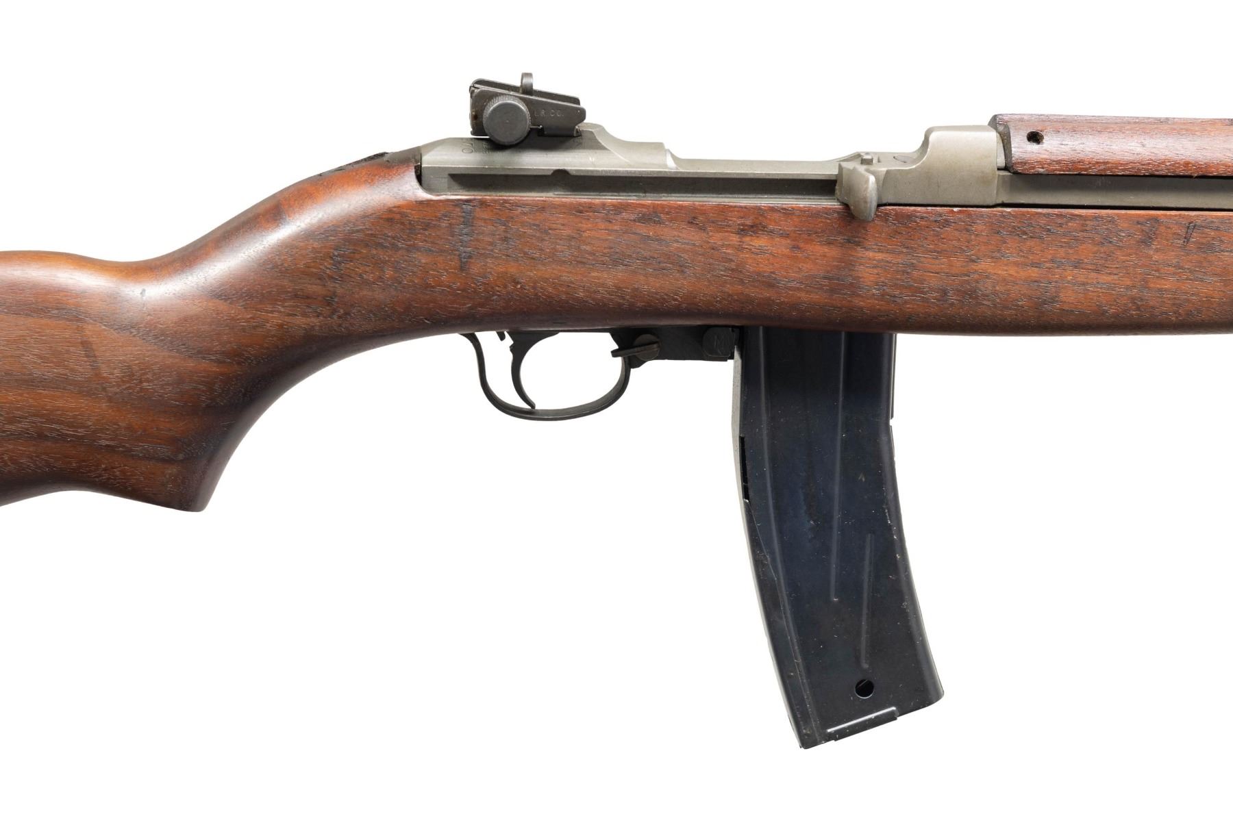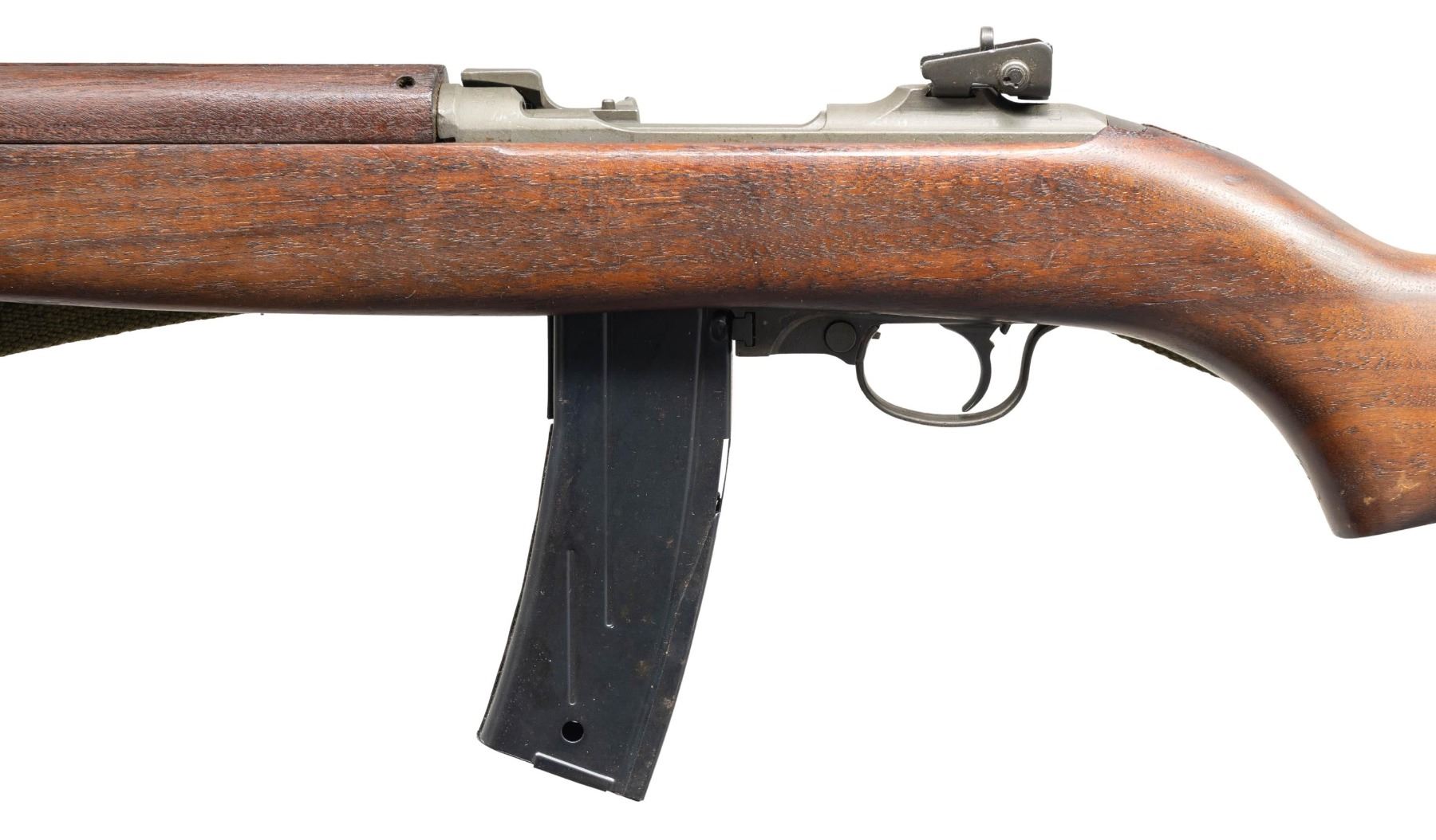 Cal. 30 Carbine. S# 1007370. Bbl. 18". Barrel marked behind front sight "UNDERWOOD / 12-43 / flaming bomb". Stamped adjustable rear sight marked "L.R. CO.". Blade front sight w/ protective ears. Sight base marked "EU". Blued steel barrel band w/ bayonet lug marked "Q". Straight cut slide marked "AOB". Flat bolt marked ".U.". Receiver made w/ separate recoil spring tube. Fabricated trigger guard shows traces of copper brazing. Marking likely obscured during overhaul. Rotary safety. Mag. catch marked "E.I.". Unmarked straight cut hammer. Pot belly walnut stock w/ oval cut marked in sling slot "W". Marked on left side of butt w/ boxed "IRA" over "EB". Rock Island Arsenal overhaul mark. Marked under grip w/ encircled "P" proof & marked at end of grip w/ stamped "Z" & white painted "287" rack number. Two rivet handguard marked "W". Green web sling marked "MFP". MAGS: 1 detachable 30 round blued steel magazine marked on back "M2". UNATTACHED ACCESSORIES: matching shipping document "DD1149-2". Also included is a bayonet w/ a 6 5/8" blade. Blade marked on front of crossguard "USM4 / IMPERIAL / flaming bomb". Leather washer handle. Scabbard is marked "US M8". Bayonet has arsenal rework parkerized finish w/ light wear. Grips show extensive wear & handling marks. Scabbard is worn. Webbing is stained. Small crack at tip. CONDITION: stock set has very good arsenal rework type finish showing very light sanding & handling marks. Metal retains a very large degree of its arsenal rework parkerized finish w/ only light hi-point wear. Bore has strong sharp lands w/ frosted appearance in grooves. PROVENANCE: From the PMRB Collection. (25-5923/RW). CURIO. $600-900.