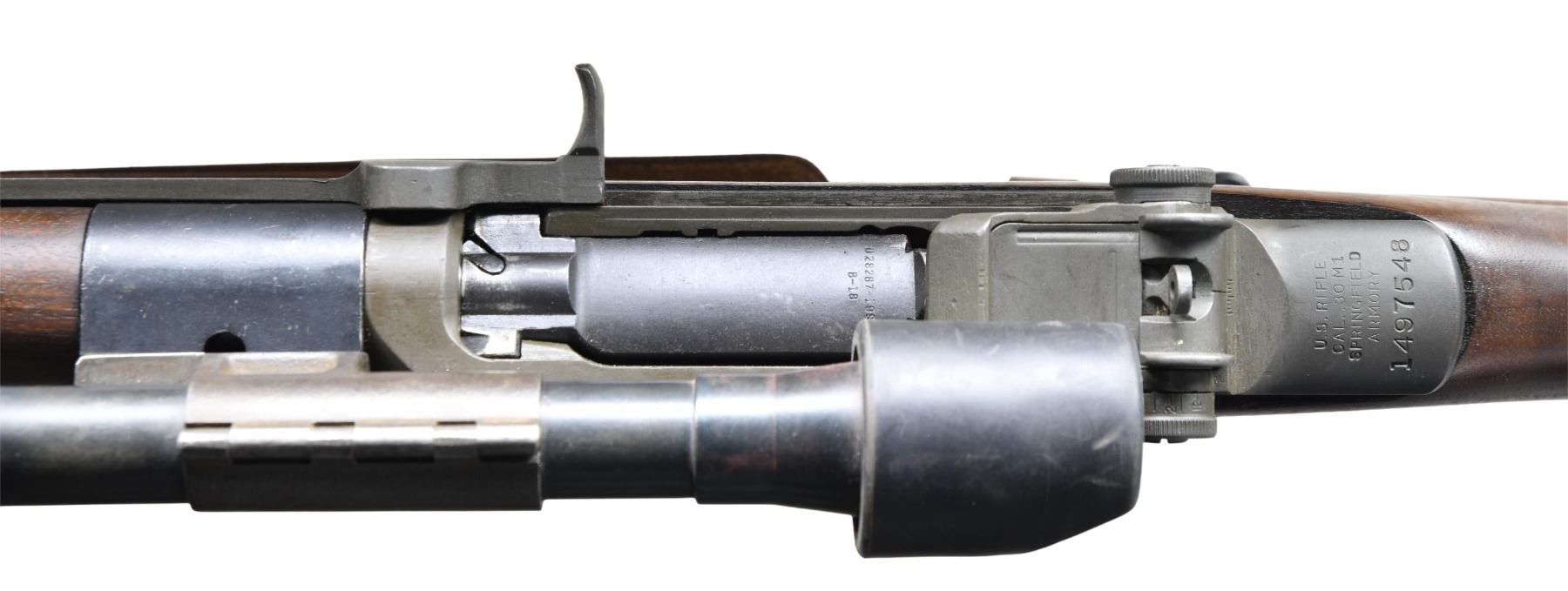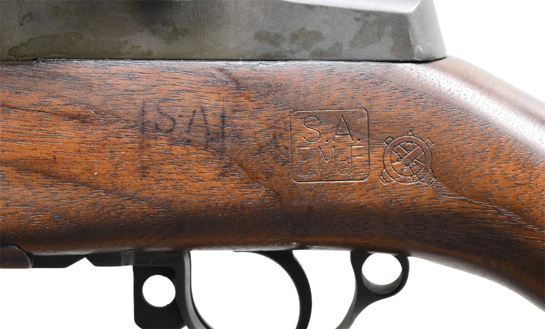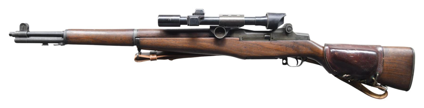 RIFLE. Cal. 30-06. S# 1497548. Bbl. 24". Bbl. is marked on right side "SA 8 63". Throat gauges: 1.0. Muzzle gauges: less than 1.0. T105E1 aperture rear sight. Blade front sight w/ protective ears. Rifle has been assembled as an M1D sniper rifle using a reproduction blued steel base & bracket. Bracket has been wire brushed for a more worn authentic appearance. Blued steel M84 scope w/ non-tapered post reticle. Nomenclature plate is not present, leaving the two retaining screws. Sliding sun shade & rubber eye cup present. Unmarked lace-on leather cheekpiece. All major parts markings are "SA". Walnut stock set. Buttstock has faint boxed "SA" & added boxed "S.A. / EMcF" & "crossed cannons". Encircled "P" proof under grip. Reproduction tan leather sling. CONDITION: stock set has arsenal rework type finish w/ light wear & handling marks. Metal retains 90% of its arsenal rework Parkerized finish. Scope has appearance of cold bluing w/ moderate wear. Optics are slightly cloudy, but serviceable. Bore has frosted appearance w/ moderately worn lands. (25-2247/RW). CURIO. $2,000-3,000.