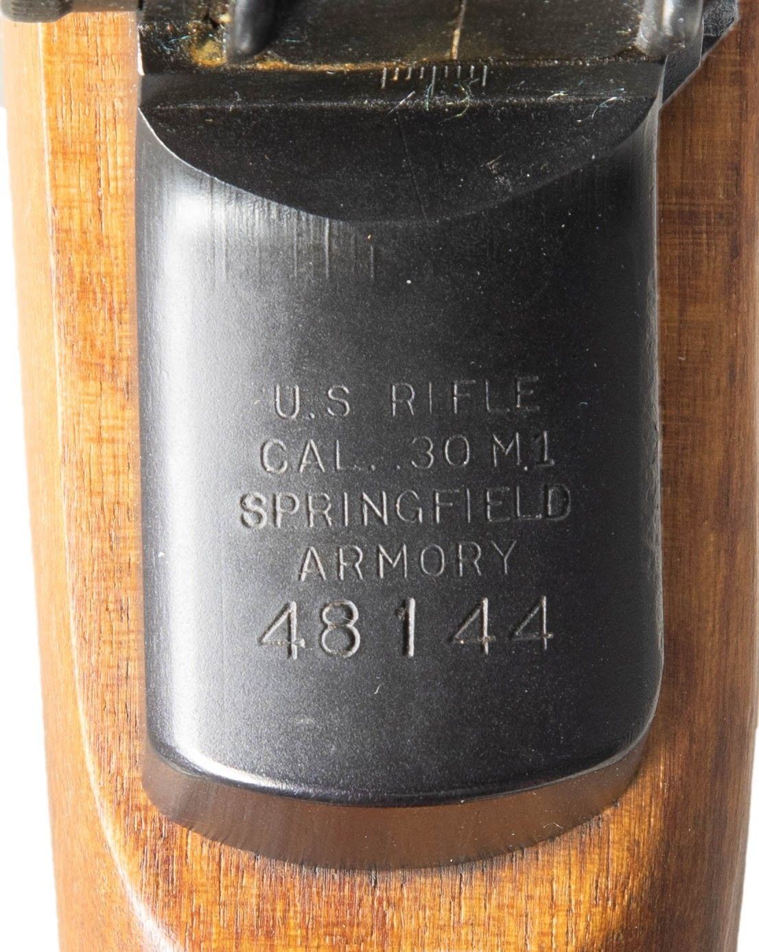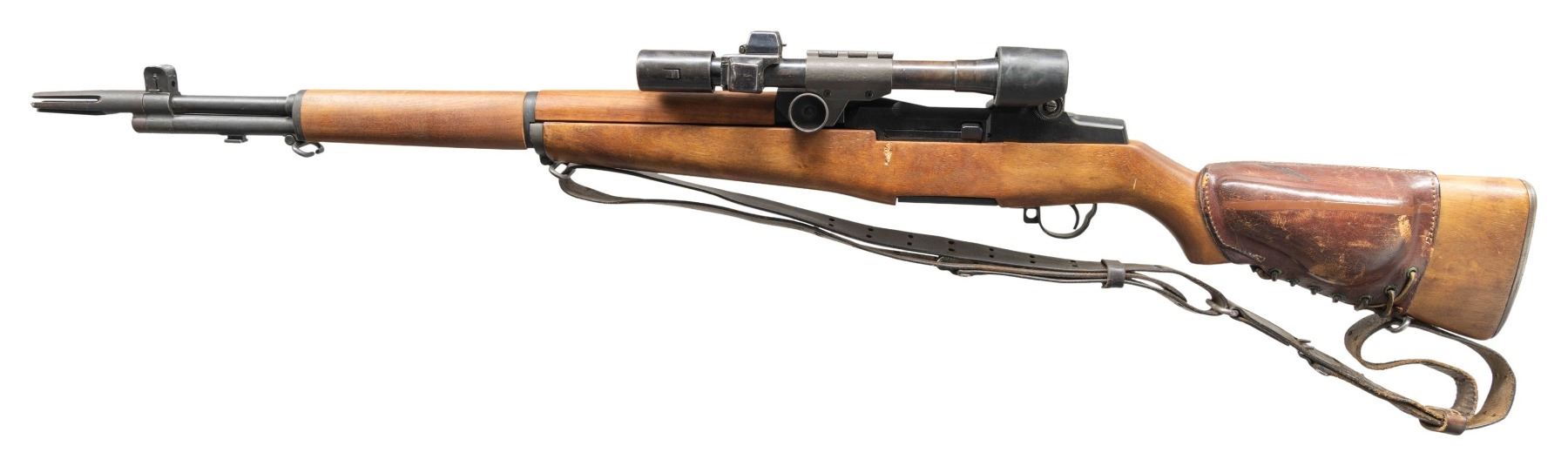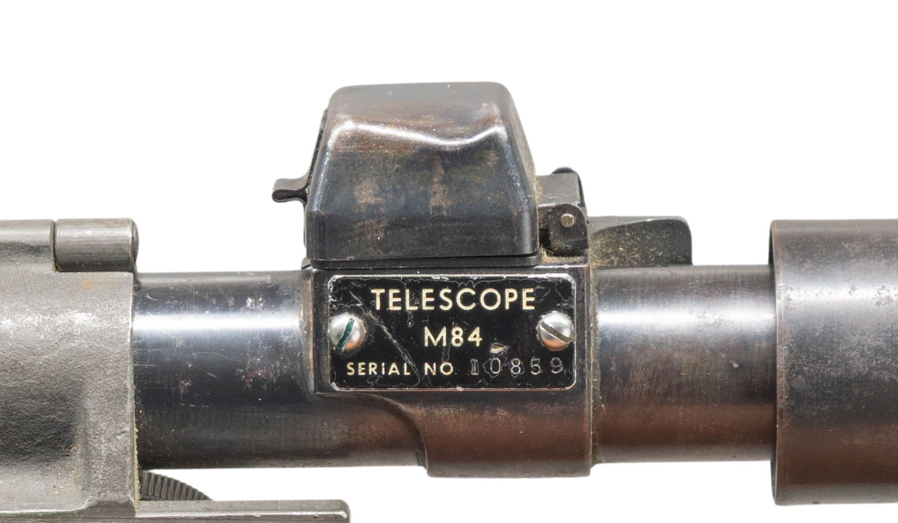 Cal. 30-06. S# 48144. Bbl. 24". Barrel is marked on the right side "S-A-3-52". Throat gauges: 2.5. Early production M1 Garand originally completed in Mid-1940 as a gas trap model, later overhauled as a M1D gas port rifle. T105E1 aperture rear sight. Front sight w/ protective ears. T-37 prong type flash suppressor. Cross slot gas cylinder lock screw. Operating rod w/ safety cut marked "SA". Bolt marked "SA". Trigger housing marked "WRA". Safety & hammer are "SA". Stamped trigger guard. Rifle is fitted w/ correct original M84 telescopic sight. Scope base has the correct four point staking on the left side. Scope mount appears original. Blued steel scope. Plate on right side of scope marked "TELESCOPE / M84 / SERIAL NO 10859". Hinged covers are present over turrets. Straight post w/ fine crosshair reticle. Sliding sunshade & correct rubber eye-cup. Unmarked replacement hardwood stock set. Brown leather lace-on cheekpiece marked faintly on the right side "MRT / 52". Cheekpiece has brown painted horizontal line on left side. Well-worn Model 1907 brown leather sling w/ steel hooks. CONDITION: stock set has light wear & scattered handling marks. Notable gouge on right side of buttstock below receiver ring. Cheek pad has wear & scuffing w/ paint overrun on right side. Pad is fastened to stock w/ silver colored Philip's screw. Stitching remains tight. Metal parts retain 90% of a dark arsenal rework parkerized finish w/ light wear. Very good shiny bore. Scope optics appear clear & serviceable except for several dark specks. (25-5329/RW). CURIO. $1,500-2,500.