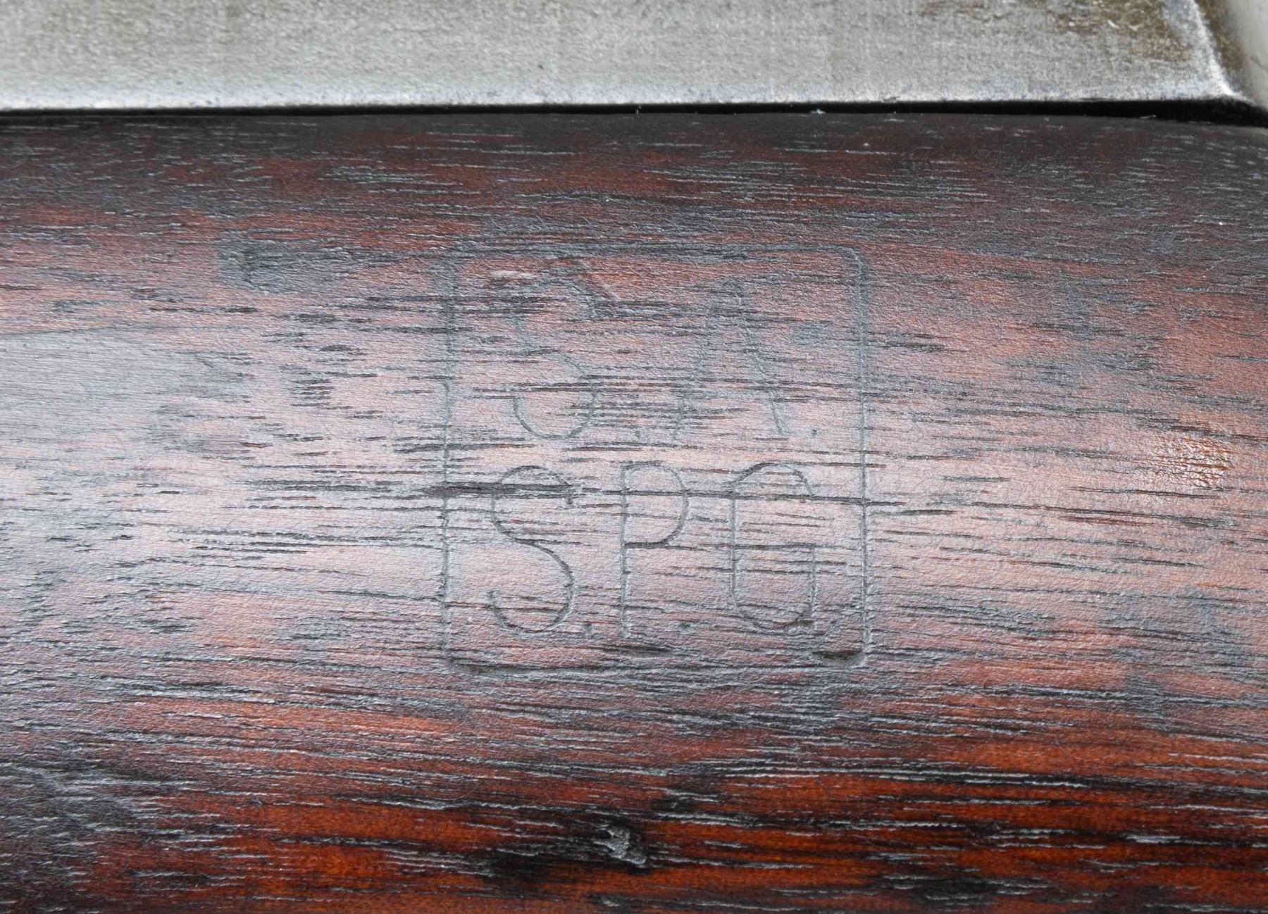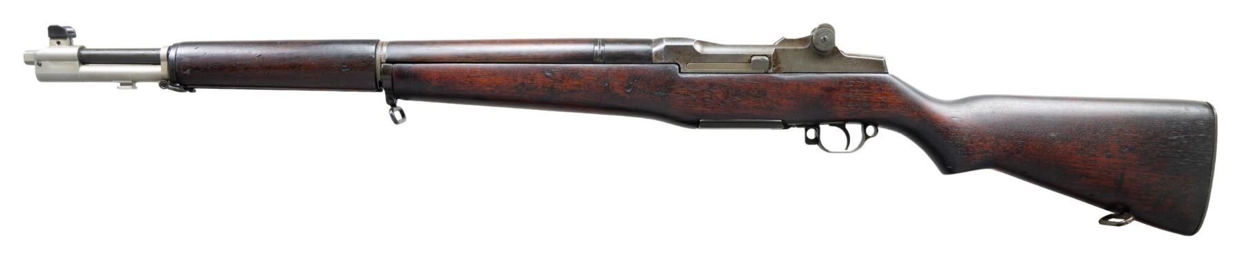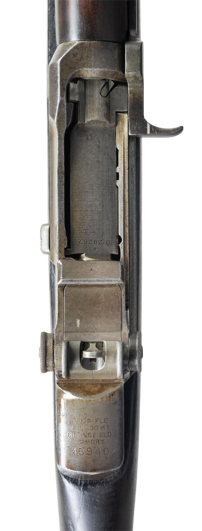 SEMI-AUTO RIFLE. Cal. 30-06. S# 45940. Bbl. 23 1/4" including custom gas trap. Bbl. markings are not present on the right side. Flush nut aperture rear sight w/ authentic "B8872" marked cover. Blade front sight w/ flared protective ears. Gas cyl. is finished bright. Receiver serial number is in correct range from April 1940 to August 1940. Receiver marked at right forward end "REP 7 / D28291-1". Receiver does not appear to have seventh rd. modification. Operating rod is marked "D35382-1-SA" w/o relief cut. Round front spring & Keystone type spring on short fork follower rod. Walnut stock set. Buttstock has been modified to eliminate the relief cut for the trap & is equipped with the solid checkered buttplate. Buttstock is marked on the right side w/ faint boxed "SA / SPG". CONDITION: stock set has worn arsenal rework finish w/ numerous handling marks. Buttstock has 1" crack behind receiver tang & crack extending 5" forward from left front corner of mag well w/ large missing chip. 2" crack w/ small missing chip on right front corner of mag. well. Metal has well worn finish turning gray w/ spots of light oxidation. Operating rod has been polished & refinished ahead of handle. Spring assembly does not allow easy function of the rifle & likely would need gunsmith attention. Bore has lightly worn lands w/ frosted appearing grooves. (25-2727/RW). CURIO. $1,500-2,250.