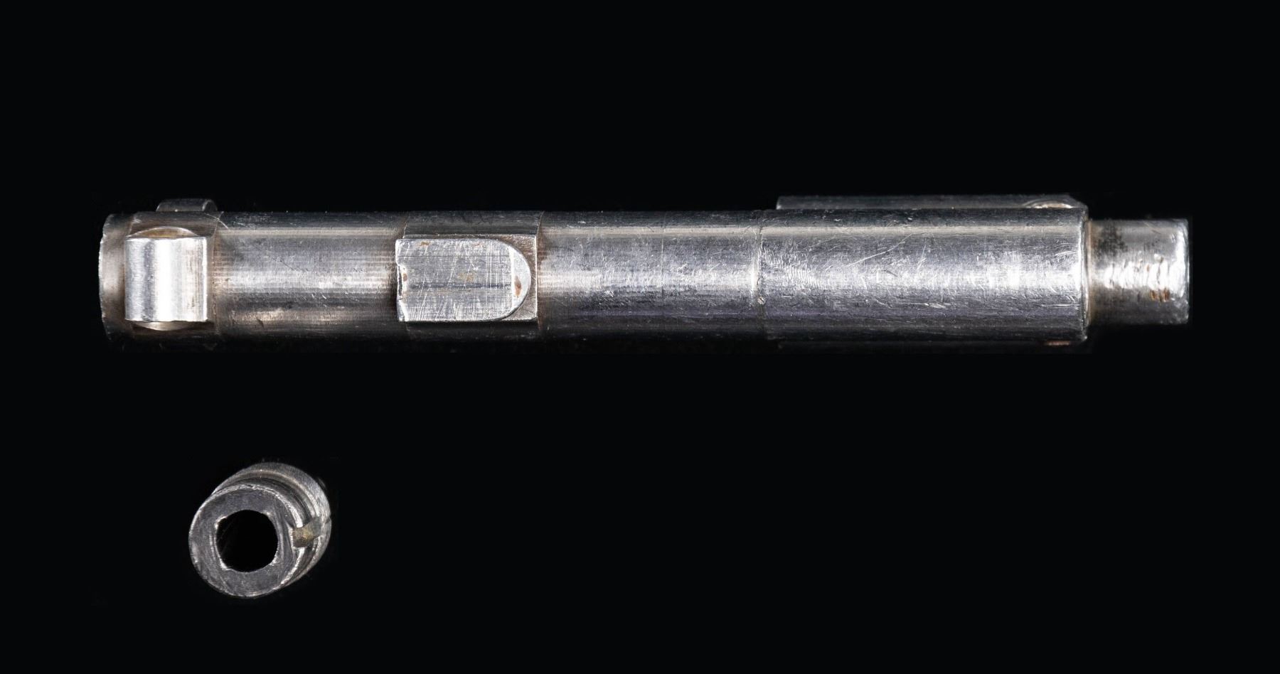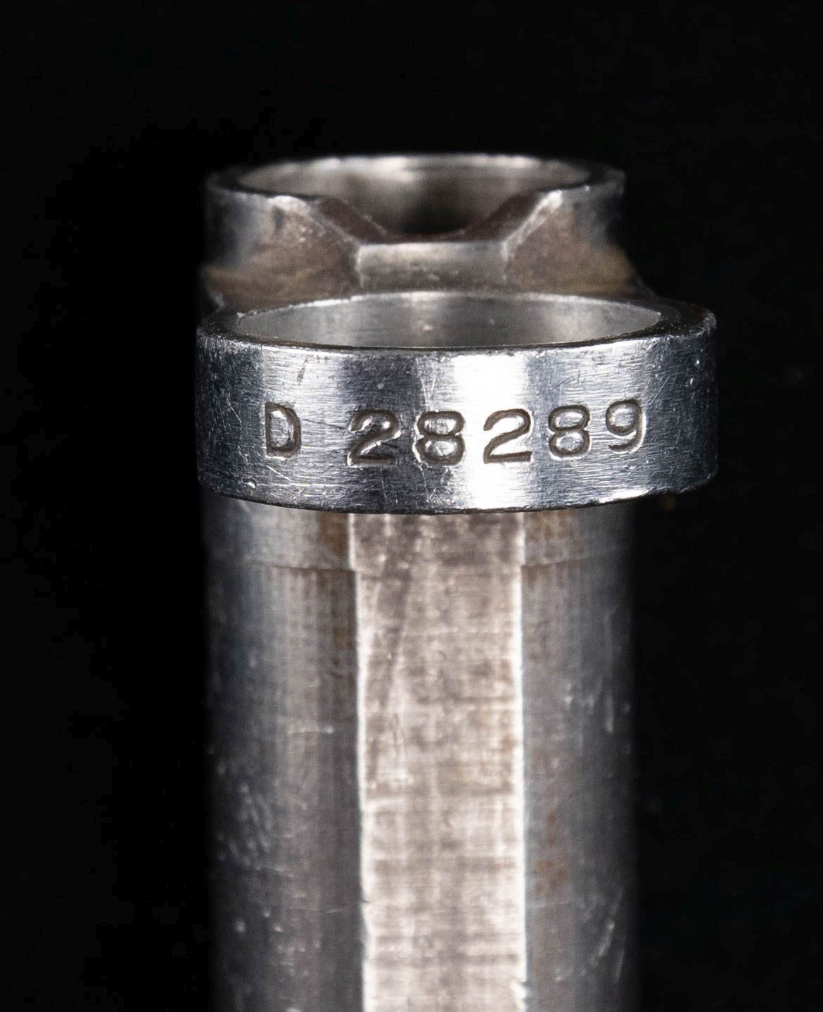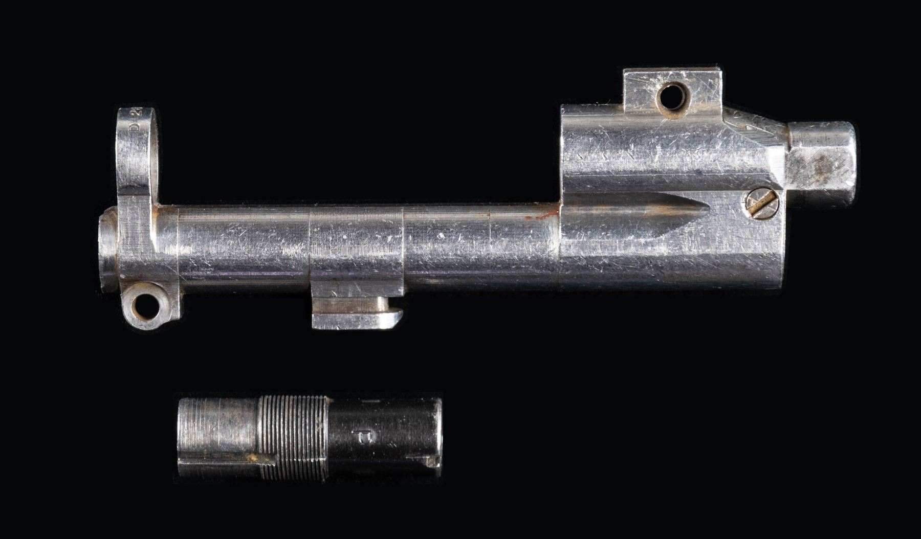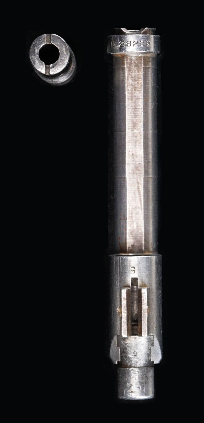 CYLINDER. Rarely offered as a stand-alone item, this gas cylinder would be an absolute necessity to restore an early gas trap M1 Garand rifle. The cylinder is marked on top of the ring with "D 28289" drawing number. The forward end of the cylinder is marked "5" on top behind the front sight mount. Gas cylinder has early type 1 flutes. The muzzle plug and its retaining screw are present. The muzzle plug is marked on top with "O". Front sight assembly and stacking swivel assembly are not present. Included in the lot is an approximately 1 7/8" length of an original barrel muzzle which includes the threaded portion. The muzzle is marked with three "P" and what appears to be a "1". CONDITION: the cylinder retains only a very small amount of its original finish in protected areas, showing the wear, scratches and handling marks commensurate with service use. The interior of the gas cylinder is smooth and shiny except for a moderate area of what appears to be carbon deposits. The muzzle plug shows a small amount of original finish, but has wear, dents and handling marks. The plug fits snugly in its recess. The barrel end with its visible rifling is notably upset on the muzzle end. (02-26033/RW). NON-GUN. $800-1,200.