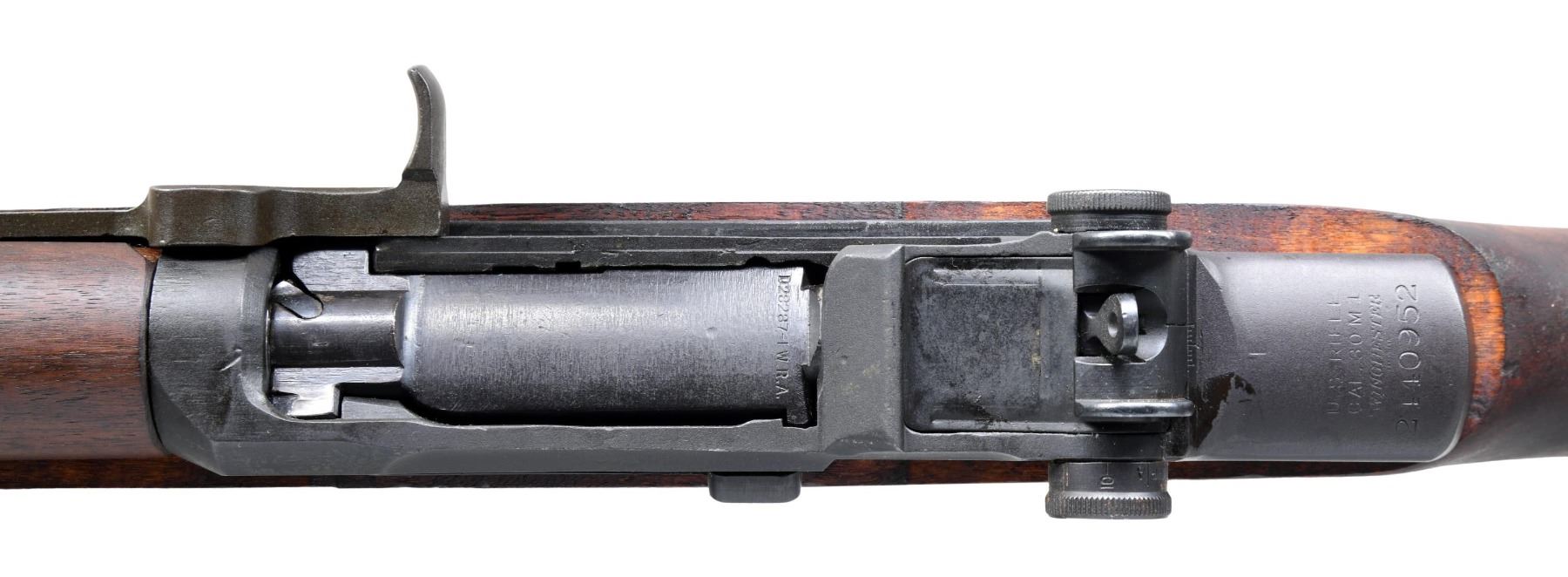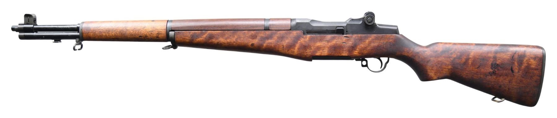 RIFLE. Cal. 30-06. S# 2440952. Bbl. 24". Replacement barrel marked on right side "LMR / 4 54". Throat gauges: 1.0. Muzzle gauges: 5.0. Barrel is marked on right side behind front sight w/ British export proofs. Receiver has been assembled using demilitarized parts. The rear portion of the receiver is marked "WINCHESTER" & the front portion is marked "B 1 5A / 'diamond' / D 28291 30" which was produced by Springfield. The receiver shows faint welded seams on both sides behind the front legs. T105 aperture rear sight, elevation knob marked "HRA". Blade front sight w/ protective ears. High hump gas cylinder lock. Bolt is marked "WRA". Operating rod, trigger housing & safety marked "SA". Stamped trigger guard. Walnut rear handguard. Front handguard & buttstock are hardwood replacements. Buttstock marked on left side w/ defense acceptance eagle & "US". Encircled "P" proof under grip. Buttstock marked on right side below comb "AA / U.S. / 60998". CONDITION: stock set has moderate wear, staining & handling marks on the replacement parts. The rear handguard appears to be in very good original condition. Metal retains 80% of its arsenal rework refinish w/ spots of missing finish. Bore has lightly worn lands & appearance of frosting in grooves. (25-1391/RW). CURIO. $800-1,000.