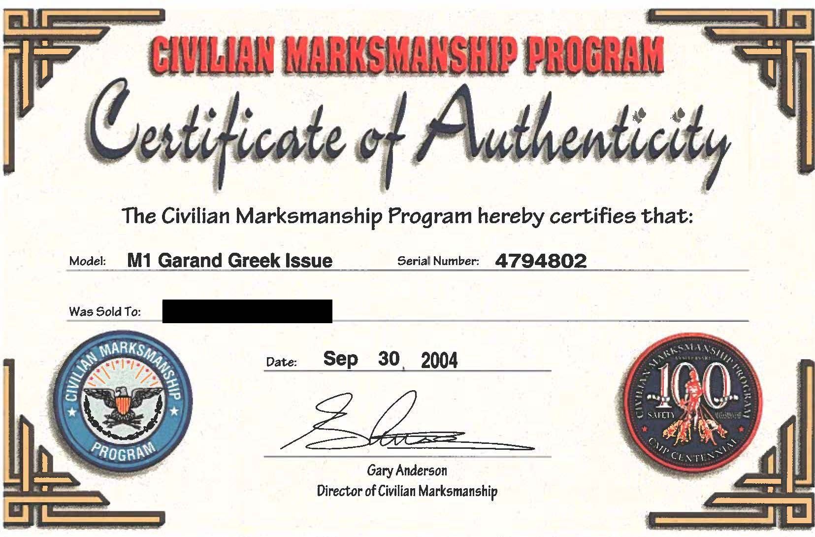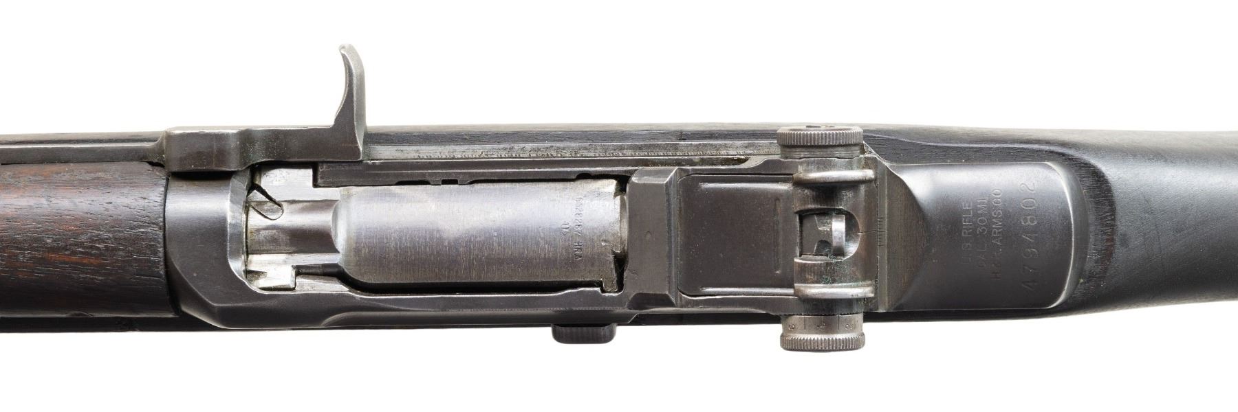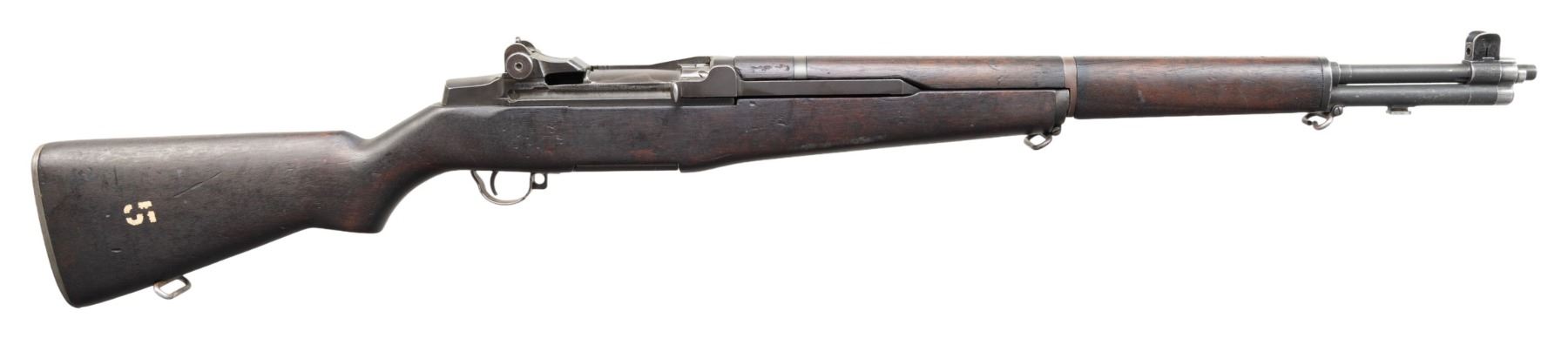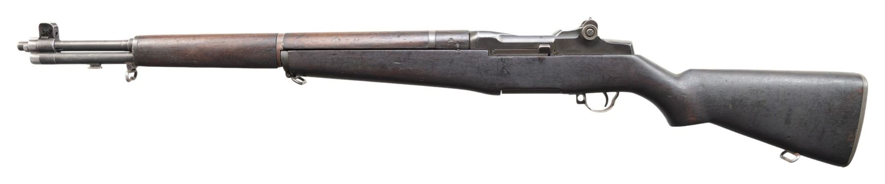 MILITARY RIFLE. Cal. 30-06. S# 4794802. Bbl. 24". Barrel marked on right side "HRA 74-54". Throat gauges 3.0. Muzzle gauges 1.0. T105E1 rear sight. Blade front sight with protective ears. Receiver and bolt are marked "HRA". Trigger housing, hammer and operating rod are marked "SA". High hump gas cylinder lock. Stamped trigger guard. Walnut stock set. Buttstock is marked only with boxed "P" proof under grip and white painted "5" rack number on right side of butt. UNATTACHED ACCESSORIES: certificate of authenticity stating the model was "M1 Garand" and "Greek Issue". Certificate is dated "2004". Also included is a receipt for serial number check dated "2020". CONDITION: stock set has moderate wear, staining and handling marks throughout. Buttstock has notably darkened appearance. Rear handguard has 1" crack on left side. Front handguard as 3" crack on top right. Metal retains 60% of its worn parkerized finish. Gas cylinder lock has turned overall gray. Stacking swivel is bent. Fair bore with worn lands turning dark. PROVENANCE: From the Buckstix Collection. (25-6487/RW). CURIO. $900-1,100.