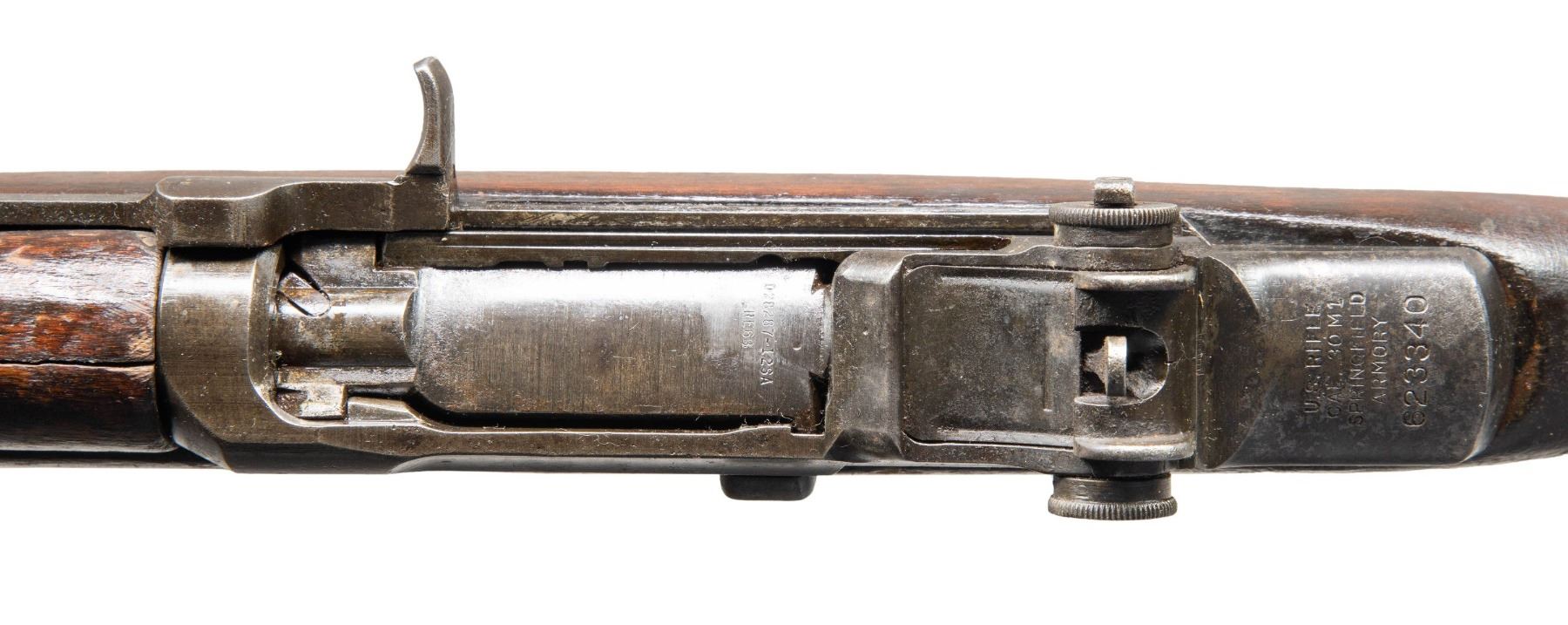 MILITARY RIFLE. Cal. 30-06. S# 623340. Bbl. 24" w/ inverted marking "S-A-4-42". Barrel appears to be period correct for 1942 manufacture date of receiver. Rifle has no visible import marks. Throat gauges 5.0. Muzzle gauges 7.0. All visible major parts markings are "SA" including operating rod w/o stress relief notch. Locking bar aperture rear sight w/ battle range elevation knob. Blade front sight w/ protective ears. Milled trigger guard. Single slot gas cyl. lock screw. Short fork follower rod. Walnut stock set. Stock set has no visible markings. CONDITION: stock set has added varnish over extensive wear, staining, handling marks & missing chips. Handguards have notably large cracks on top. Front handguard is missing two very large chips on each side at bottom. Metal turning gray & patina w/ extensive wear & numerous areas of shallow pitting throughout. Worn bore w/ extensive oxidation. (25-2676/RW). CURIO. $600-900.