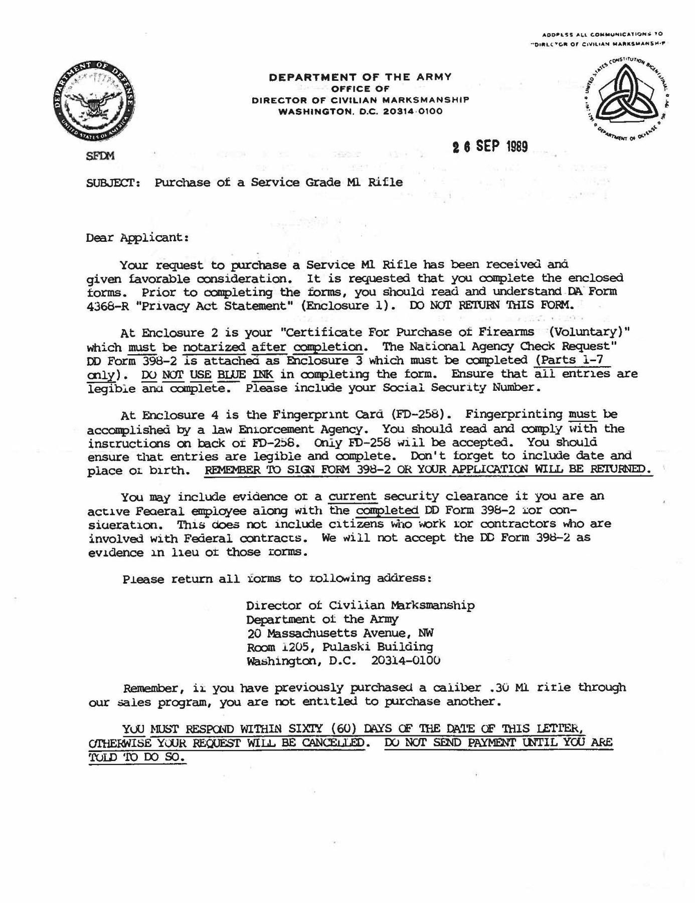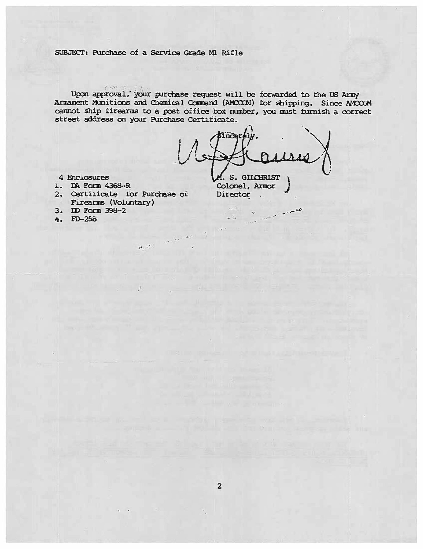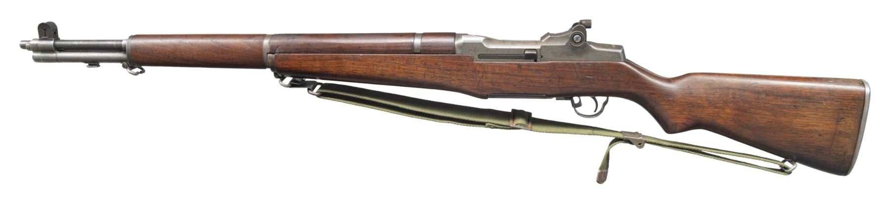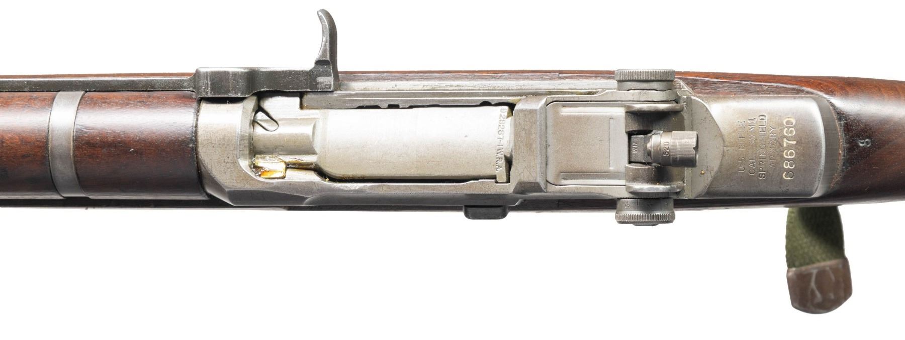 RIFLE. Cal. 30-06. S# 686760. Bbl. 24". Marked on right side "S-A-5-46". Throat gauges 2.0. Muzzle gauges 1.0. T105E1 rear sight with National Match marked adjustable aperture. National Match front sight marked "NM / 062". Bolt and safety are marked "WRA". Operating rod and trigger housing marked "SA". Operating rod does not have relief cut and should be kept for collecting purposes. Stamped trigger guard. Walnut stock set. Buttstock has very faint boxed "RIA / ?-K" on left side. Stock is also marked at top of grip with small "flaming bomb". Marked at end of grip with small "crossed cannons". Stock has been accurized by synthetic bedding material. Green web sling. UNATTACHED ACCESSORIES: cleaning rod handle in butt. Also included are DCM papers with instructions for purchasing, a letter of recommendation from Appleton Rifle & Pistol Club dated 1989, a requisitioned invoice/shipping document and a cash receipt. CONDITION: stock set has arsenal rework type finish over moderate wear, dents, scratches and handling marks. 7" repaired crack on left side of forearm. Rear handguard has 2" crack on left side. Front handguard has 2" crack on top rear. Metalwork retains 50% of its worn thinning arsenal rework parkerization. Very good shiny bore. PROVENANCE: From the Buckstix Collection. (25-6472/RW). CURIO. $1,000-1,500.