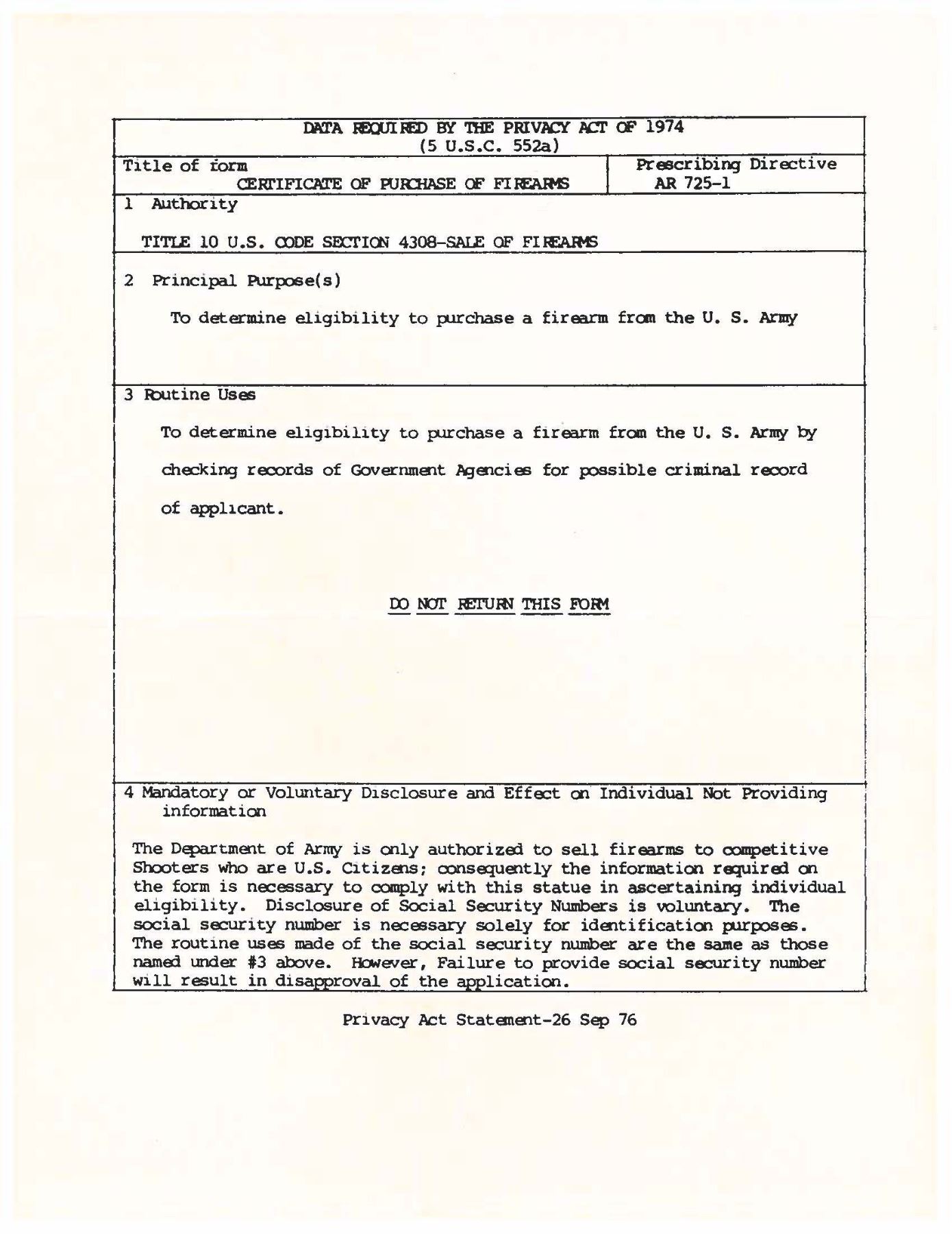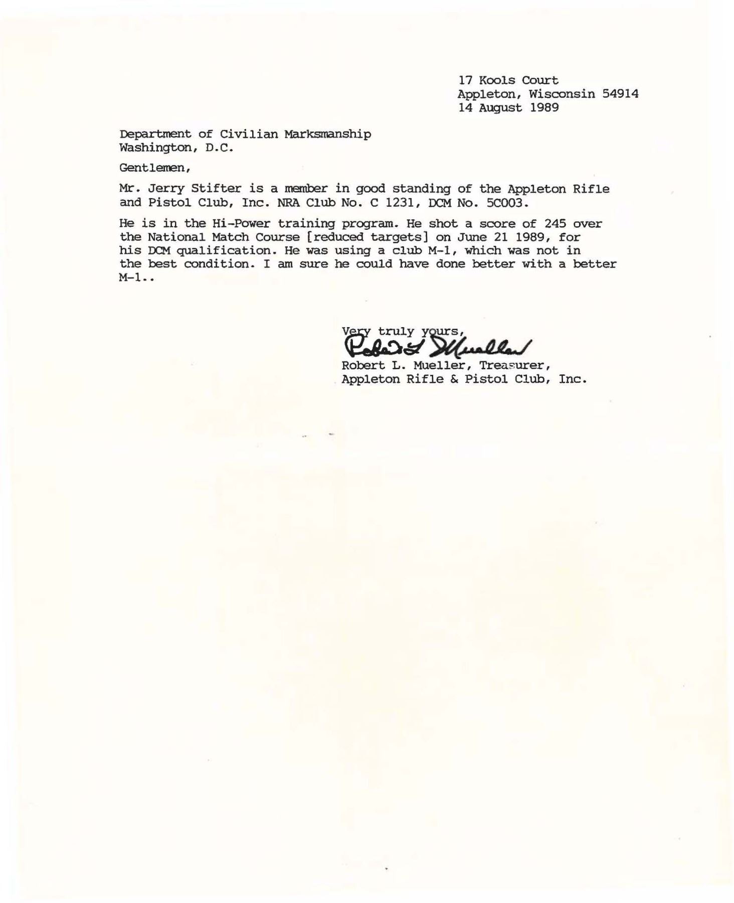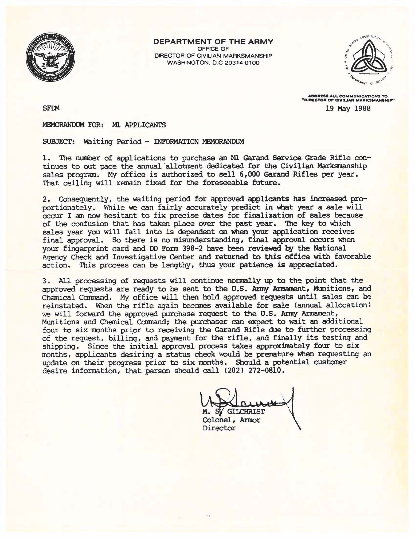 RIFLE. Cal. 30-06. S# 686760. Bbl. 24". Marked on right side "S-A-5-46". Throat gauges 2.0. Muzzle gauges 1.0. T105E1 rear sight with National Match marked adjustable aperture. National Match front sight marked "NM / 062". Bolt and safety are marked "WRA". Operating rod and trigger housing marked "SA". Operating rod does not have relief cut and should be kept for collecting purposes. Stamped trigger guard. Walnut stock set. Buttstock has very faint boxed "RIA / ?-K" on left side. Stock is also marked at top of grip with small "flaming bomb". Marked at end of grip with small "crossed cannons". Stock has been accurized by synthetic bedding material. Green web sling. UNATTACHED ACCESSORIES: cleaning rod handle in butt. Also included are DCM papers with instructions for purchasing, a letter of recommendation from Appleton Rifle & Pistol Club dated 1989, a requisitioned invoice/shipping document and a cash receipt. CONDITION: stock set has arsenal rework type finish over moderate wear, dents, scratches and handling marks. 7" repaired crack on left side of forearm. Rear handguard has 2" crack on left side. Front handguard has 2" crack on top rear. Metalwork retains 50% of its worn thinning arsenal rework parkerization. Very good shiny bore. PROVENANCE: From the Buckstix Collection. (25-6472/RW). CURIO. $1,000-1,500.