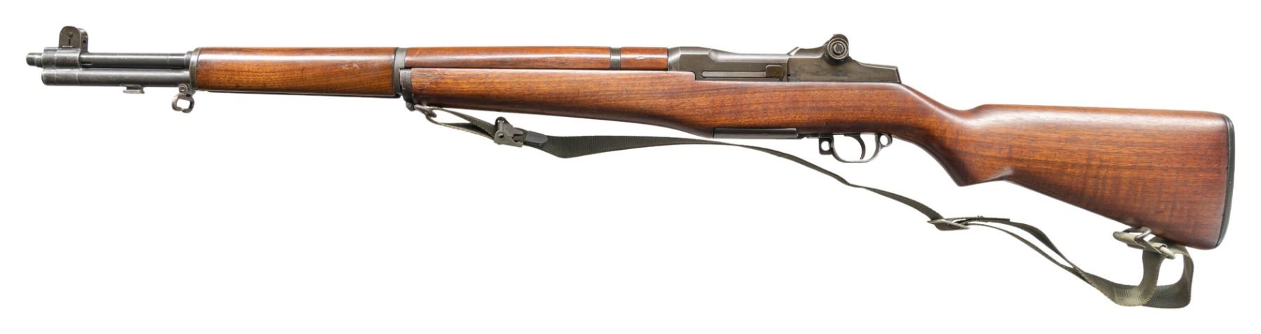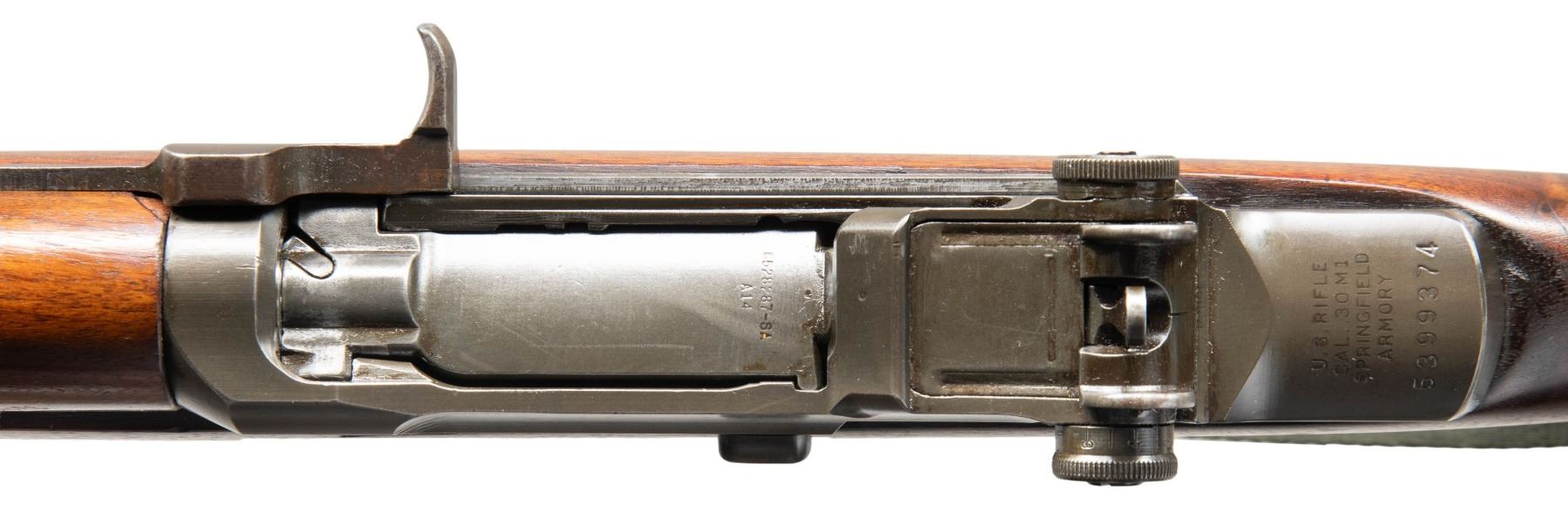 Cal. 30-06. S# 5399374. Bbl. 24". Throat & muzzle gauge 2.0. Barrel markings include "SA?8 54". T105E1 aperture rear sight. Blade front sight w/ protective ears. All major parts markings are "SA". High hump gas cylinder lock. Milled trigger guard. Walnut stock set. Green nylon Vietnam era sling. CONDITION: stock set has been given a professional quality refinish. Lightly worn w/ scattered handling marks, having a slight loss of wood in inletted areas. Notable filled blemish on the left side of the rear handguard. Barrel band has been drilled for accurizing screws which are not installed. Metal has a lightly worn restorative parkerized finish, except for the well-worn trigger guard assembly. Bore has lightly worn lands w/ frosted grooves. (25-4714/RW). CURIO. $800-1,200.