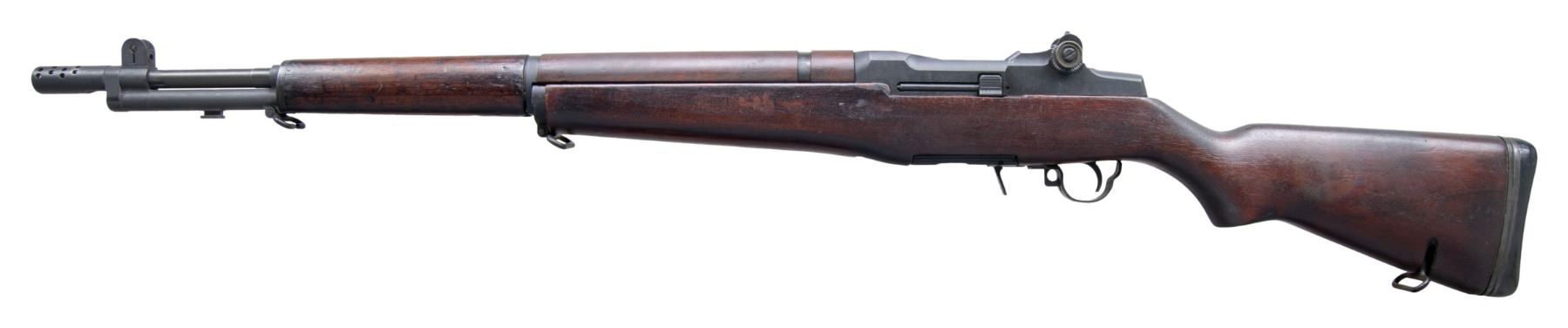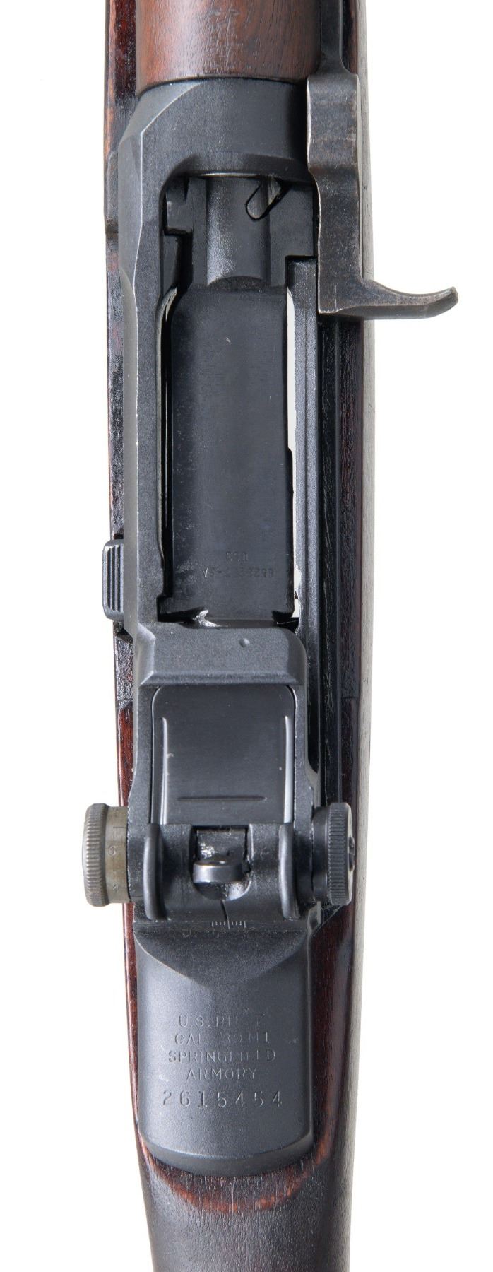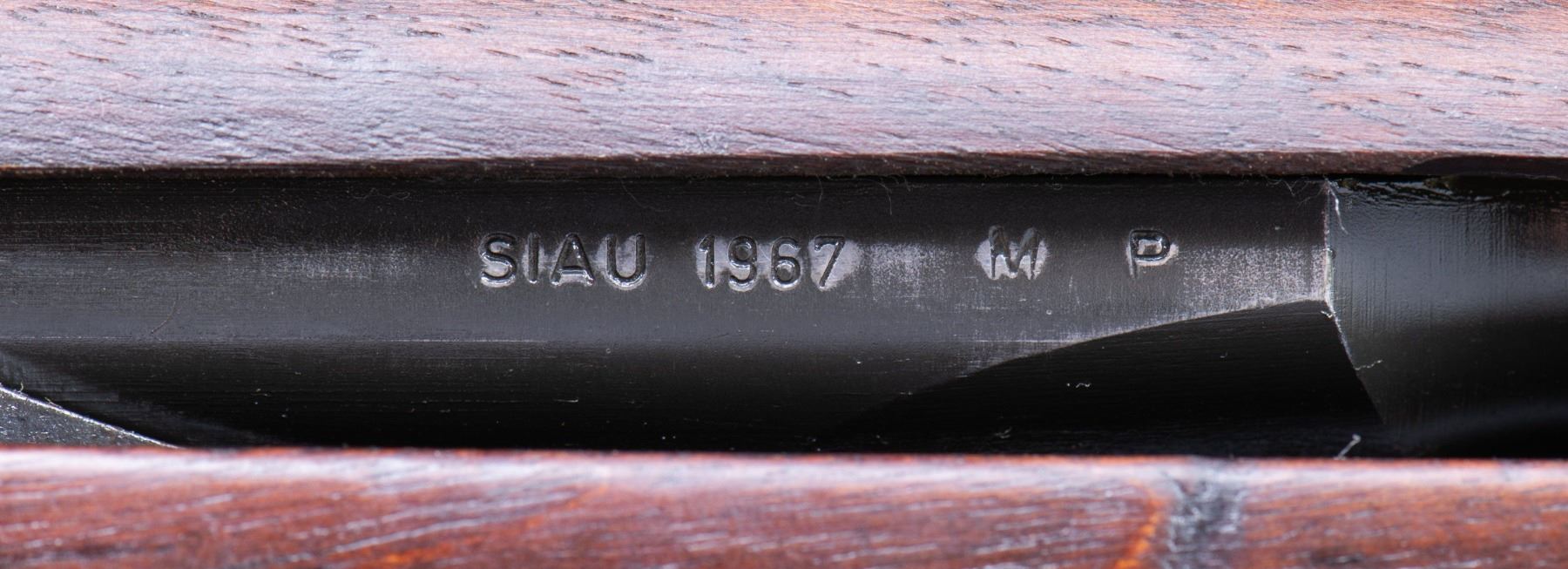 Cal. 7.62mm NATO. S# 2615454. Bbl. 25" including original compensator. Bbl. is marked on right side "SIAU 1967 MP". T105E1 aperture rear sight. Blade front sight w/ protective ears. Rifle was converted by Beretta in Italy using a US 1944 Springfield receiver & Italian made 7.62 NATO bbl. Receiver was not modified for selective fire. The trigger housing electro-penciled to match is marked "FB BM59 HRA". Trigger housing was modified to accept a BM59 detachable magazine which is not present with this example. The Springfield marked operating rod is additionally marked on the right side w/ "7.62mm/2". The bolt is marked "SA". Walnut stock set. Buttstock has the added solid rubber buttplate w/ sliding trap. Pivoting rear swivel. Buttstock has wood filler block on both sides at the right forward end of the receiver to convert a select fire stock back to its original configuration. CONDITION: stock set has moderate wear, staining & handling marks throughout. Metal retains 75% of its arsenal rework parkerized finish w/ thinning & light wear. Very good shiny bore w/ sharp lands. (25-2711/RW). CURIO. $1,000-1,500.