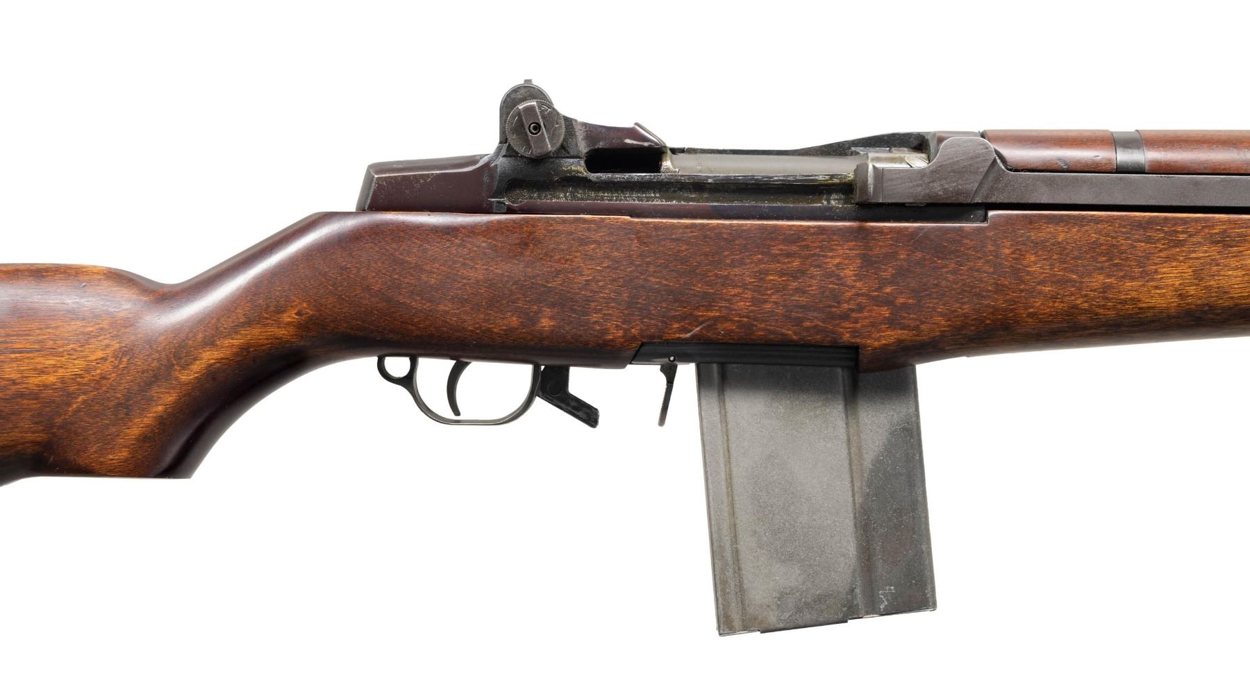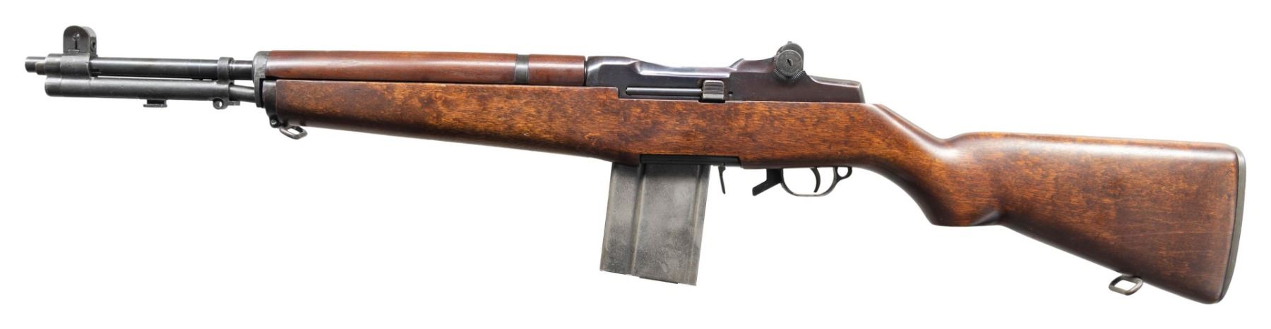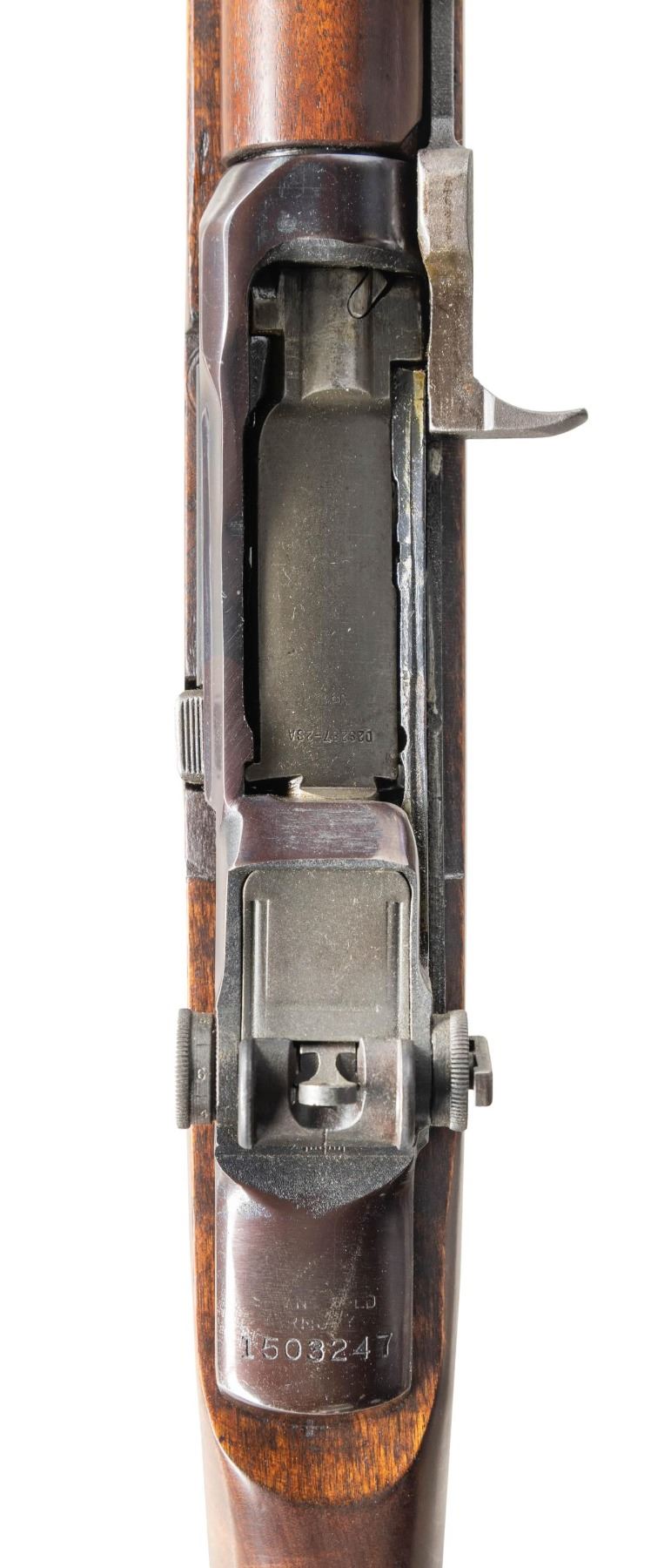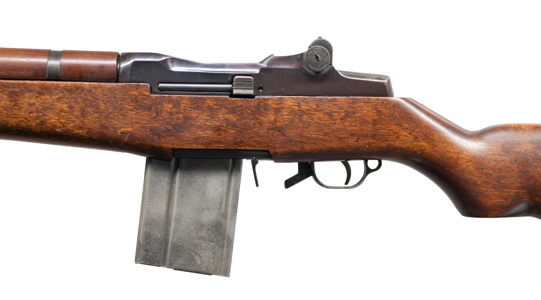 CONVERSION. Cal. 30-06. S# 1503247. Bbl. shortened to 17 3/8", converted to 308 Win. Barrel is marked on right side "3 S A 11 44". Receiver shows evidence of welds in the right and left rails and is likely assembled from de-milled parts. Receiver has been given a BM59 style conversion to hold a U.S. M14 magazine. The trigger housing assembly has been likewise modified w/ a magazine catch. Trigger housing & hammer marked "WRA". Beretta style safety. Milled trigger guard. Locking bar aperture rear sight. Blade front sight w/ protective ears. Operating rod has been modified & shortened marked "WRA" w/ safety cut. Clip latch has been replaced by a "PB" marked hold-open & receiver modified to accept this part. Hardwood stock set. Buttstock is unmarked w/ standard trap buttplate. Walnut handguard. Milled barrel band secured by Cotter pin. Stacking swivel is not present. MAGS: 1 unmarked 20 round detachable. CONDITION: refinished stock has light wear, scratches & handling marks. Receiver has been heavily polished & blued. Bolt has original wartime parkerized finish. Very good shiny two groove bore. (25-2936/RW). MODERN. $800-1,200.