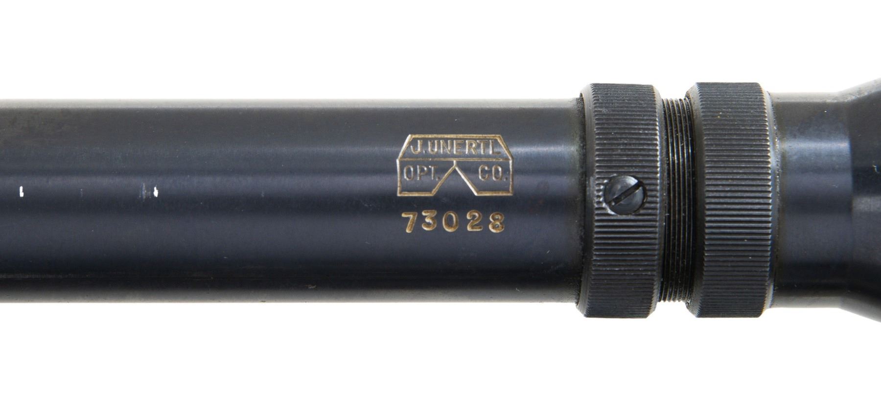 Cal. 30-06. S# 1312233. Bbl. 24". Replacement bbl. is marked "HS / flaming bomb / 9-44". Rifle has been assembled to replicate the Model 1903A1 sniper rifle using a receiver manufactured in 1929. It is equipped w/ a Remington made 03A3 bolt which has been electro-penciled to match. The rear sight base is the Remington produced type w/o lightening cuts. Ladder rear sight w/o volley notch graduated to 2,850 yards. Blade front sight. The rifle is equipped w/ a Unertl 12 power 7/8" tube target scope in aluminum Unertl marked mounts. Scope has adjustable objective lens & fine crosshair reticle. Bolt cannot be operated with scope installed as bolt handle will not clear scope. Scope return spring is not present. Handguard has been modified to accept the front scope block w/ professional workmanship. 1903A3 full pistol grip walnut buttstock. Stock w/ two recoil bolts is unmarked, except for "K" in cutoff recess indicating Keystone manufacture. All milled furniture except butt swivel. Fine checkered trap buttplate. CONDITION: stock set has light wear w/ a moderately worn refinish showing scattered handling marks throughout. Metal parts show approx. 70% of their mix of blued & parkerized finishes. Scope retains a large degree of its original blue finish w/ thinning, light wear & scattered tiny handling marks. Very good shiny bore w/ sharp lands. (25-2714/RW). CURIO. $800-1,200.