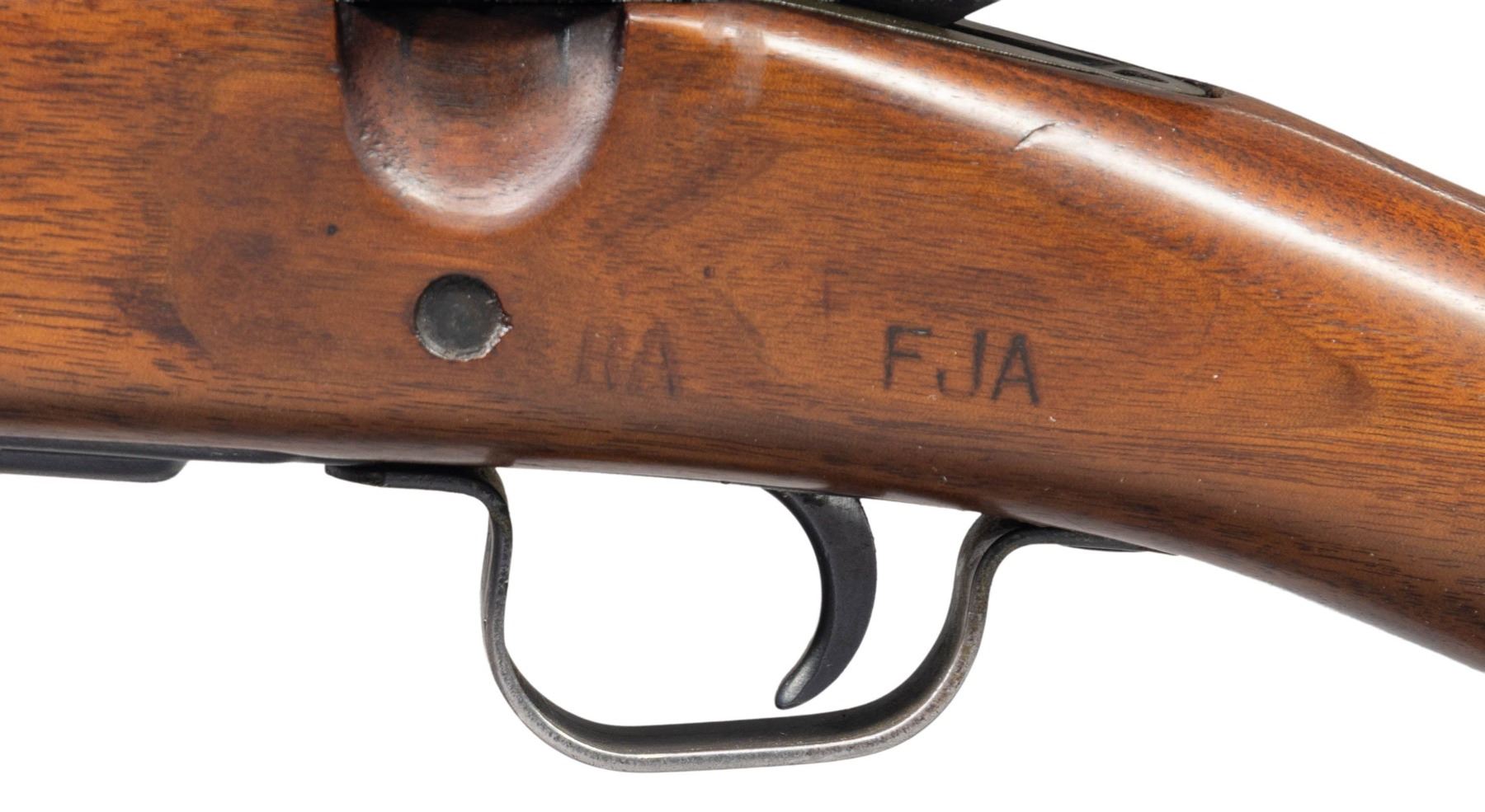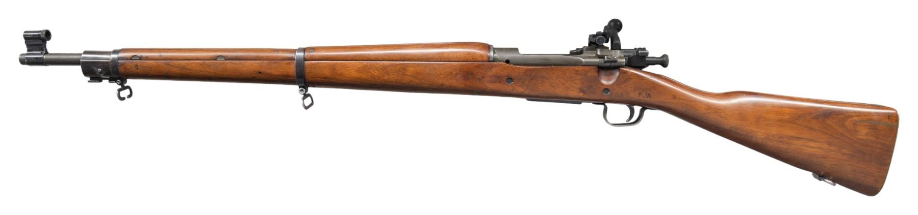 RIFLE. Cal. 30-06. S# 4021829. Bbl. 24". Two groove barrel marked "RA / flaming bomb / 9-43" behind front sight. Rifle modified with target sighs. Lyman 48 rear sight with small knobs graduated to 125 points. 7/8 OD sight aperture. Sight numbers are matching. Front sight fixed base has been blued. Movable base replaced with Lyman target aperture front sight. Model 1903A3 bolt marked on top of handle "R2". Cutoff marked "R". All stamped furniture including fine checkered trap buttplate and large bow trigger guard. Walnut stock set. Stock set has visible "RA FJA" on left side and encircled "P" proof under grip. Assembly marked partly visible ahead of trigger guard. CONDITION: stock set has gloss type refinish with numerous spots of gray colored wooden filler. Metal has perfect mix of blue and parkerized finish with thinning and moderate wear. Sling swivel on lower band retained by hex nut. Bore has lightly worn frosted appearance. PROVENANCE: From the Buckstix Collection. (25-6478/RW). CURIO. $700-900.