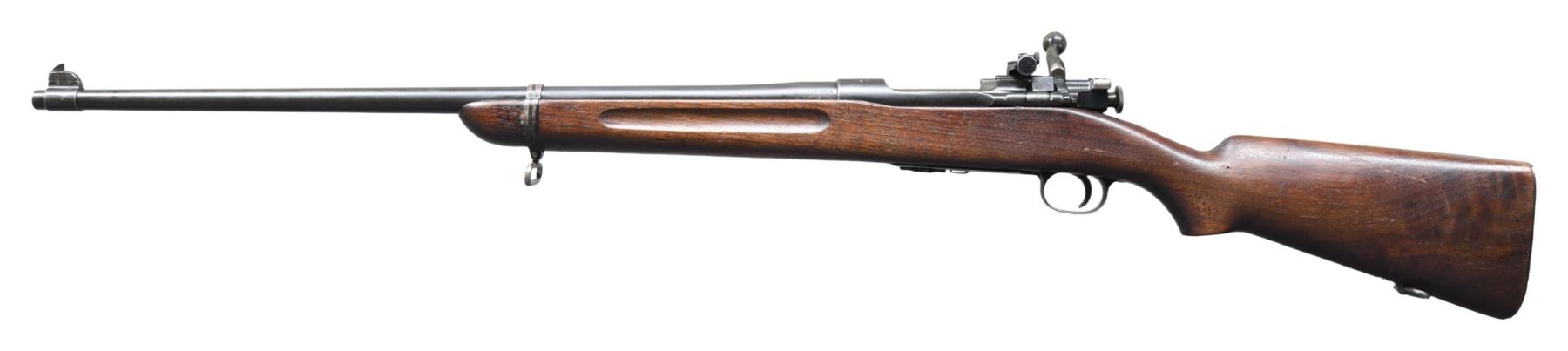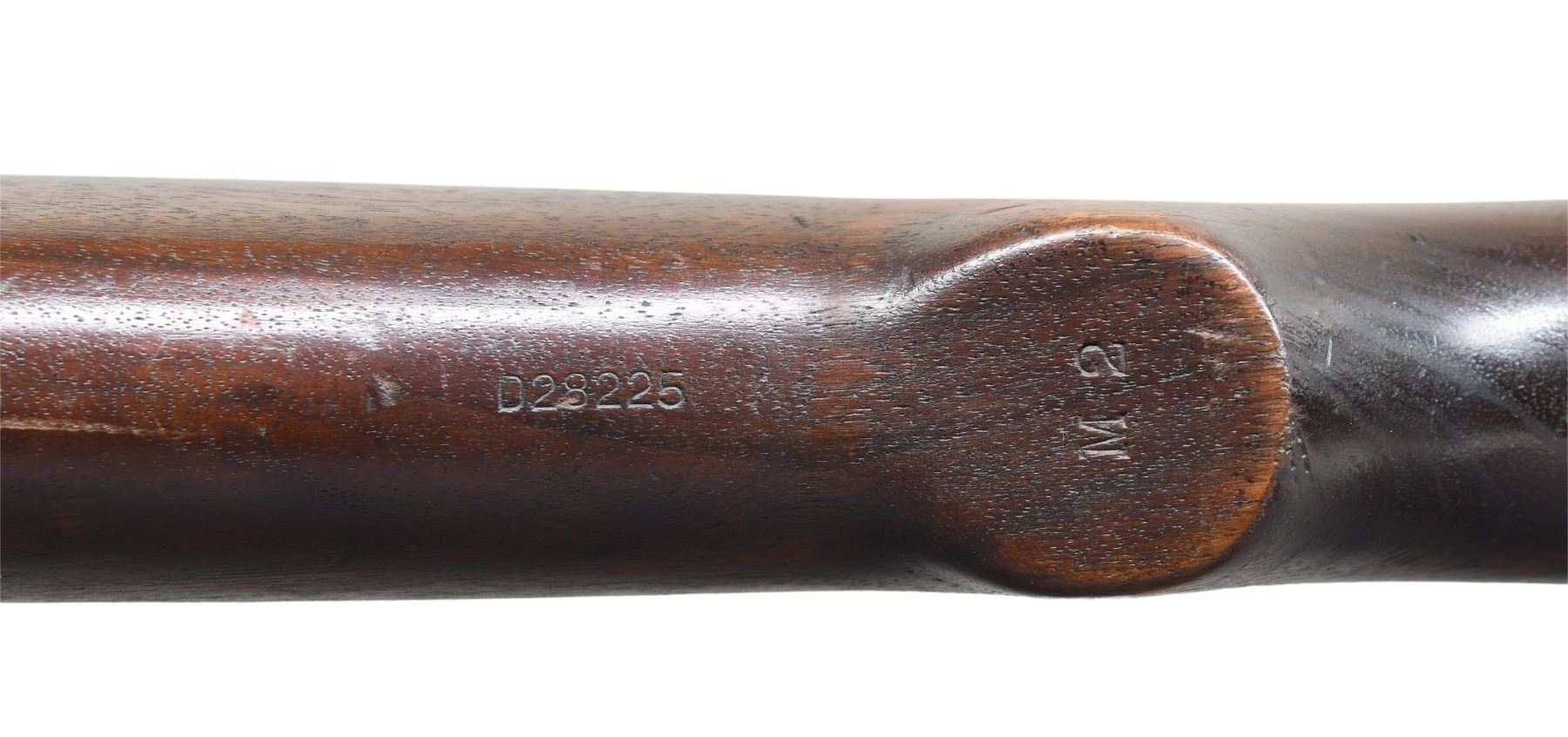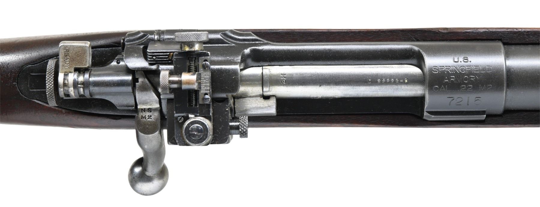 RIFLE. Cal. 22 LR. S# 7215. Bbl. 24 1/2". Barrel is marked behind front sight "SA / flaming bomb / 6-37". Receiver ring is marked on top "U.S. / SPRINGFIELD / ARMORY / CAL. .22 M2 / 7215". Lyman 48 rear sight. Sight slide is graduated 125 points. Sight has non-matching serial numbers. Blade front sight. Bolt is marked w/ drawing number "D 28223-2 / M2". Bolt handle marked on top "NS / M2". Knurled cocking piece. Walnut stock w/ grasping grooves. Stock is equipped w/ checkered steel buttplate w/o trap. Stock marked M2 on end of pistol grip. Drawing number "D 28225". MAGS: 1 detachable 5 rd. marked "M2". CONDITION: stock has moderately worn original finish w/ numerous handling marks & scattered small missing chips. Metal retains 90% of its original dull blue finish w/ light wear. Very good shiny bore. (25-2953/RW). CURIO. $700-1,100.