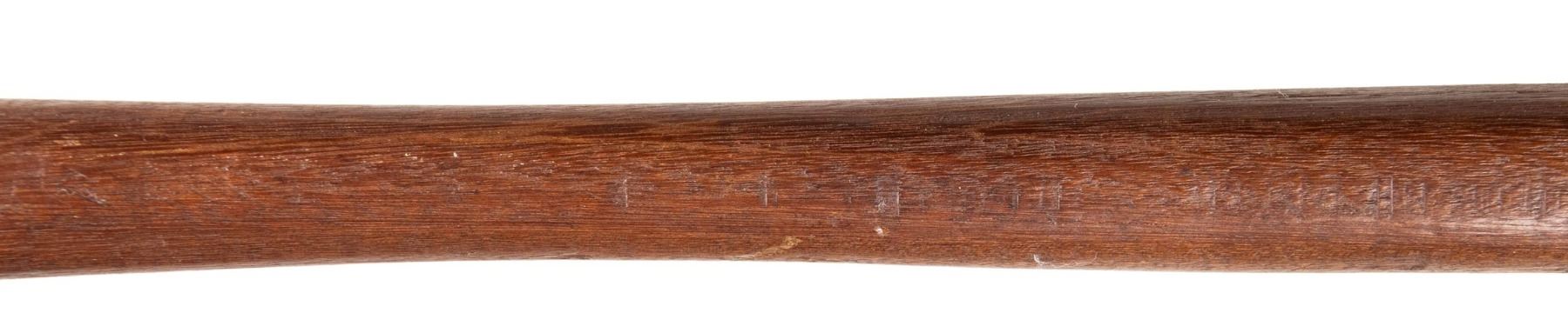 BAYONET TRAINER. This interesting trainer is described on pages 104 and 105 of "The Springfield 1903 Rifles by Brophy". The book refers to the 1913 manual of the bayonet which describes the use of this wooden rifle which was used in conjunction with gloves, masks and plastrons. The issue "RIA" marked wooden rifles appear to be manufactured from dense mahogany. The "rifle" measures approximately 59 3/4" overall. 1 5/8" thick. Prominently marked "R.I.A. / 1914" on the left side and "7" on the right side. The outline resembles a rifle with a bayonet, while the bayonet has a rounded leather-covered pad affording some protection to the victim. The "rifle" is reinforced with three vertical iron rivets and interestingly has a grasping groove on one side only in the forend area. CONDITION: trainer is in very good condition with light wear and handling marks. There are scattered age cracks running lengthwise with the grain. The buttstock has more notable fine cracks throughout. Leather pad has light wear and scuffing. PROVENANCE: From the BuckStix Collection. (02-26027/RW). NON-GUN. $400-600.