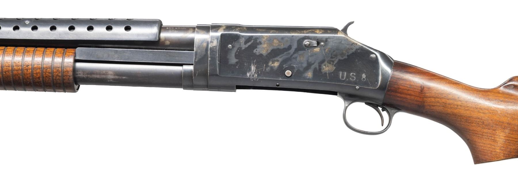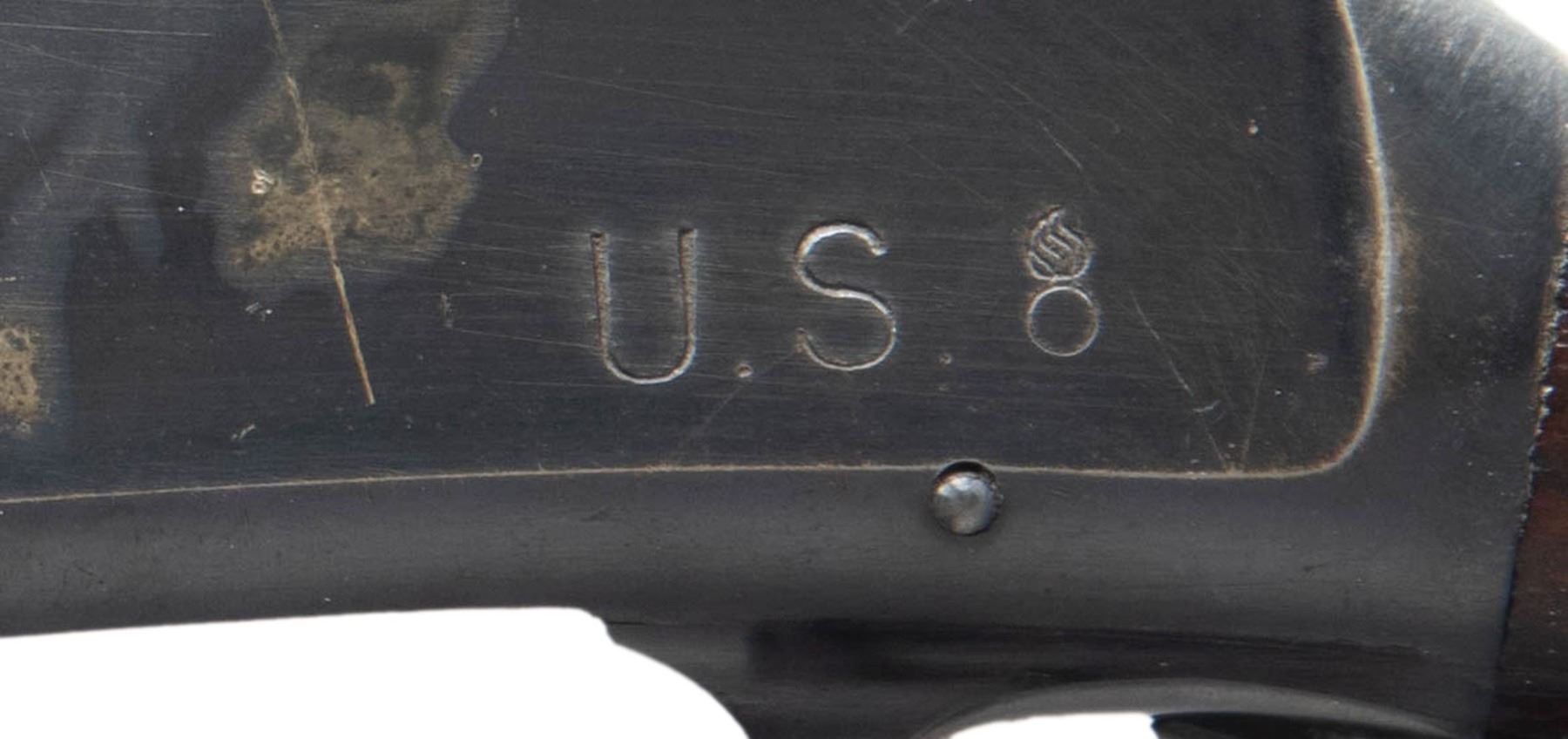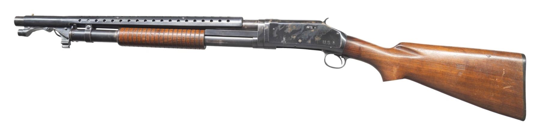 Cal. 12 ga, 2 3/4". S# E936759. Bbl 20" of takedown style with cylinder bore is drilled for a standard bead sight. Top of bbl has flaming bomb acceptance mark. Left side of receiver is marked "U.S." followed by the flaming bomb. Original configuration appears to be riot gun converted to trench gun style with addition of a handguard and bayonet lug. Aftermarket style four row handguard affixed by welding to the bayonet lug. Handguard has a large brass bead. Small round grooved forearm and post war pistol grip stock and buttplate. Left side of stock has "W.B." inspector over a cross cannon acceptance mark. Mfg. 1948. CONDITION: over 80% original blue showing edge and slide wear with spotted finish loss and scratches mostly on the left side of action. Original wood finish shows wear with scratches, dents and marks. Sound mechanics. Very good bright bore. (25-5465/DS). CURIO. $1,500-2,250.