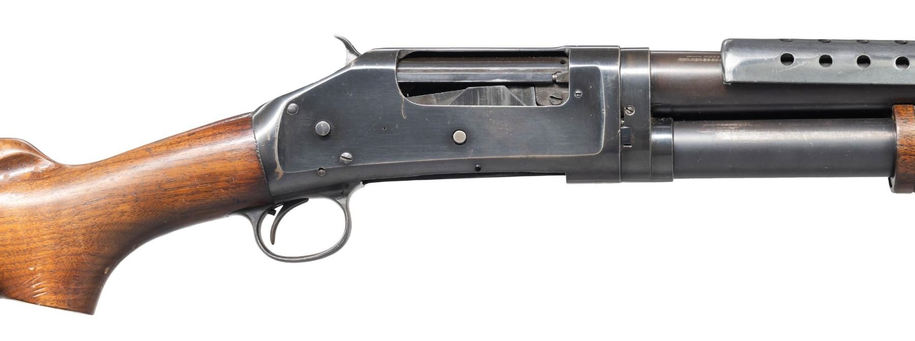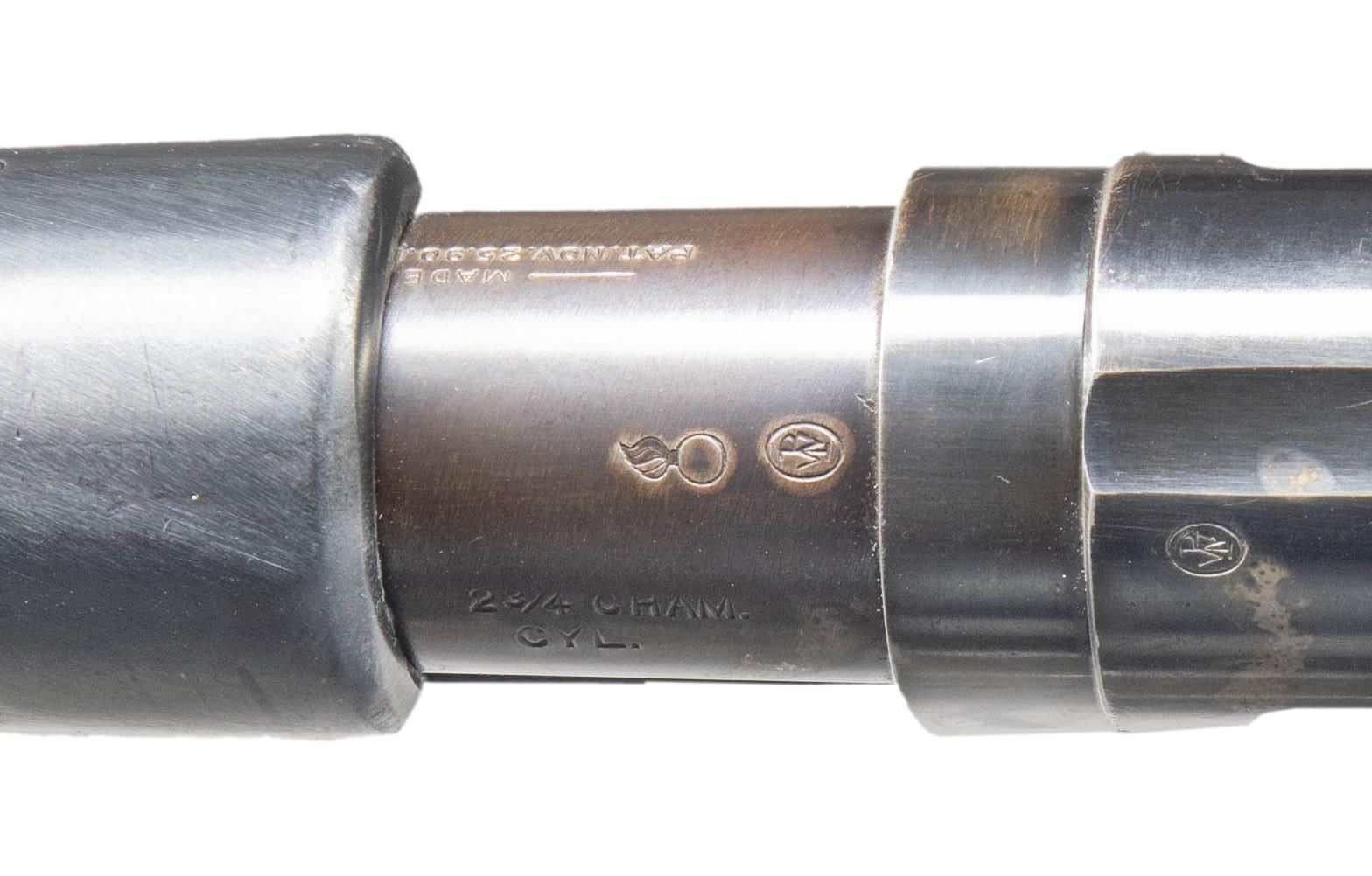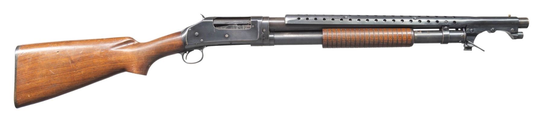Cal. 12 ga, 2 3/4". S# E936759. Bbl 20" of takedown style with cylinder bore is drilled for a standard bead sight. Top of bbl has flaming bomb acceptance mark. Left side of receiver is marked "U.S." followed by the flaming bomb. Original configuration appears to be riot gun converted to trench gun style with addition of a handguard and bayonet lug. Aftermarket style four row handguard affixed by welding to the bayonet lug. Handguard has a large brass bead. Small round grooved forearm and post war pistol grip stock and buttplate. Left side of stock has "W.B." inspector over a cross cannon acceptance mark. Mfg. 1948. CONDITION: over 80% original blue showing edge and slide wear with spotted finish loss and scratches mostly on the left side of action. Original wood finish shows wear with scratches, dents and marks. Sound mechanics. Very good bright bore. (25-5465/DS). CURIO. $1,500-2,250.