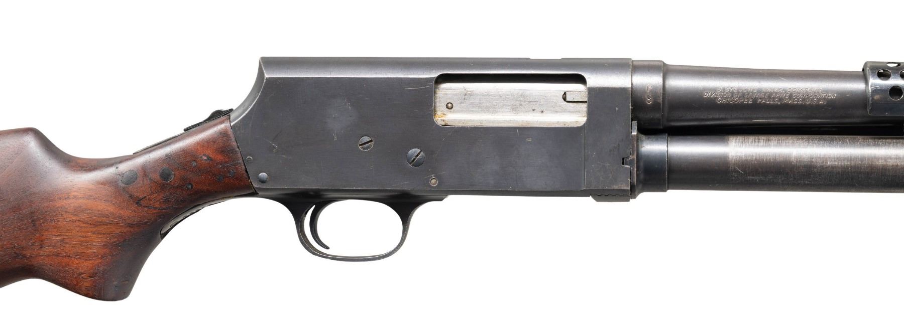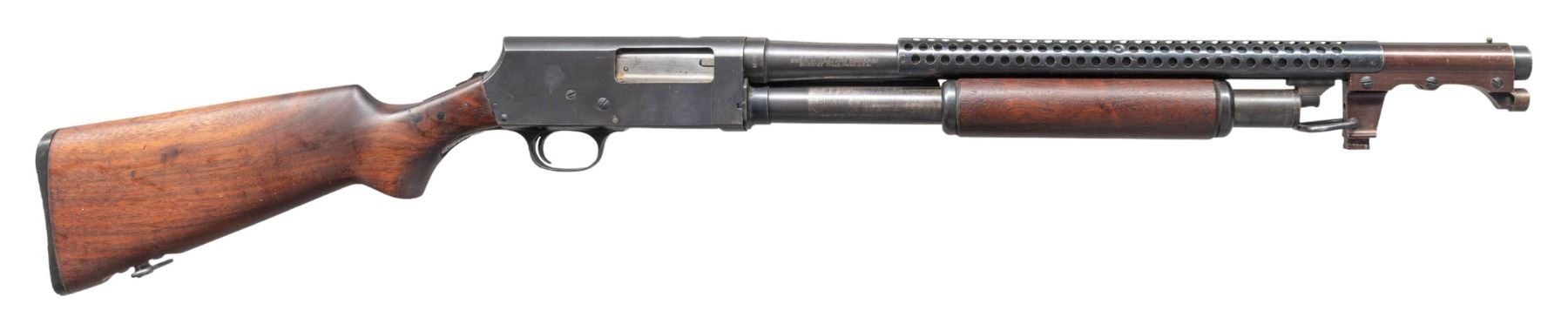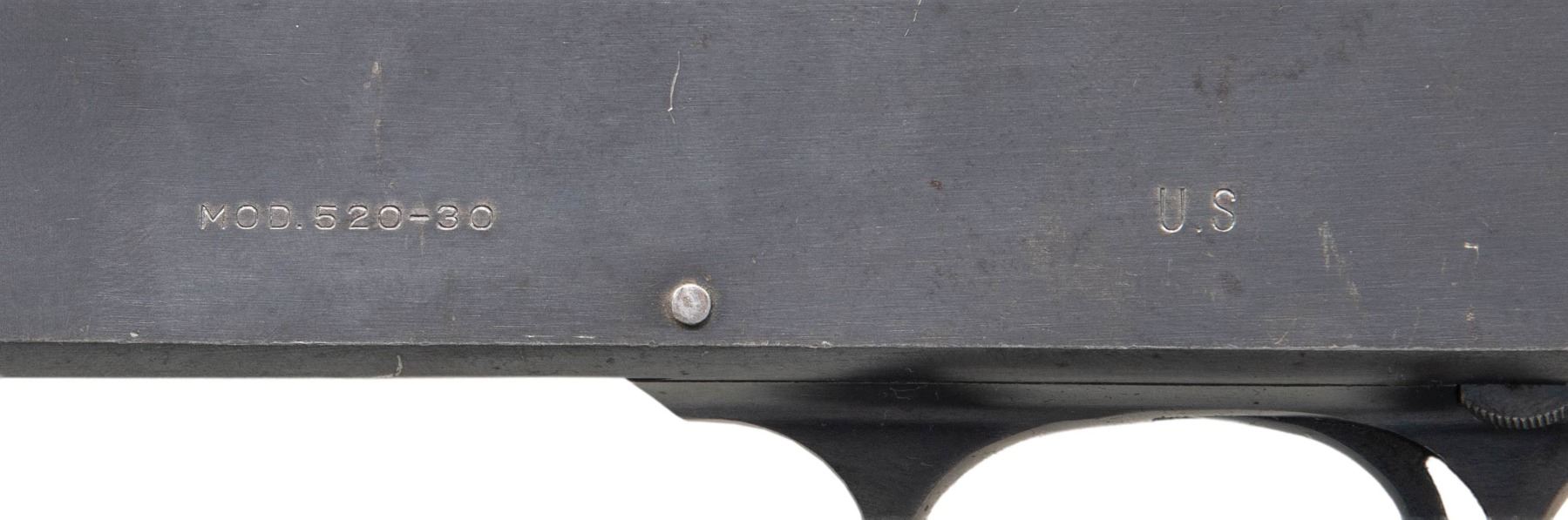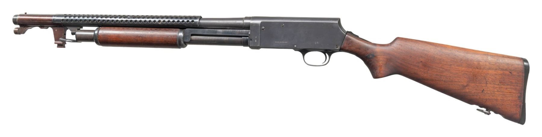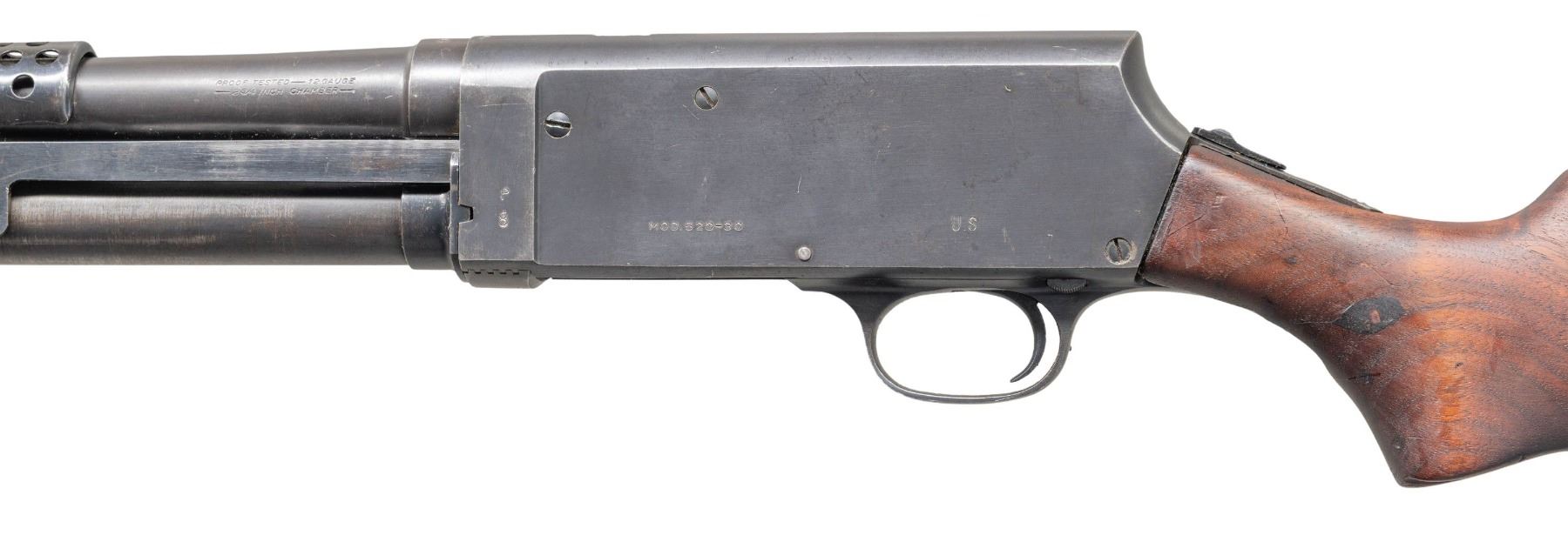 SHOTGUN. Cal. 12 GA, 2 3/4". S# 68229. Bbl. 20". Model 520-30 Trench pump action shotgun mfg. by Stevens/Savage for the U.S. military during WWII. The left side of the bbl. is marked with the cal. designation, with a "P" above a flaming ordnance bomb proof, followed by Steven/Savage's mfg. information on the right. Left side of the receiver is marked with a "P" over a flaming ordnance bomb proof, followed by "MOD.520-30" and "U.S". Metal components exhibit a blue finish overall, save for on the bolt, which is polished in-the-white. Plain wood pump and pistol grip buttstock with grooved black synthetic buttplate. Toeline of stock and underside of heat shield are fitted with sling swivels. Buttstock has been sanded and refinished at one time. Bbl. is fitted with an original 6-shot ventilated handguard, featuring a bayonet lug and brass bead front sight. CONDITION: frame and bbl. retain the majority of their original factory blue finish, exhibiting areas of wear and thinning that are fading to gray patina, with scattered superficial handling marks, scratches, and spots of light surface oxidation present overall. Handguard retains the majority of its original finish, showing light to mild edge wear, scattered superficial handling marks, as well as scattered spots of light oxidation. Left side of handguard exhibits a small patch of mild pitting. Bayonet lug exhibits a proper plum appearance. Very bright bore, exhibiting some scattered spots and patches of light pitting. Proper manual mechanics. Pump is good, showing scattered handling marks and minor impressions. Stock is poorly fit around the tangs and buttplate, showing scattered marks and impressions, as well a chip on the lower left side of the pistol grip. Wrist shows several cracks at and around the receiver tangs, with 2 wood plug repairs present on the right and a single repair present on the left. (25-5339/MLW). CURIO. $1,500-2,250.