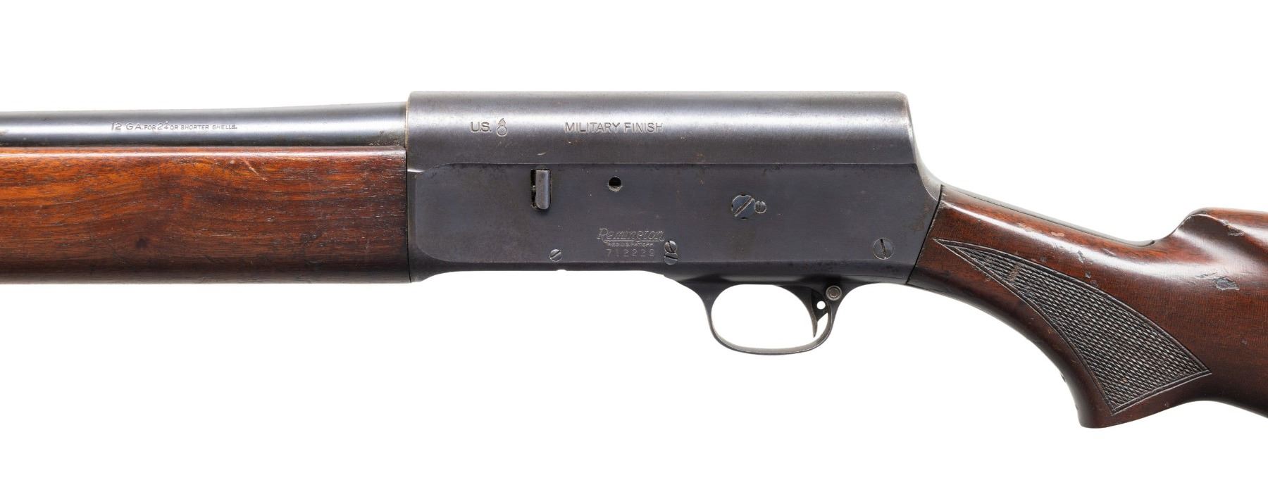 LOADING SHOTGUN. Cal. 12 ga. 2 3/4". S# 712229. Bbl. 27 3/4" over a Cut's Compensator with a full choke tube. Top of breech end of barrel and left side of receiver are marked "U.S." followed by flaming bomb acceptance marks. The receiver is also stamped "MILITARY FINISH". Walnut forearm & pistol grip. Plain uncheckered walnut forearm w/ pistol grip stock having checkering & original buttplate. Bottom of pistol grip is stamped 14 over a reverse image "100". CONDITION: barrel & action retain lightly faded blue showing areas of dark corrosion. Forearm has lightly worn finish showing handling marks. The stock shows crazing finish showing spots of finish chipping & handling marks. Sound action. Very good bore. (25-6124/DS). CURIO. $700-1,000.