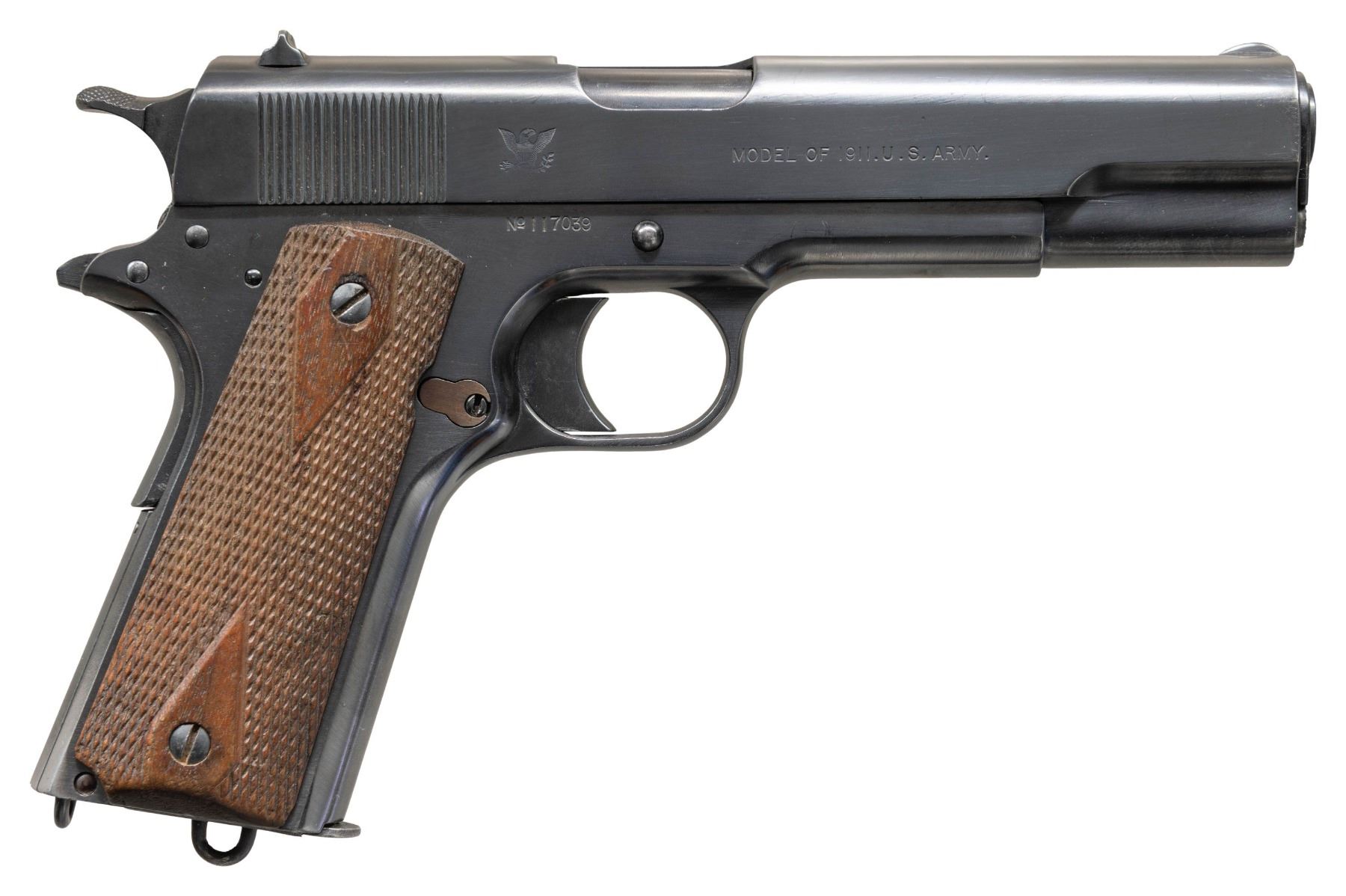 PISTOL. Cal. 45 ACP. S# 117039. Mfg. 1915 within S# range 113,497-120566. Based on "U.S. Pistols & Revolvers 1909-1945" by J.C. Harrison, appears to have all correct era parts including Springfield 5" barrel & Dbl. diamond walnut grips. All applicable parts are stamped "S" including barrel, hammer, slide stop, safety lock, grip safety, mainspring housing, trigger, magazine catch, extractor, firing pin stop, sear & disconnector. MAGS: 1 Springfield Arsenal 7 rd. mag. w/ lanyard loop. Appears to have been cleaned with heat treatment & dark refinish. CONDITION: pistol has a well done reblued metal finish with light handling marks & scratches throughout. Grips show numerous marks & distorted screws. Bore shows worn rifling with light pitting. (25-6536/MD). CURIO. $1,500-2,500.