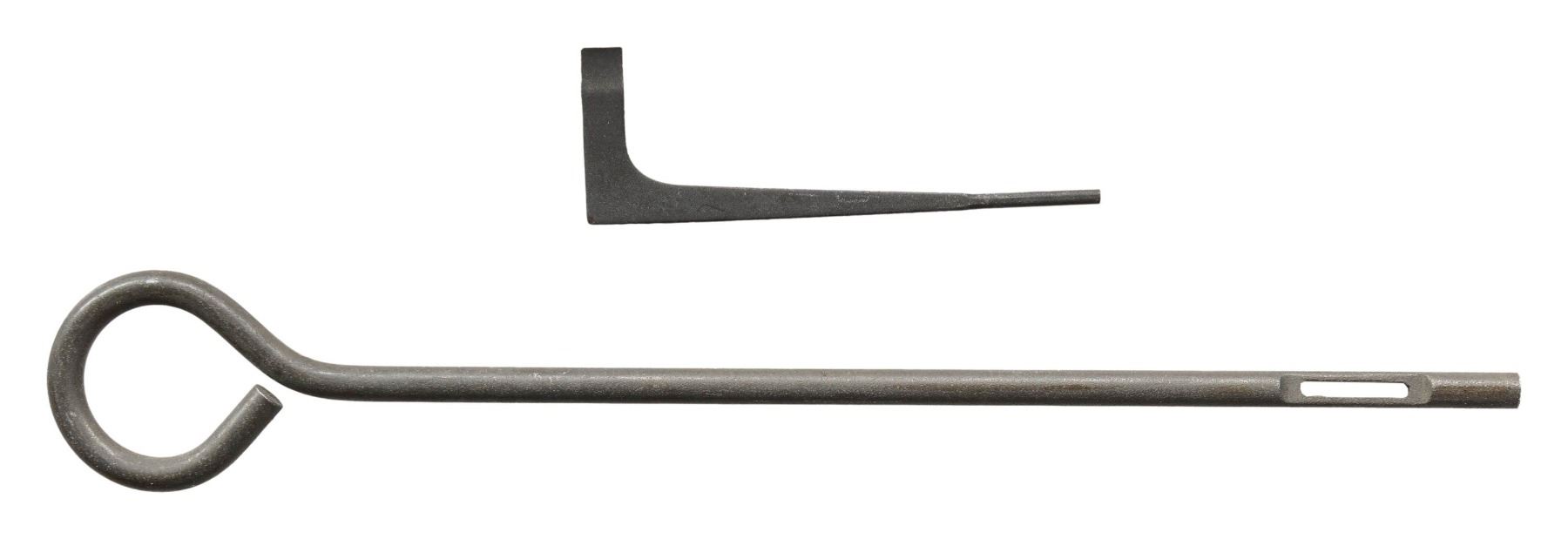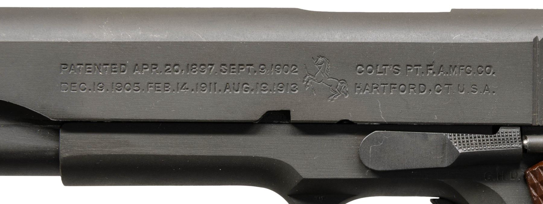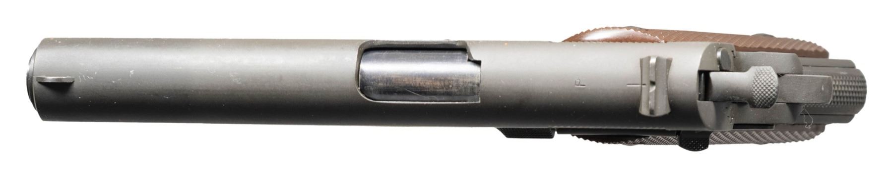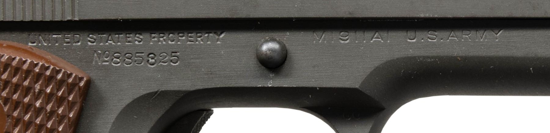 PISTOL. Cal. 45 ACP. S# 885825. Mfg. 1943 within S# range 856,101-958,100. Has all correct parts including Type 6 Colt 5" barrel, matching numbered slide having Type B front sight & Type B U notch rear sight along with Coltwood grips. MAGS: 1 excellent Scovill "C-S" mag. UNATTACHED ACCESSORIES: WWII parkerized Stanley screwdriver & post WWII "J.A.M. 5564102" cleaning rod. CONDITION: pistol has over 95% original parkerized finish showing light scratches on left side of frame in recess cutout & a few small light scratches under mag. button. Slide shows a few small light marks behind front sight & small light scratches left side slide around rampant Colt. Grips are excellent with a few small light marks on bottoms. Barrel has over 90% original blue finish with light cycling wear. Bright bore with very good rifling. (25-6134/MD). CURIO. $3,500-5,000.