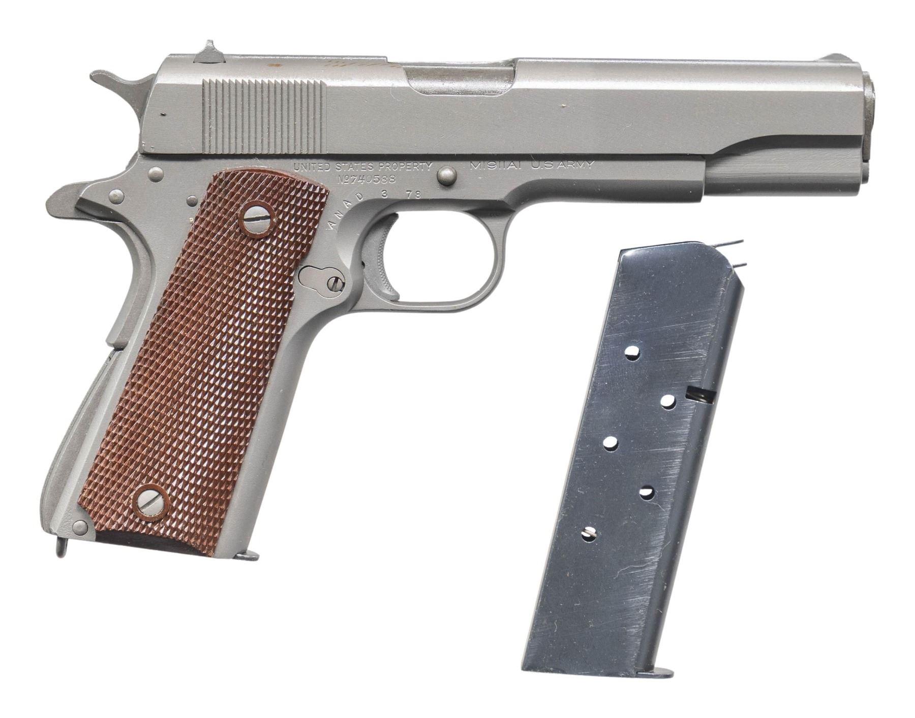 SEMI AUTO PISTOL. Cal. 45 ACP. S# 740588. Left side of Colt frame stamped "ANAD 3 78" indicates March 1978 Anniston Army Depot rebuild; pistol assembled using Ithaca slide & Colt frame. Post WWII Colt 5" barrel. Frame originally mfg. 1941 w/ "RS" inspector proof & post WWII brown plastic grips. MAGS: 2 Vietnam era Colt 7 rd. mags. UNATTACHED ACCESSORIES: CMP case with shipping box, CMP 1911 Surplus box with matching S#, CMP COA, CMP invoices & 1911A1 Technical Manual. CONDITION: near excellent overall finish; very good rifling. PROVENANCE: From the Buckstix Collection. (25-6324/MD). CURIO. $1,750-2,500.