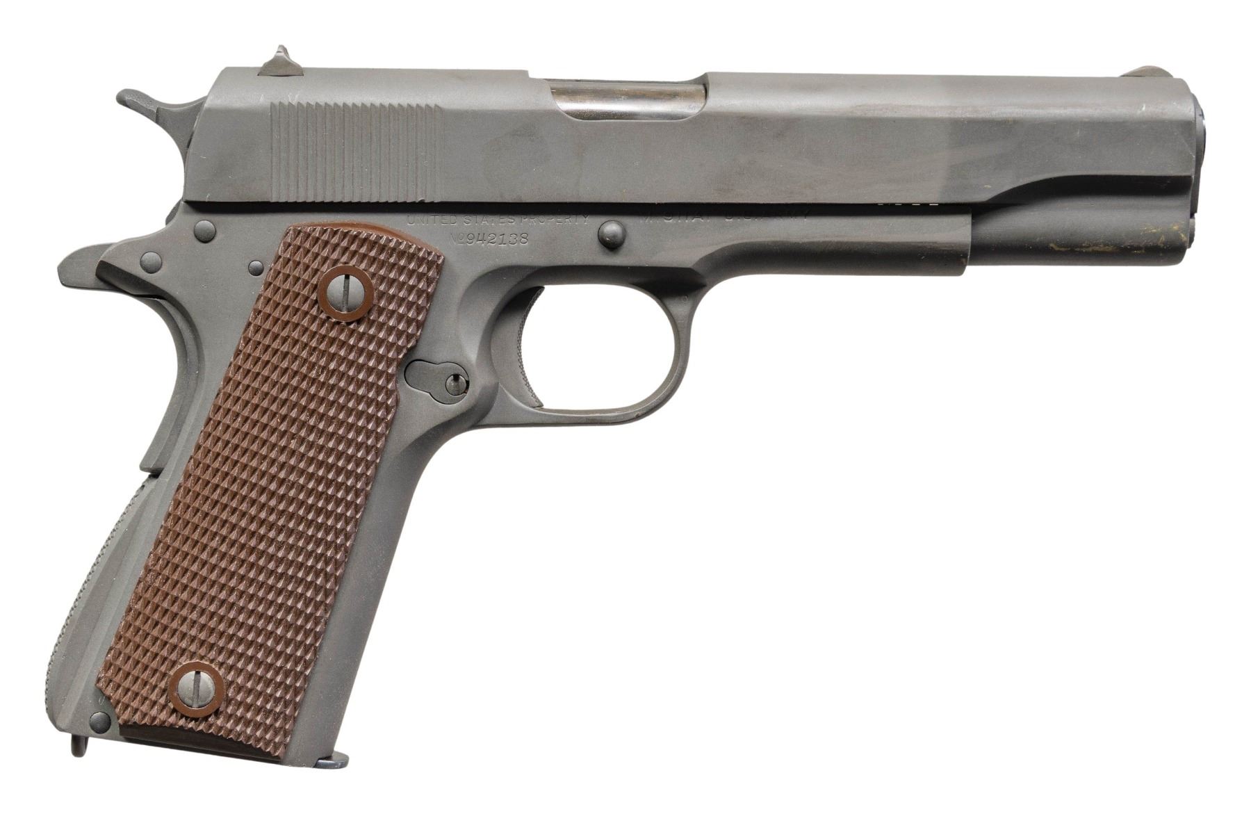 Cal. 45 ACP. S# 942138. Mfg. 1943. Appears to have correct era parts including Colt 5" barrel, matching numbered slide & Coltwood grips. MAGS: 1 reblued 7 rd. UNATACHED ACCESSORIES: brown leather Boyt 42 holster in good overall condition. CONDITION: pistol has very good bead blasted refinished with a few light wear streaks. Very good grips. Reblued barrel has good lightly worn rifling. PROVENANCE: Estate Collection of John "Jack" Dhooghe. (25-5545/MD). CURIO. $1,000-1,500.
