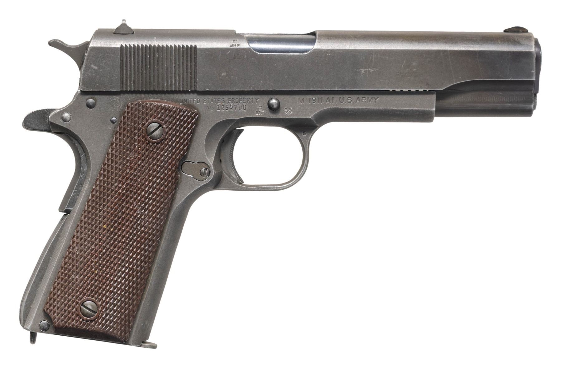 PISTOL. Cal. 45 ACP. S# 1255700. Mfg. 1943 within S# range 1,208,674-1,279,673. British Nitro proofs on right side of frame indicates previously shipped to Great Britain as Lend Lease Act aid during World War II. Appears to have most correct era parts with Keyes Fiber grips; replacement 5" Colt Type 6 barrel & commercial spring loaded recoil spring guide. Pistol shows hobbyist alterations including bright polishing to throat & bluing of slide around front sight. MAGS: 1 M.S. Little 7 rd. mag.; has been parkerized refinished. CONDITION: pistol has very good parkerized refinish showing areas of blue finish on slide along with scratches throughout. Very good grips with areas of flattened diamonds. Very good barrel blue & rifling. (25-6544/MD). CURIO. $1,500-2,000.