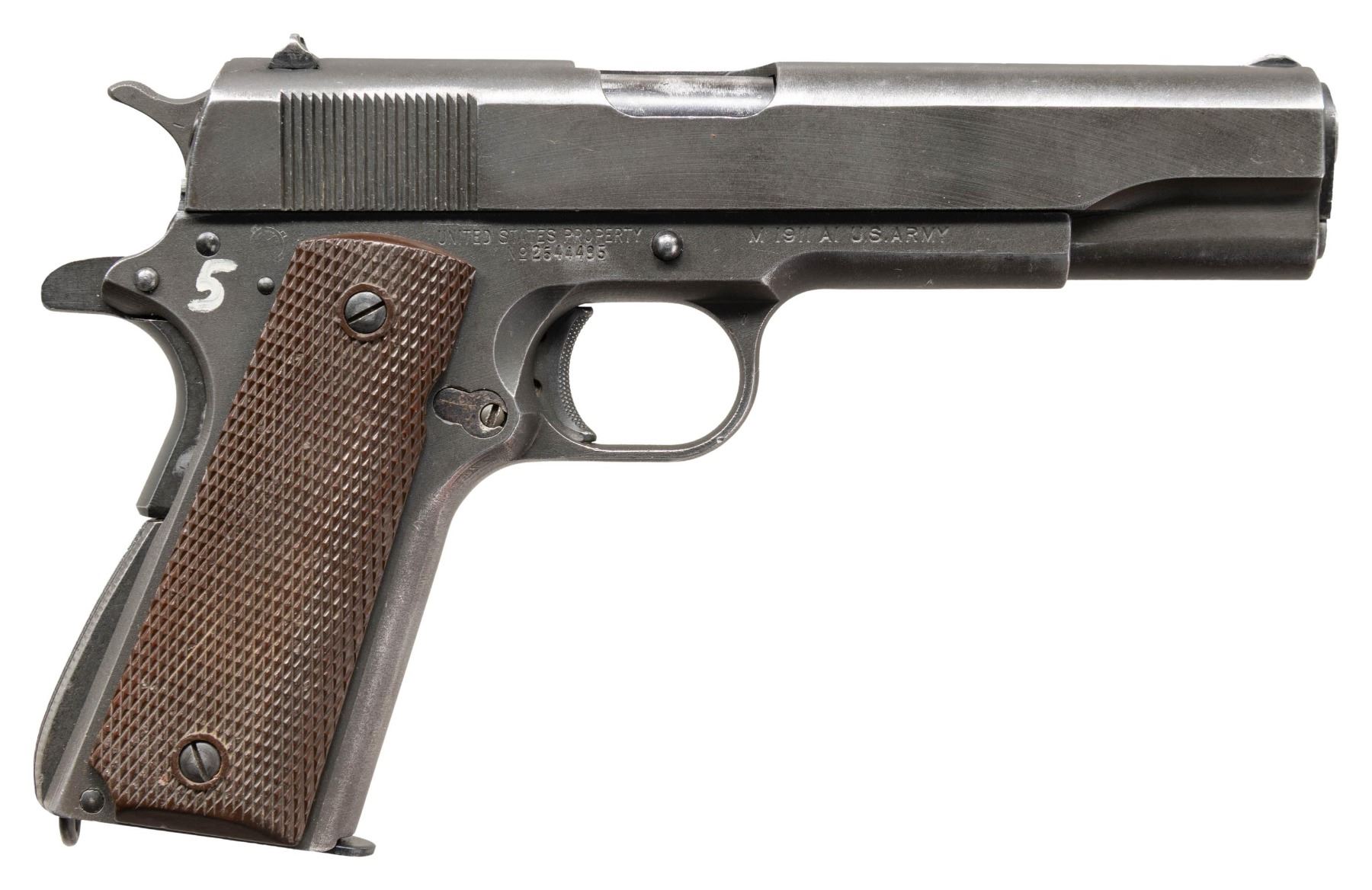 PISTOL. Cal. 45 ACP. S# 2644495. Frame originally mfg. 1945 by Ithaca. While no arsenal stamps, this pistol been arsenal rebuilt with Remington Rand slide, Flannery 5" barrel, Keyes Fiber grips. MAGS: 1 Vietnam era 7 rd. mag. UNATTACHED ACCESSORIES: CMP hard case & COA card. CONDITION: good bead blasted arsenal refinish with handling wear, rack number "5" & scratches. Top flats of frame show polishing along with throat. Good rifling with some flattening of diamonds. Very good rifling with spots of light pitting. (25-6191/MD). CURIO. $1,200-1,800.