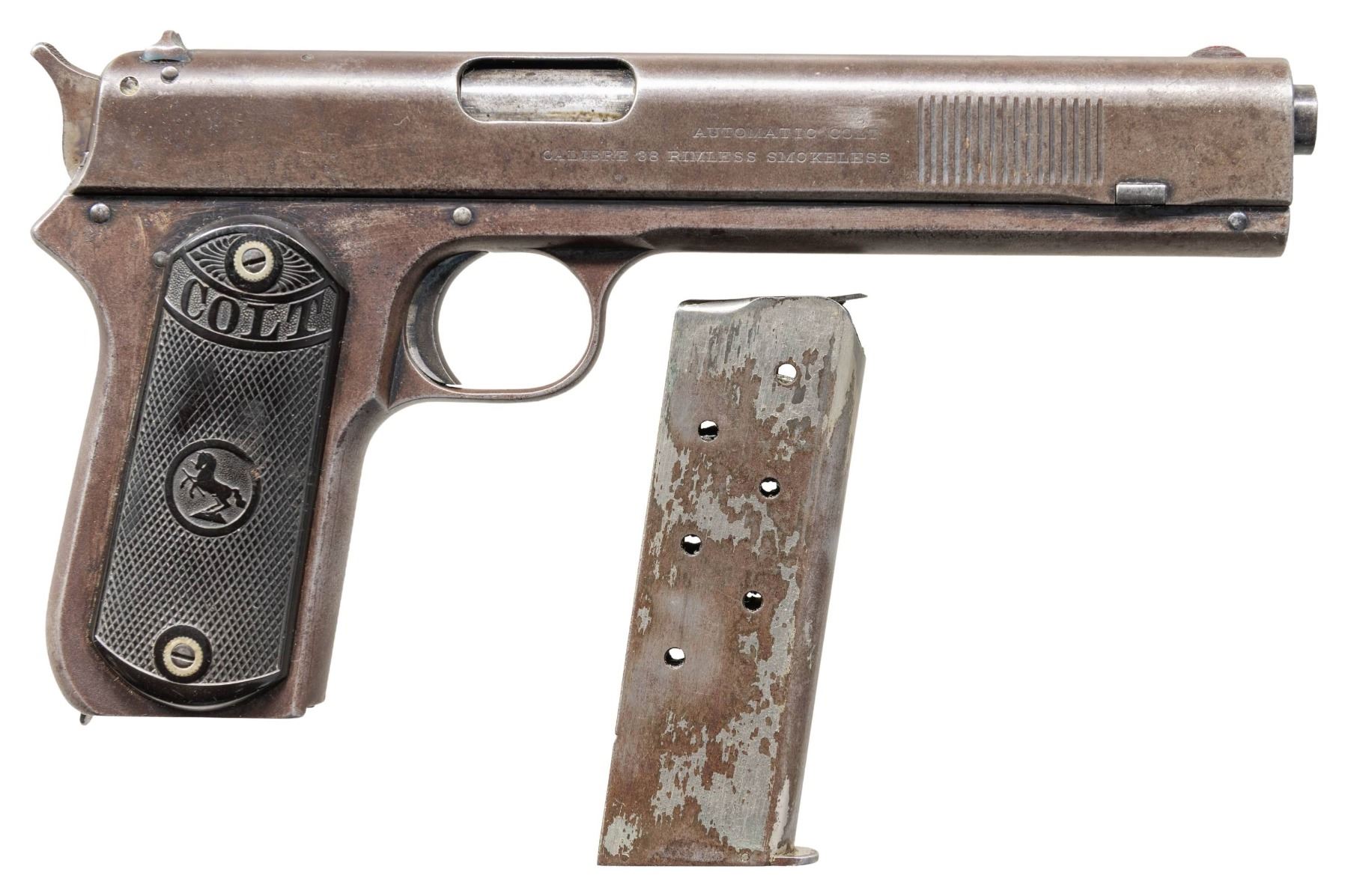 Cal. 38 Rimless (38 ACP). S# 3838. 1 of approx. 4,274 mfg. 1903. Standard features includes 6" bbl., spur hammer & Colt hard rubber grips. MAGS: 1 - 8 with fair peeling nickel finish to gray patina appearance. CONDITION: pistol has traces of blue & fire blue finish while the balance of the pistol as gray patina appearance showing peppery oxidation & pitting. Grips have good appearance with wear to checkering & sm. wear gouges. Worn rifling with pitting. (25-5405/MD). CURIO. $1,000-1,500.