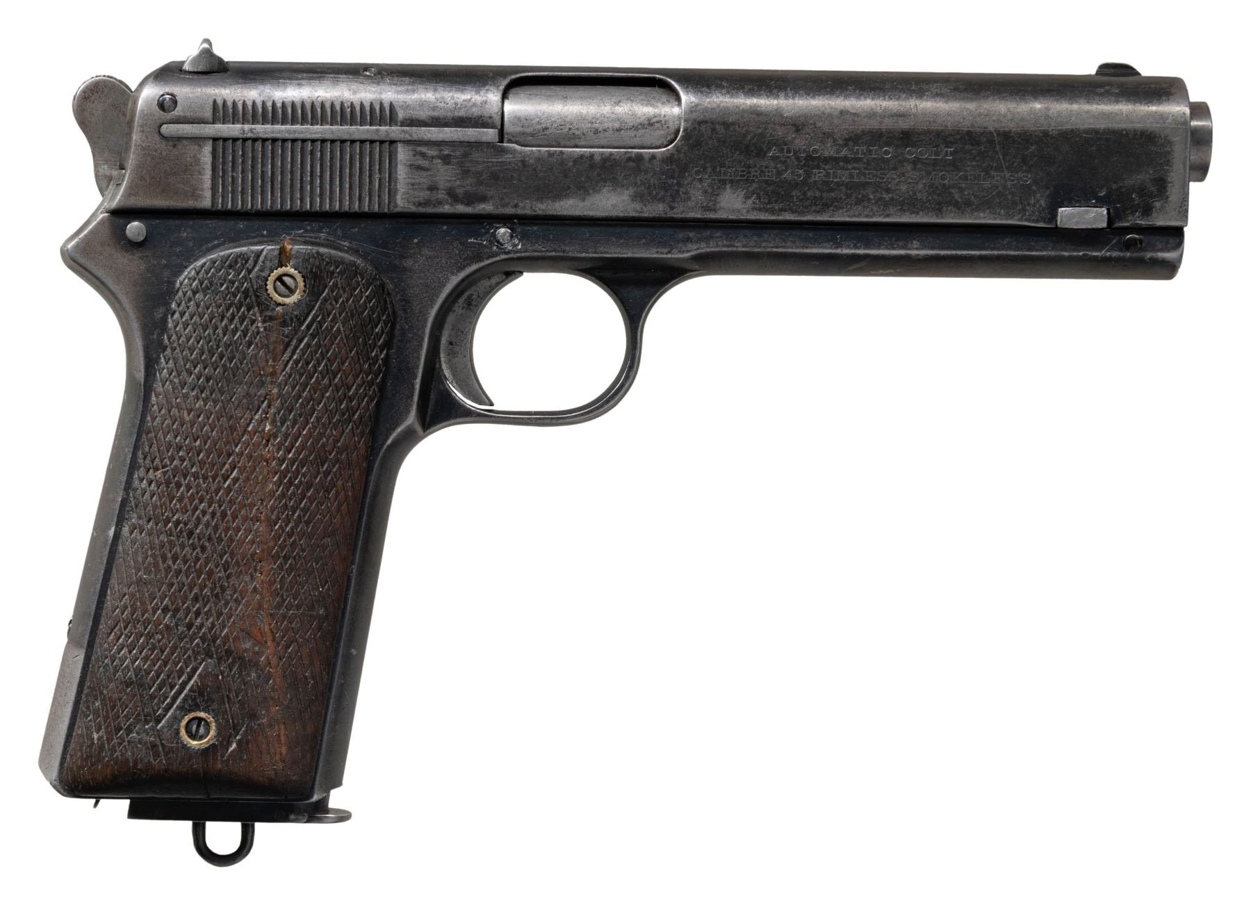 Cal. 45 ACP. S# 3167. Mfg. 1908. Standard configuration with 5" barrel & checkered walnut grips. MAGS: 1 - 7 rd. mag.; This is a Model 1911 mag. w/ lanyard loop & slot cutout on spine for mag. release. CONDITION: metal has fair old reblued finish with large portions of slide having finish loss, prior pitting & scratches. Front side has been contoured to give a swept profile rather than half moon. Slide lock appears replacement with missing recoil plug. Right grip panel has epoxy repaired break & left panel has large chip missing with both panels showing worn checkering & sm. gouges. Poor pitted bore. (25-5389/MD). CURIO. $1,000-1,500.