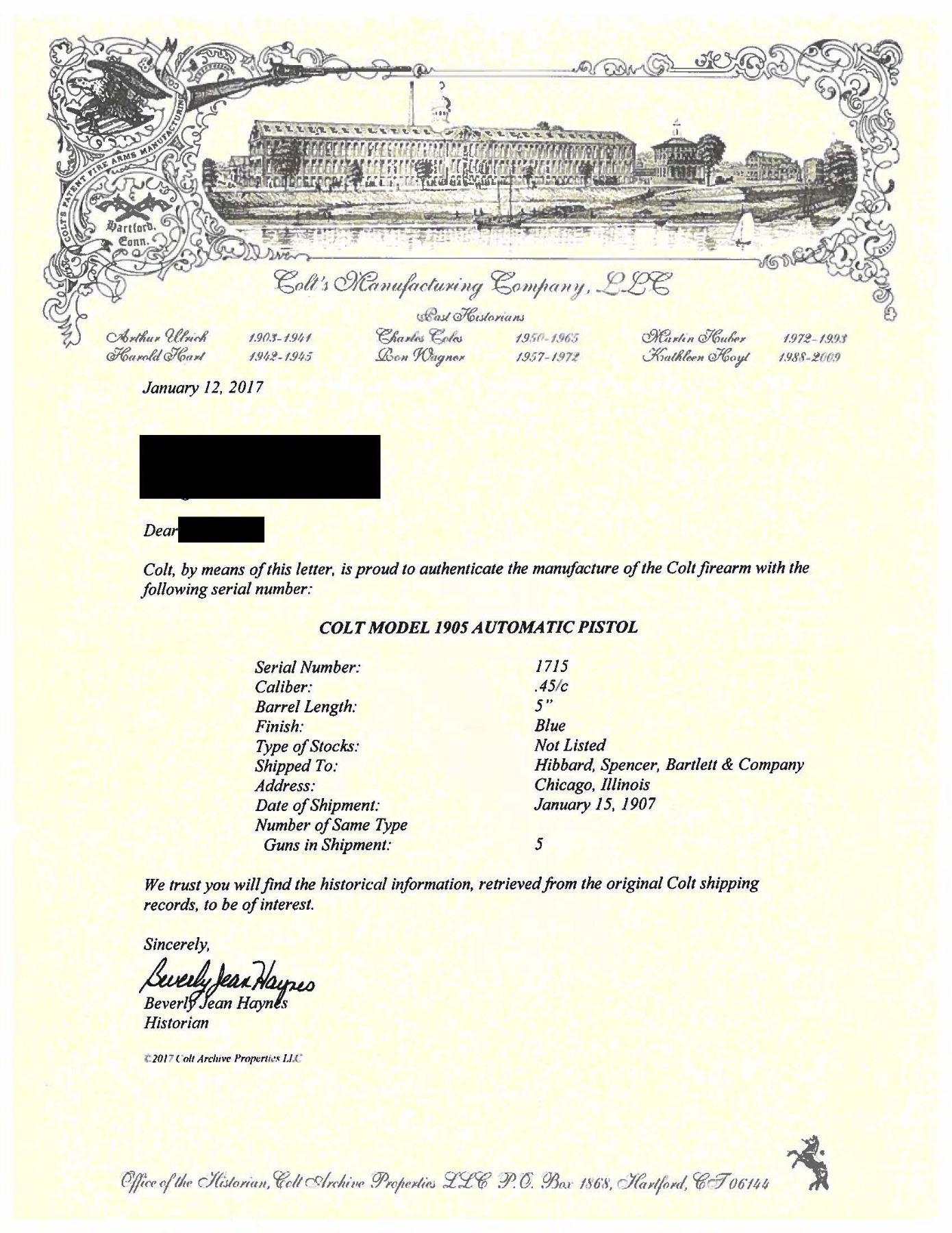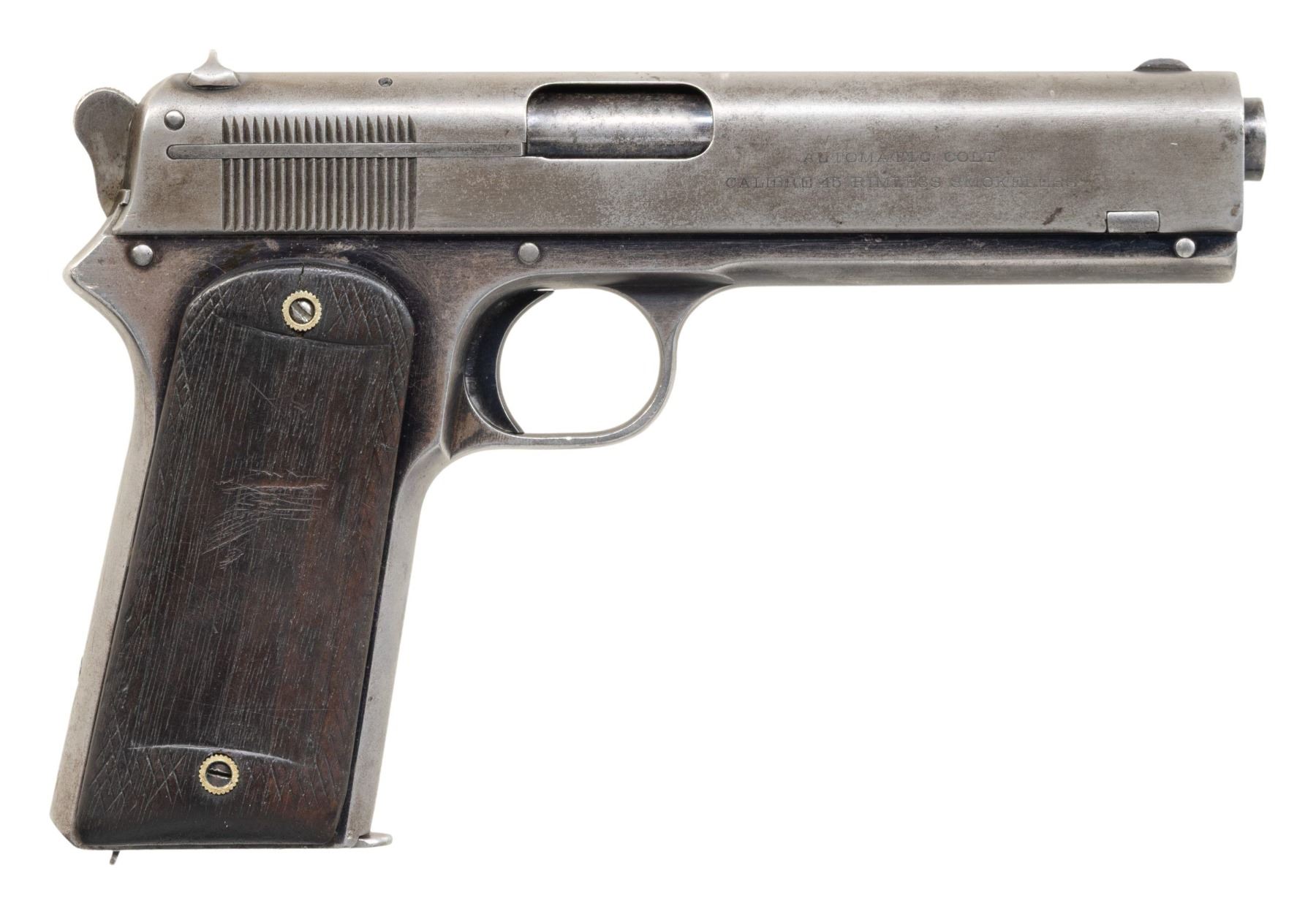 Cal. 45 ACP (marked "45 RIMLESS"). S# 1715. Mfg. 1907. Standard configuration with 5" barrel, walnut grips & round hammer. MAGS: 1 - 7 rd. CONDITION: slide has cleaned, gray patina appearance with traces of blue. Frame has approx. 50% original blue with large portions of blue protected by grips; balance faded to gray with light marks. Left panel shows considerable wear & marks with right panel having large rectangular section cut down with refinish & heavy scratches. Good rifling with light pitting. (25-5420/MD). CURIO. $1,000-1,500.