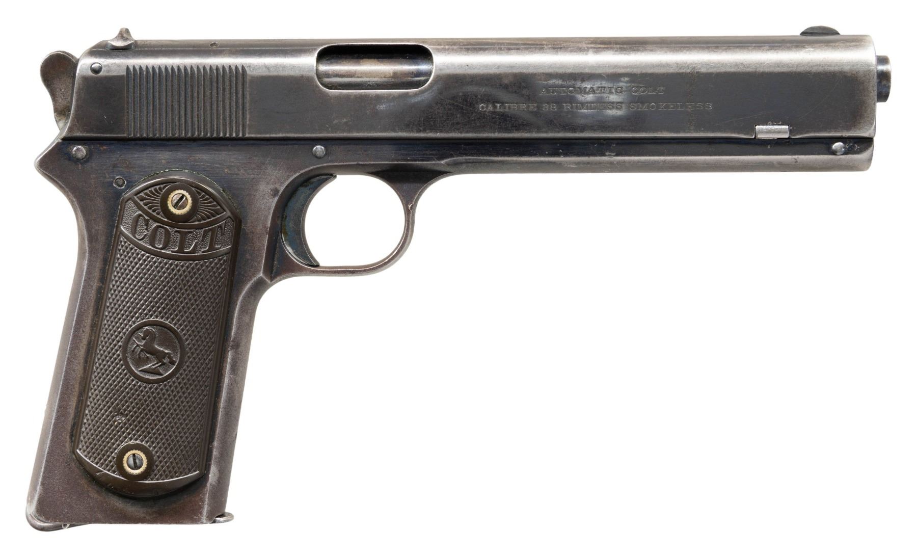Cal. 38 Rimless (38 ACP). S# 31295. Mfg. 1909. Bbl. 6". Polished blue finish. Rnd. hammer. Two piece hard rubber Colt grips. Lanyard loop on frame. MAGS: 1 - 8 rd. CONDITION: approx. 30% original blue finish on slide & frame mixing with brown / gray patina, showing scratches, marks & peppery oxidation. Good grips with gouges. Fair rifling with pitting. (25-5404/MD). CURIO. $1,200-1,800.