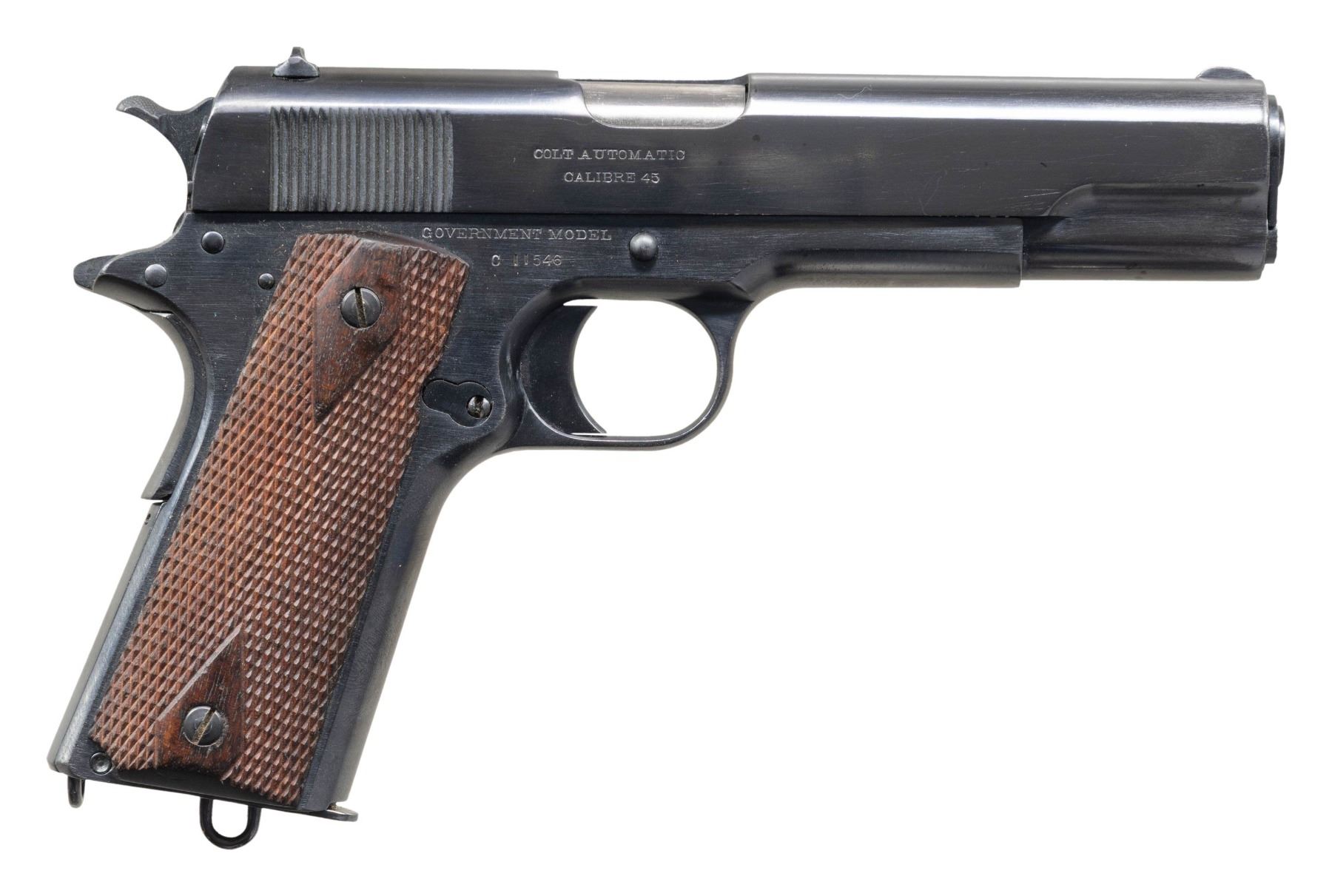 PISTOL. Cal. 45 ACP. S# C11546. Mfg. 1914 as the Commercial version of the US M1911 pistol. Features replacement 5" barrel stamped with spurious "R" & "546" on lugs, reblued finish, replacement 2nd type slide lock & dbl. diamond walnut grips. MAGS: 1 - 7 rd. w/ lanyard loop. Refinished with areas of prior pitting. UNATTACHED ACCESSORIES: replica Colt 1911A1 box mark containing wax paper. CONDITION: very good reblued finish with light finish wear in handling wear with spots of patina. Very good grips with a few scattered marks. Reblued barrel has fair rifling with pitting throughout. (25-1222/md). CURIO. $2,000-3,000.