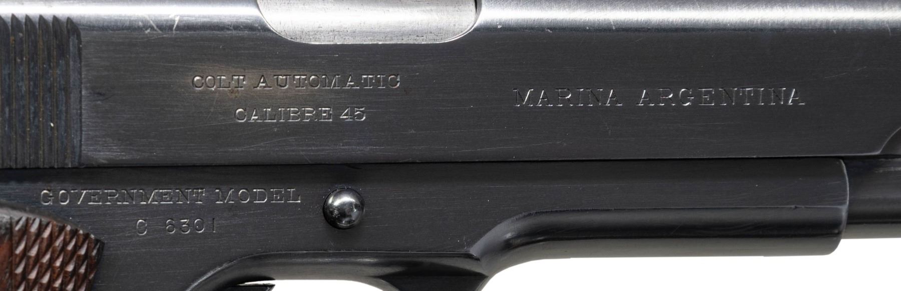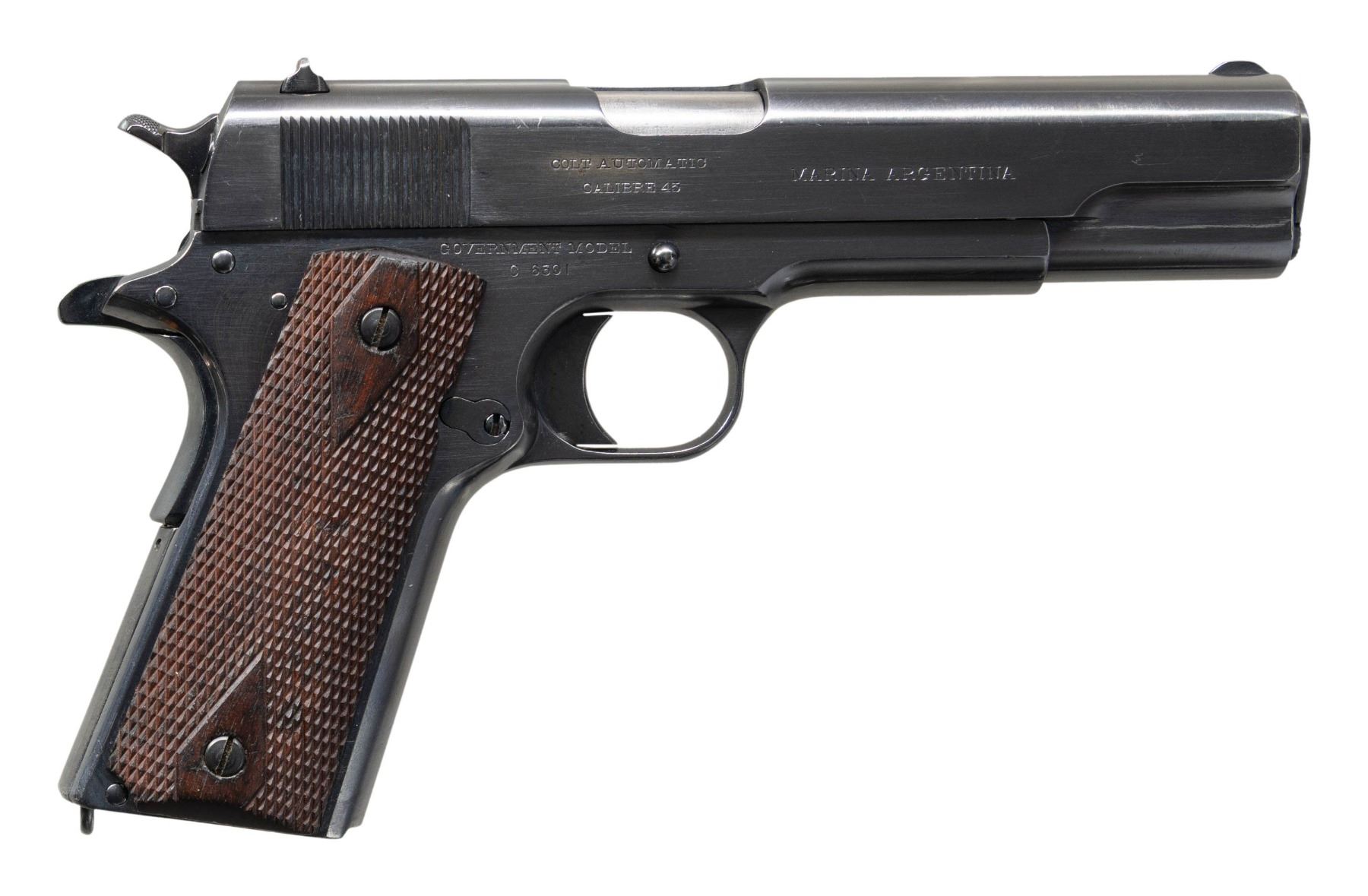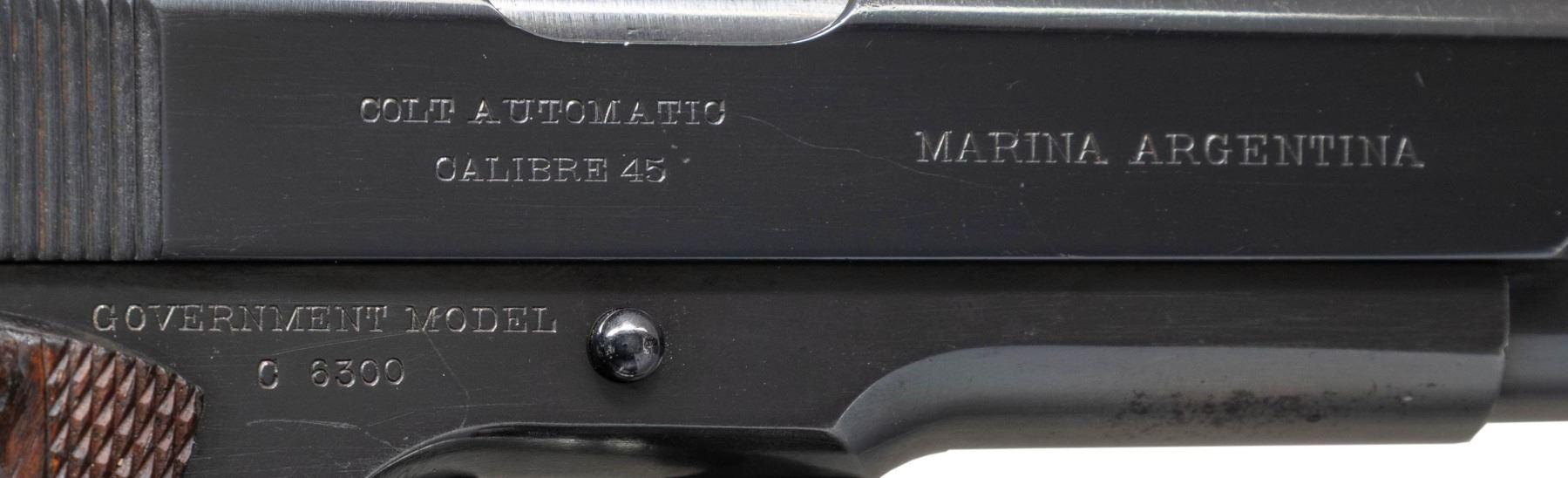 COMMERCIAL GOVERNMENT MODEL 1911 SEMI AUTO PISTOLS WITH LINEAGE TO 2 ARGENTINE BATTLESHIPS. ALL: Cal. 45 ACP. Per "Colt .45 Government Models (COMMERCIAL SERIES) 1912 through 1970" by Charles W. Clawson "In 1914, the Ministerio de Marina (Department of the Navy) contracted Colt to manufacture 321 caliber .45 Government Model automatic pistols for the Argentine Navy. On April11,1914, pistols numbered C6201-6300 were shipped to the Argentine Naval Commission, c/o Fore River Shipbuilding Company, Quincy, Massachusetts, for equipping the battleship Rivadavia being built at that facility. On the same date, serial numbers C6301-C6400 were shipped to Camden, New Jersey, for equipping the battleship Moreno under construction at the New York Shipbuilding Company". Pistol #1 was the last S# sent to battleship Rivadavia. Pistol #2 was the first S# sent to battleship Moreno". Both pistol slides are marked with standard Colt markings along with "MARINA ARGENTINA". Blued finished pistols have Colt 5" barrels. "RA" Inspection marks on top of frames & on slides above firing pin. Commercial 1911 small parts on frame along with replacement dbl. diamond checkered walnut grips. UNATTACHED ACCESSORIES: both pistols are housed in a Colt Custom Shop double pistol walnut case w/ blue velour shadow-line interior & having Colt label on lid. Case exterior shows numerous marks. CONDITION: both pistols have a very good reblued finish showing peppery patina & pinprick pitting throughout. Bores show pitting & worn rifling. 1) S# C6300. "RA" Inspection marks on top of barrel & "J" Proof on left lug. MAGS: 1 refinished mag. with lanyard loop; two toned appearance with straight acid line. (25-1214/MD).2) S# C6301. Partial "RA" inspection marks on bottom of barrel & another partial "R" proof. MAGS: NONE. (25-1215/MD). ALL CURIO. $4,000-8,000.
