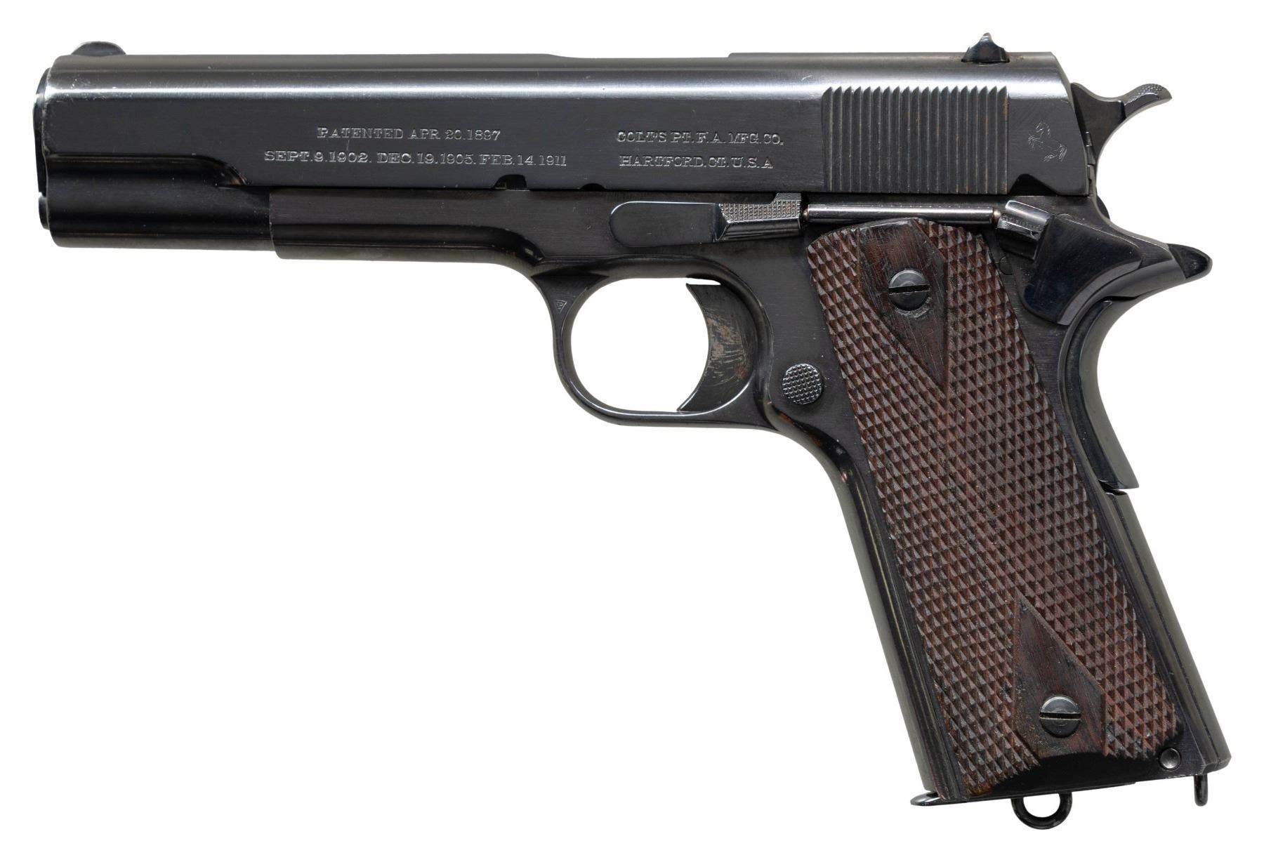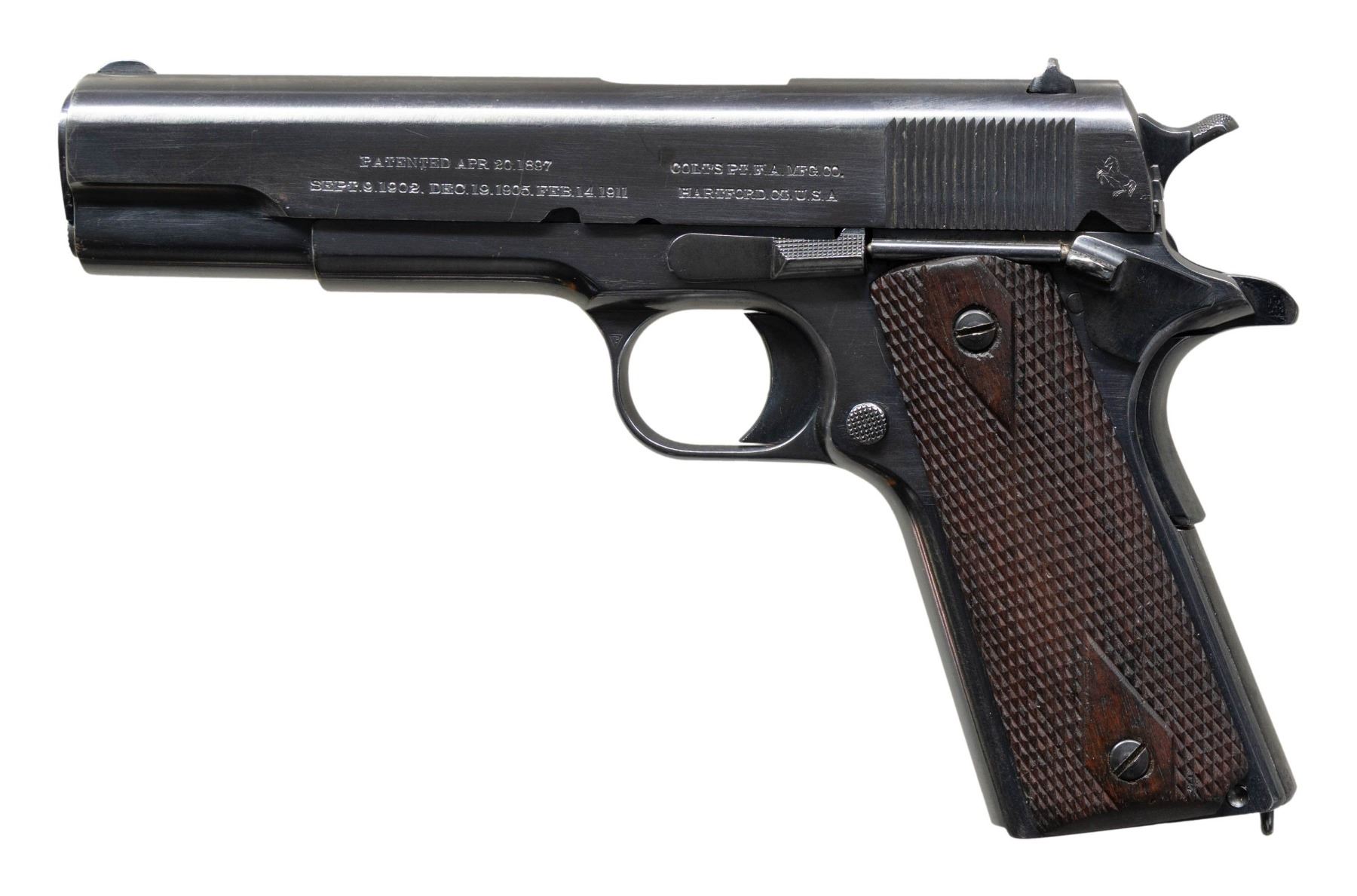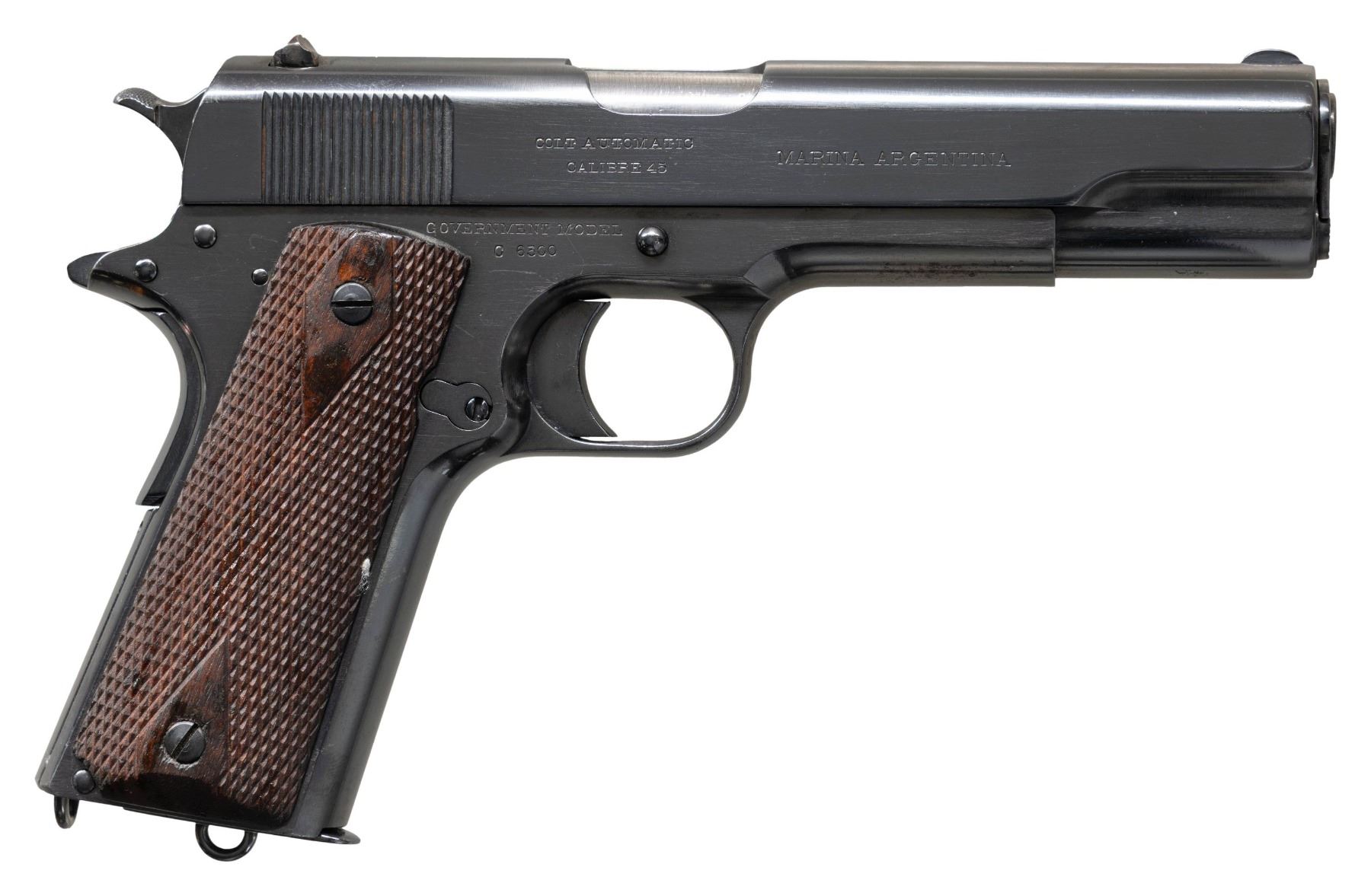 COMMERCIAL GOVERNMENT MODEL 1911 SEMI AUTO PISTOLS WITH LINEAGE TO 2 ARGENTINE BATTLESHIPS. ALL: Cal. 45 ACP. Per "Colt .45 Government Models (COMMERCIAL SERIES) 1912 through 1970" by Charles W. Clawson "In 1914, the Ministerio de Marina (Department of the Navy) contracted Colt to manufacture 321 caliber .45 Government Model automatic pistols for the Argentine Navy. On April11,1914, pistols numbered C6201-6300 were shipped to the Argentine Naval Commission, c/o Fore River Shipbuilding Company, Quincy, Massachusetts, for equipping the battleship Rivadavia being built at that facility. On the same date, serial numbers C6301-C6400 were shipped to Camden, New Jersey, for equipping the battleship Moreno under construction at the New York Shipbuilding Company". Pistol #1 was the last S# sent to battleship Rivadavia. Pistol #2 was the first S# sent to battleship Moreno". Both pistol slides are marked with standard Colt markings along with "MARINA ARGENTINA". Blued finished pistols have Colt 5" barrels. "RA" Inspection marks on top of frames & on slides above firing pin. Commercial 1911 small parts on frame along with replacement dbl. diamond checkered walnut grips. UNATTACHED ACCESSORIES: both pistols are housed in a Colt Custom Shop double pistol walnut case w/ blue velour shadow-line interior & having Colt label on lid. Case exterior shows numerous marks. CONDITION: both pistols have a very good reblued finish showing peppery patina & pinprick pitting throughout. Bores show pitting & worn rifling. 1) S# C6300. "RA" Inspection marks on top of barrel & "J" Proof on left lug. MAGS: 1 refinished mag. with lanyard loop; two toned appearance with straight acid line. (25-1214/MD).2) S# C6301. Partial "RA" inspection marks on bottom of barrel & another partial "R" proof. MAGS: NONE. (25-1215/MD). ALL CURIO. $4,000-8,000.