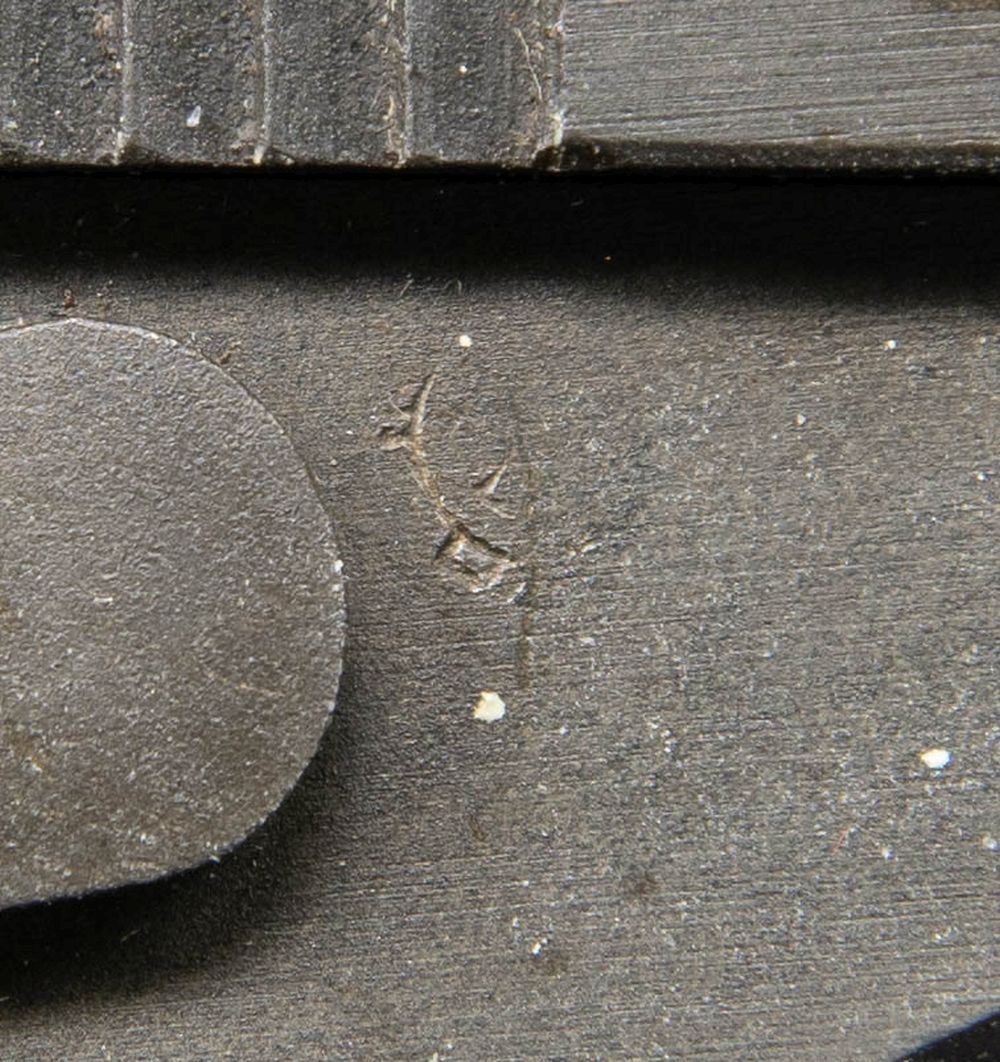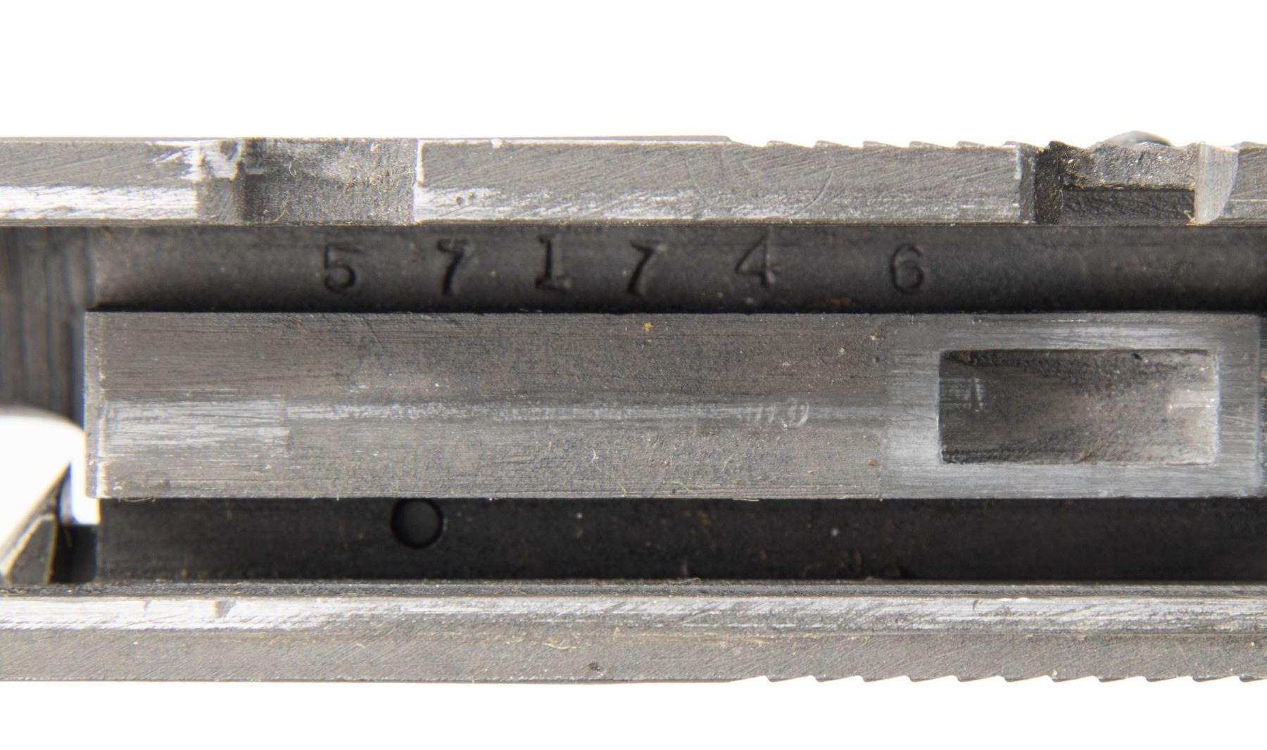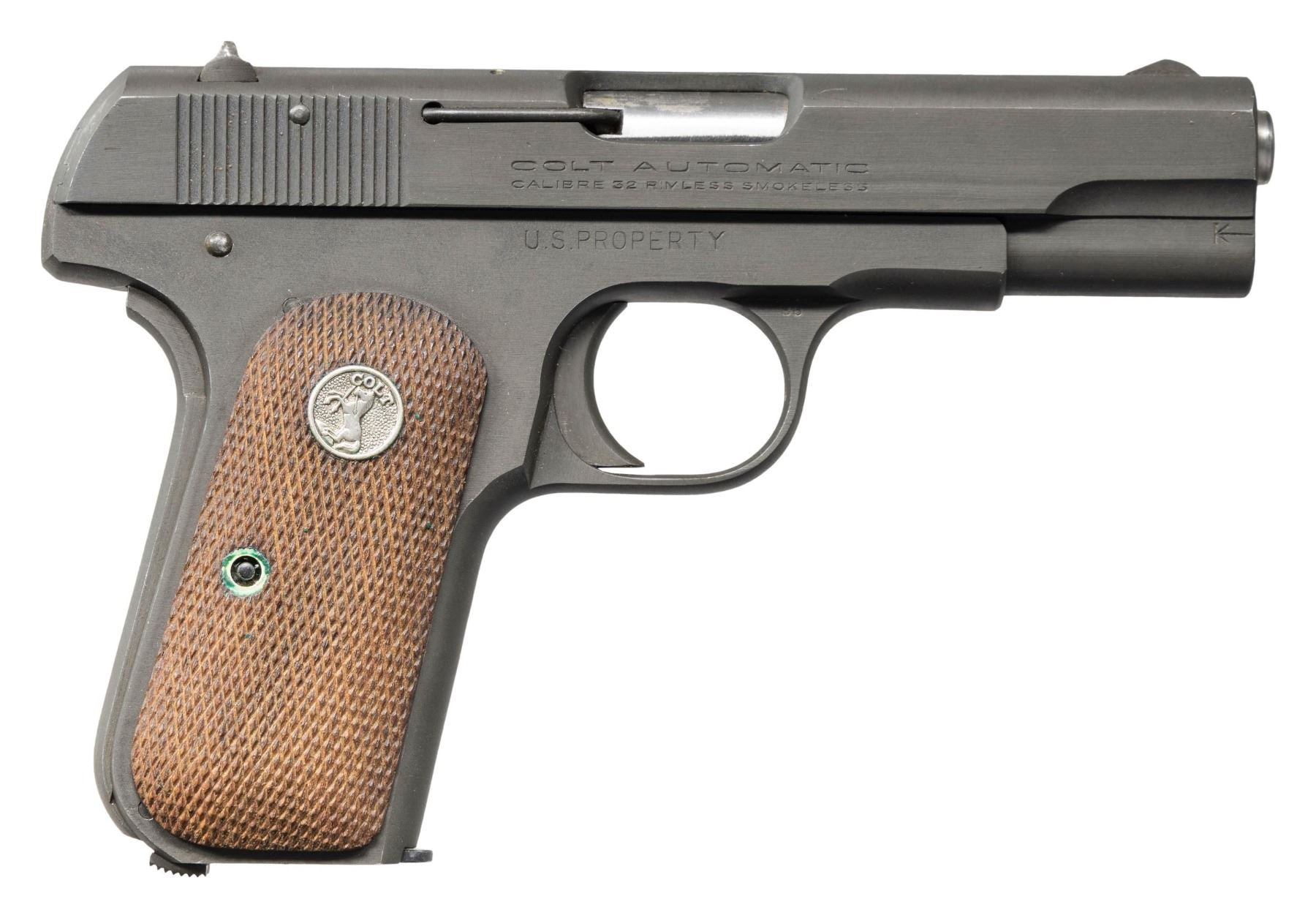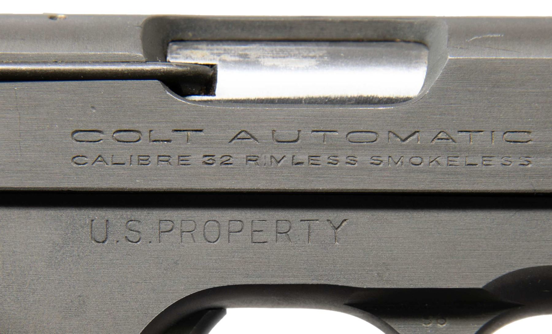 COLT MODEL 1903 HAMMERLESS SEMI-AUTOMATIC PISTOL. Cal. 32 Rimless Smokeless (32 ACP). S# 571746. Bbl. 3 3/4". Model 1903 Hammerless ("Model M") semi-automatic pistol mfg. by Colt in 1945 under contract for the U.S. military. The left side of the slide is marked with Colt's 2-line mfg. and patent information, followed by the Rampant Colt logo, with "COLT AUTOMATIC/ CALIBRE 32 RIMLESS SMOKELESS" marked on the right. Left side of the frame is stamped with a poorly struck, virtually indistinct U.S. crossed cannons ordnance escutcheon to the right of the safety lever, with "U.S. PROPERTY" marked on the right. Left side of the bbl. is appropriately marked "COLT 32 AUTO". Metal components exhibit a parkerized finish overall, save for on the bbl. which is blued. Chamber area of bbl. is polished in-the-white. Frame is mounted with 2-piece Colt silver medallion checkered wood grips. Fixed serrated blade front sight and dovetailed square notch rear sight. Slide matches the frame via the full S# on the interior. MAGS: 1 blued 8-rd. CONDITION: metal components retain the vast majority of their original parkerized finish, exhibiting some spots of light edge wear, some light superficial handling marks, as well as some small white flecks of apparent white paint overall. Brilliant mirror bore, retaining well defined rifling throughout. Proper manual mechanics. Grips show some light smoothing, as well as a few nicks to the diamonds, but otherwise remain very good overall. A notably high condition example of a desirable U.S. Property marked Colt Model 1903 Hammerless pistol. (25-6572/MLW). CURIO. $1,500-2,250.