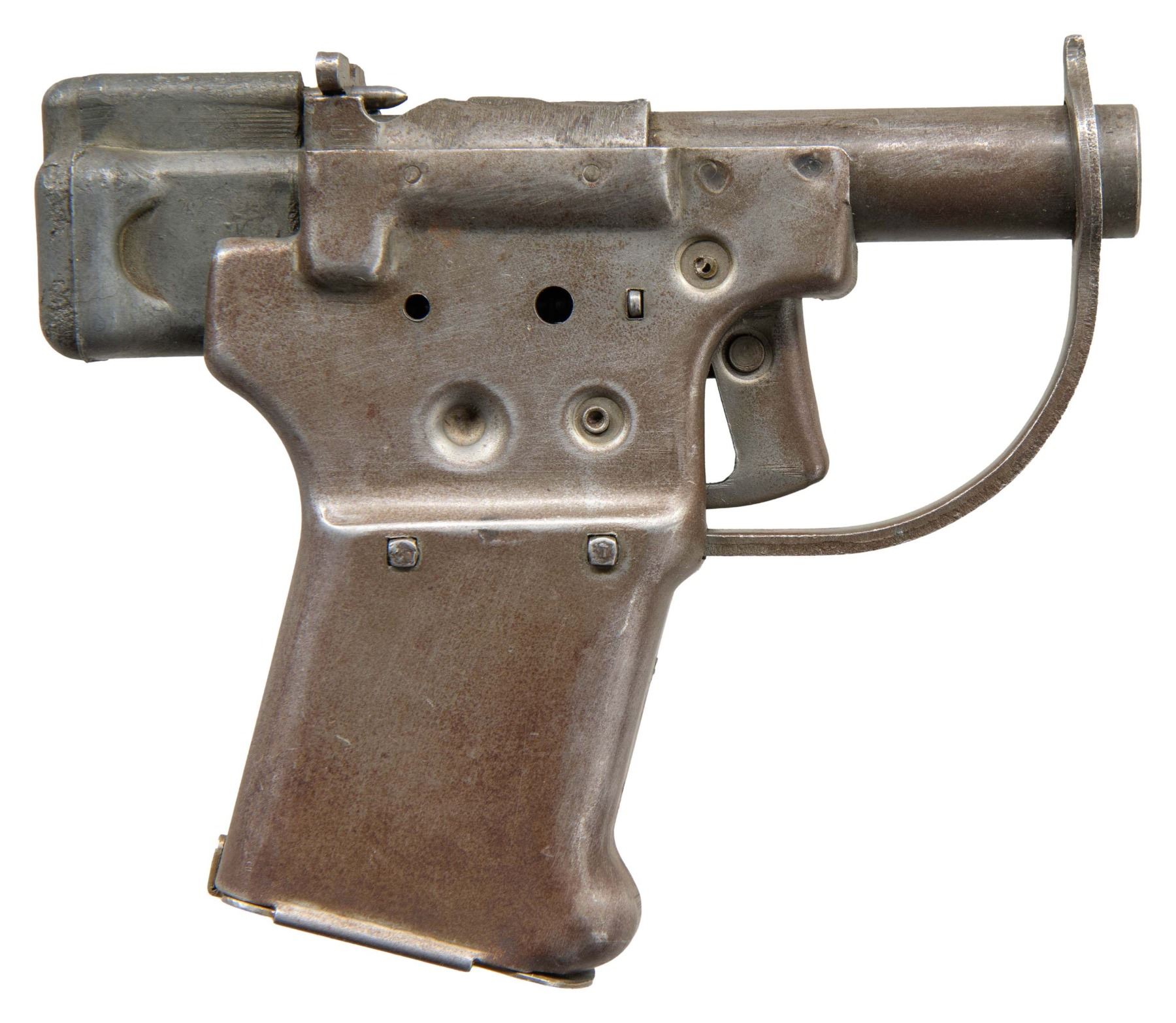 SINGLE SHOT PISTOL. Cal. 45 ACP. NSN. Bbl. 4 1/8". The FP-45 (clandestine designation "Flare Pistol") Liberator pistol was proposed, developed, and began mass production at the U.S. Guide Lamp Division of General Motors in only 11 weeks, with the Joint Psychological Warfare Committee intending on air dropping loads of Liberator pistols to resistance and partisan groups in German occupied countries during World War II. The Liberator was never designed to be used for more than just a few shots, with its main purpose serving as a rudimentary, easily concealable, and cost effective pistol for resistance fighters to use against enemy personnel in order to secure more effective small arms. The frame is constructed of stamped sheet metal and features a removable plate on the butt for ammunition stowage. Milled smoothbore bbl. with cast alloy cocking piece. Front sight is integral to the trigger guard, with the square notch rear sight being integral to the sliding breech plate. CONDITION: steel parts have acquired a dull gray patina, exhibiting some spots of light to mild surface oxidation, with some striations from prior cleaning. Very bright bore. Proper manual mechanics. A desirable FP-45 Liberator pistol, whose influence would be seen with the CIA's "Deer Gun" during the Vietnam War. (25-5269/MLW). CURIO. $1,500-2,250.