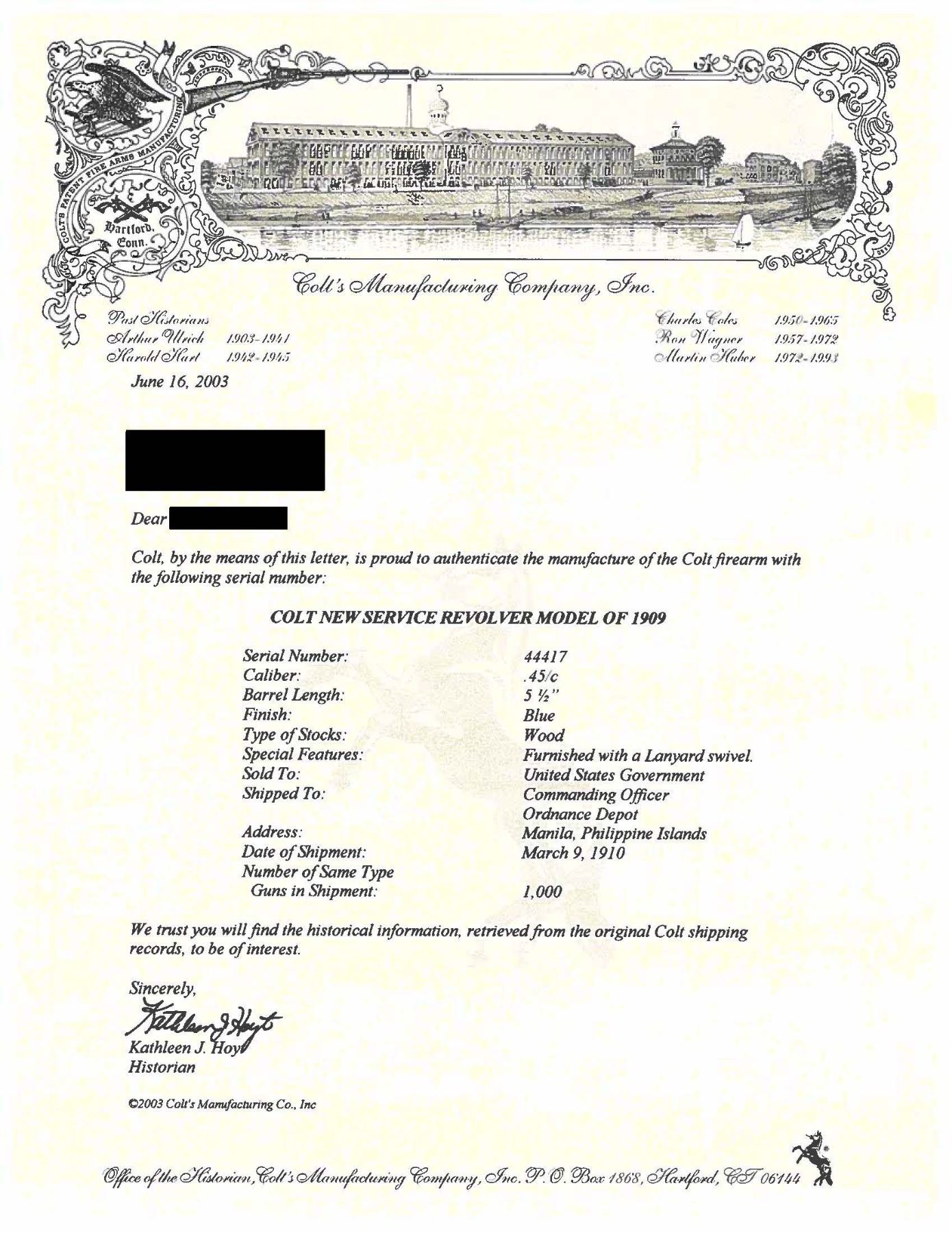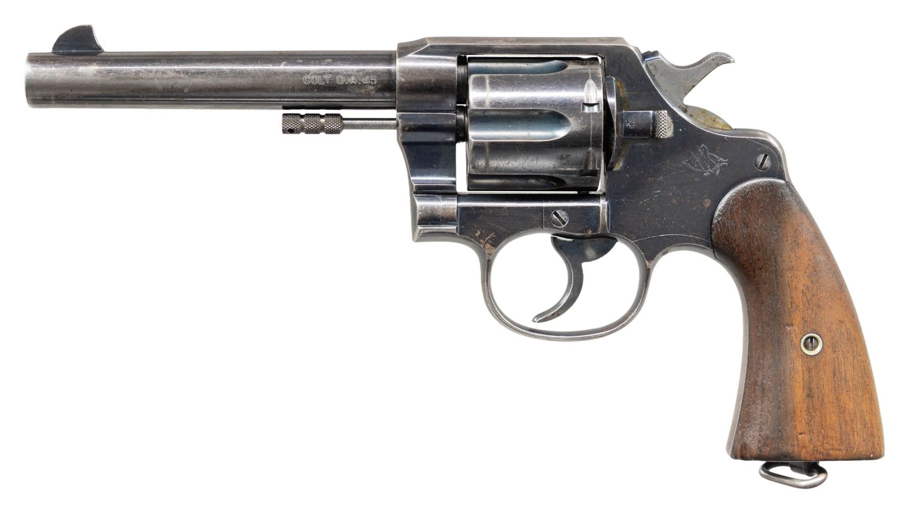 DOUBLE ACTION REVOLVER WITH FACTORY LETTER. Cal. 45 LC. S# 44417. Bbl. 5 1/2". U.S. Model of 1909 double action revolver mfg. by Colt. Left side of the bbl. is marked "COLT D.A. 45", with Colt's 2-line mfg. and patent information marked across the top, and "UNITED STATES PROPERTY" marked on the underside. Left side of the frame is marked with the Rampant Colt intertwined with a stylized "C" logo, with "U.S./ ARMY/ MODEL/ 1909/ No/ 44/ 417" marked on the butt. Right side of the frame is marked with a Rinaldo A. Carr "R.A.C." inspector proof (repeated on cyl. and bbl.), as well as a Walter C. Penfield "WCP" cartouche. Metal components exhibit a blue finish overall, save for on the sides of the hammer, which are polished in-the-white. Frame is mounted with 2-piece plain wood grips, (each marked with an "R.A.C." proof on the butt), and features a lanyard swivel and ring on the butt. Standard clipped blade front sight and frame notched rear sight. All serialized parts are matching and include the frame (interior and butt), as well as the cyl. crane. UNATTACHED ACCESSORIES: Colt factory letter stating: "Serial Number: 44417/ Caliber: .45/c/ Barrel Length: 5 1/2"/ Finish: Blue/ Type of Stocks: Wood/ Special Features: Furnished with a Lanyard swivel/ Sold To: United States Government/ Shipped To: Commanding Officer/ Ordnance Depot/ Address: Manila, Philippine Islands/ Date of Shipment: March 9, 1910/ Number of Same Type Guns in Shipment: 1,000". CONDITION: metal components retain large amounts of their original factory blue finish, exhibiting areas of wear and thinning that are fading to gray patina, scattered superficial handling marks, as well as scattered spots of light surface oxidation and pitting overall. Sides of hammer exhibit scattered spots of age related discoloration. Near mirror bore, exhibiting some very light pitting, while retaining strong rifling throughout. Proper manual mechanics. Grips show some scattered marks, impressions, and small chips, but otherwise remain sound. PROVENANCE: From the Buckstix Collection. (25-6346/MLW). CURIO. $1,500-2,250.